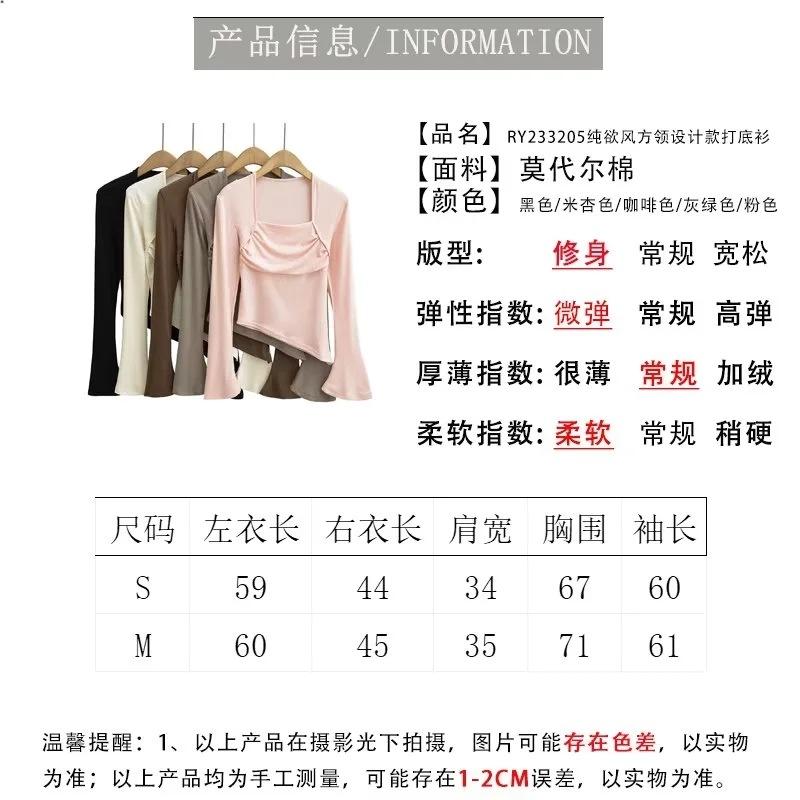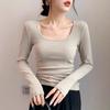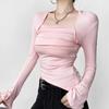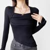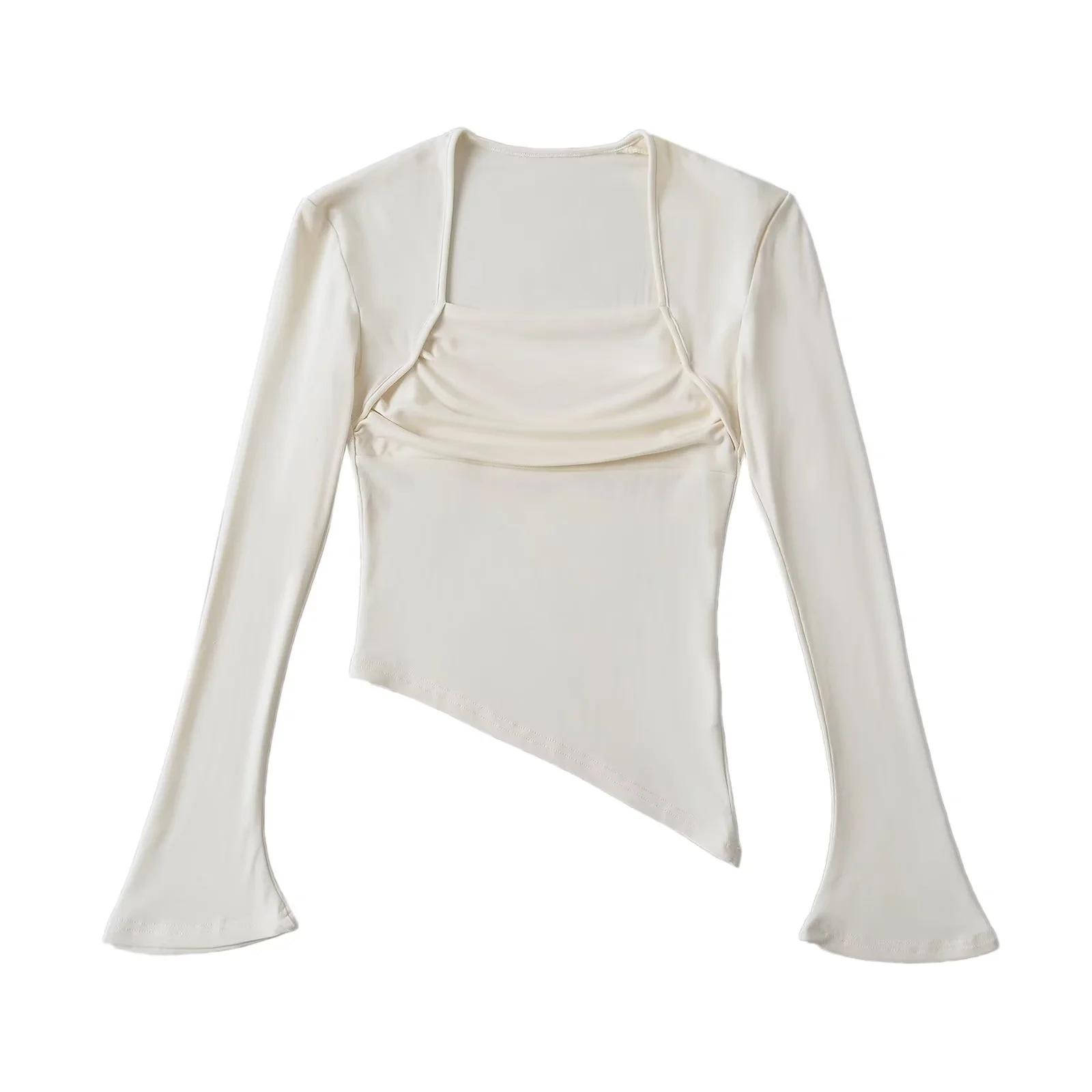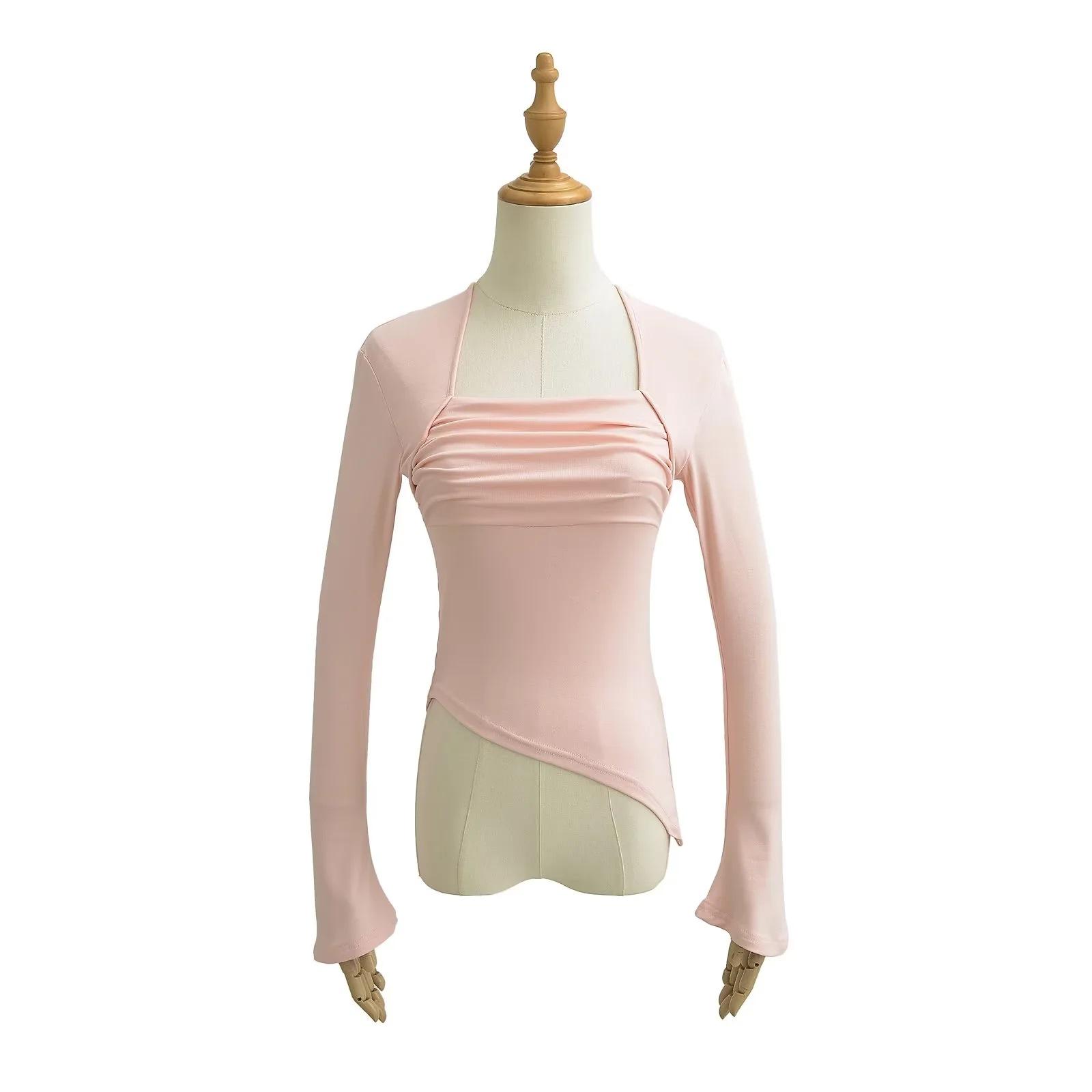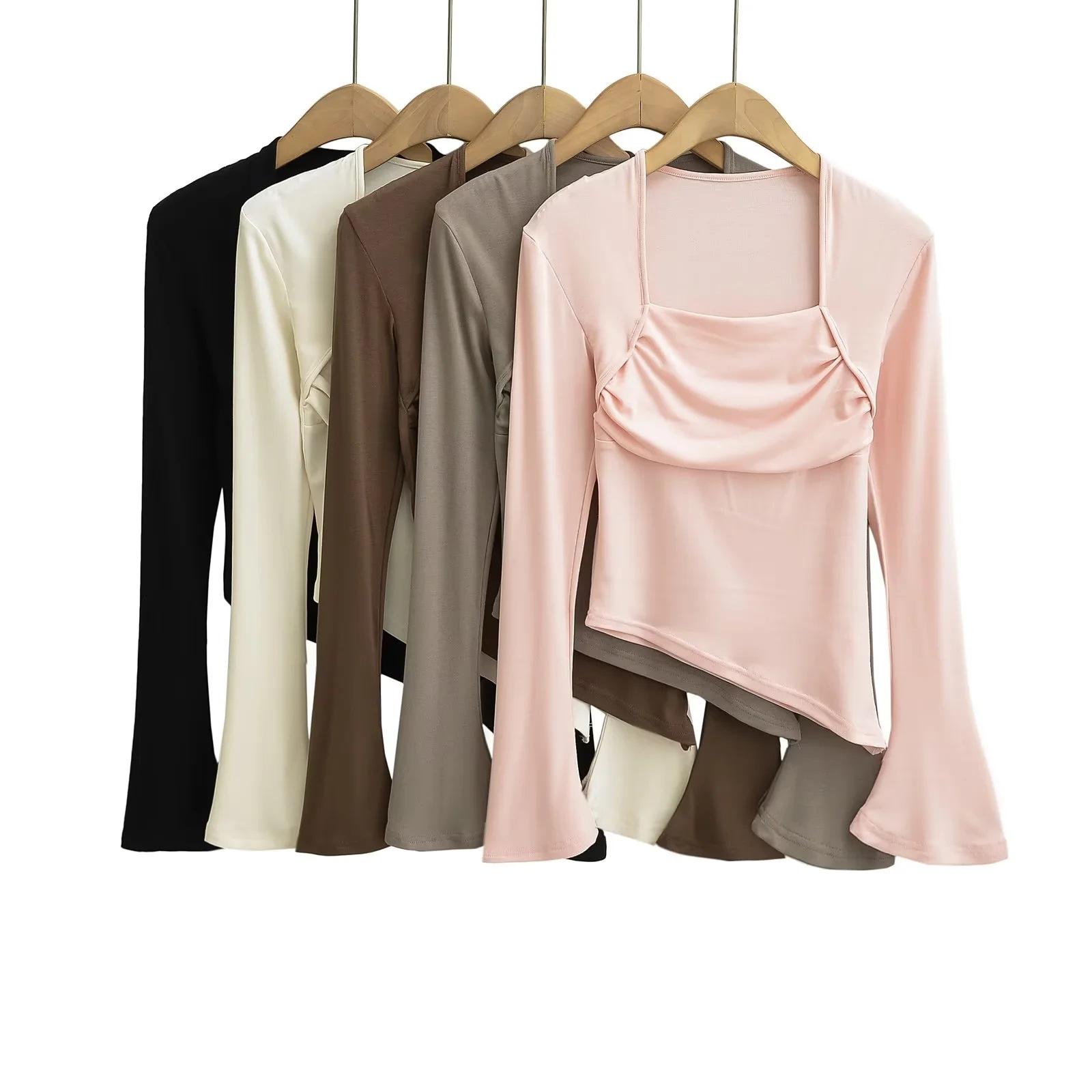 Deseo Puro Cuello Cuadrado Plisado Camiseta Base Top de Mujer 2024 Nuevo Diseño Nicho de Mujer Primavera y Otoño Camiseta de Manga Larga