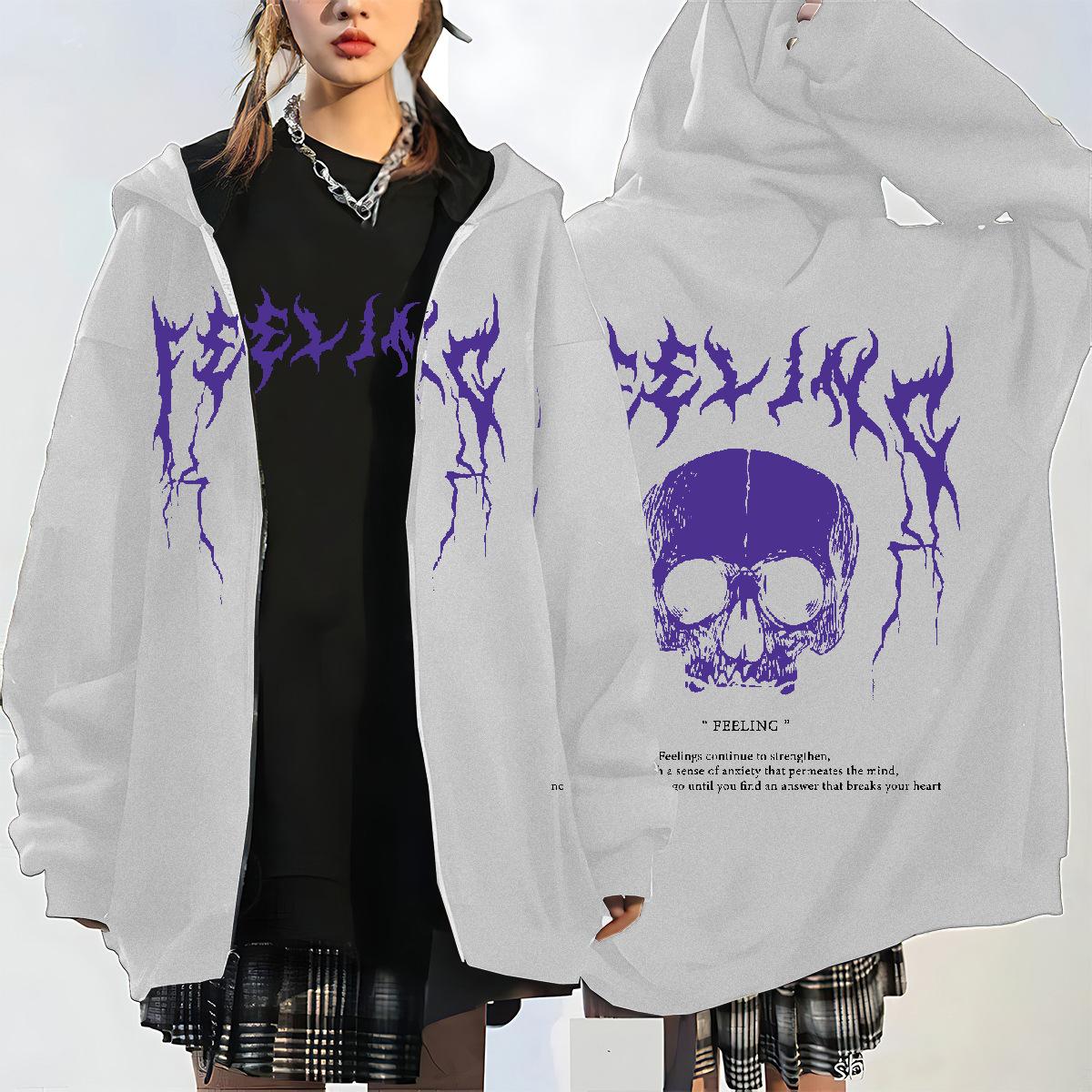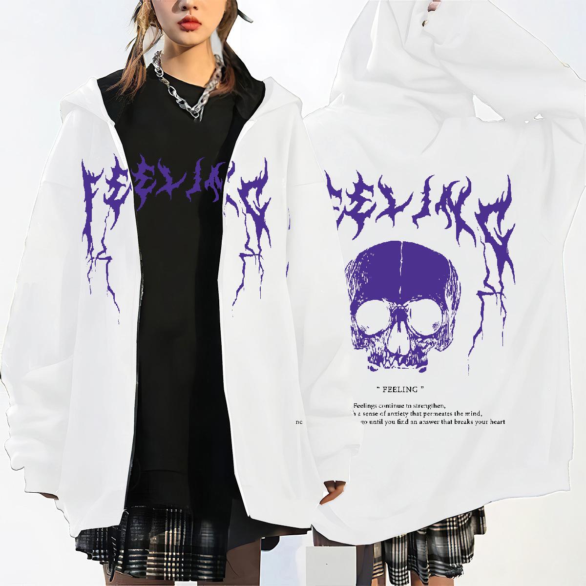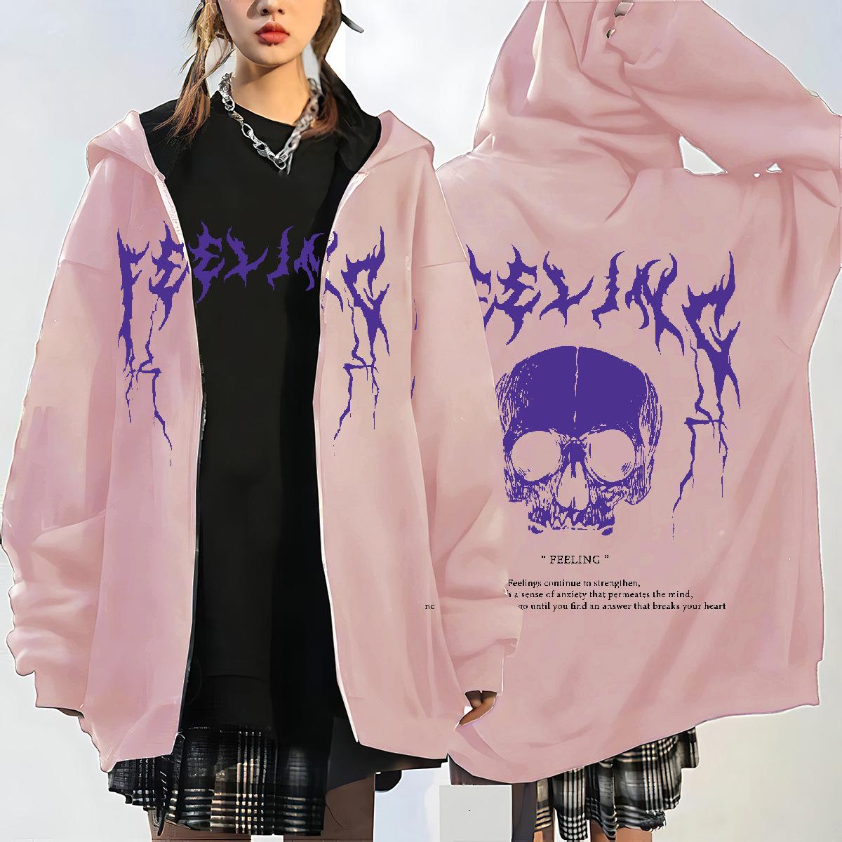 Nueva Llegada en stock Sudadera con Capucha y Cremallera de Calavera y Rayo para Mujer Estilo Coreano con Forro Polar Gruesa Suelta Cárdigan Deportivo para Mujer