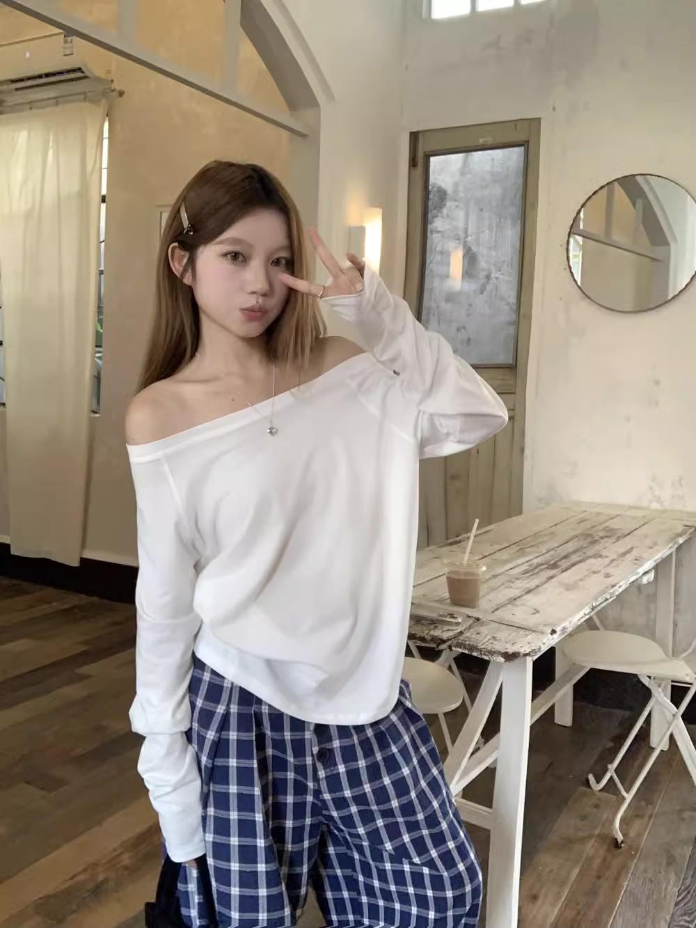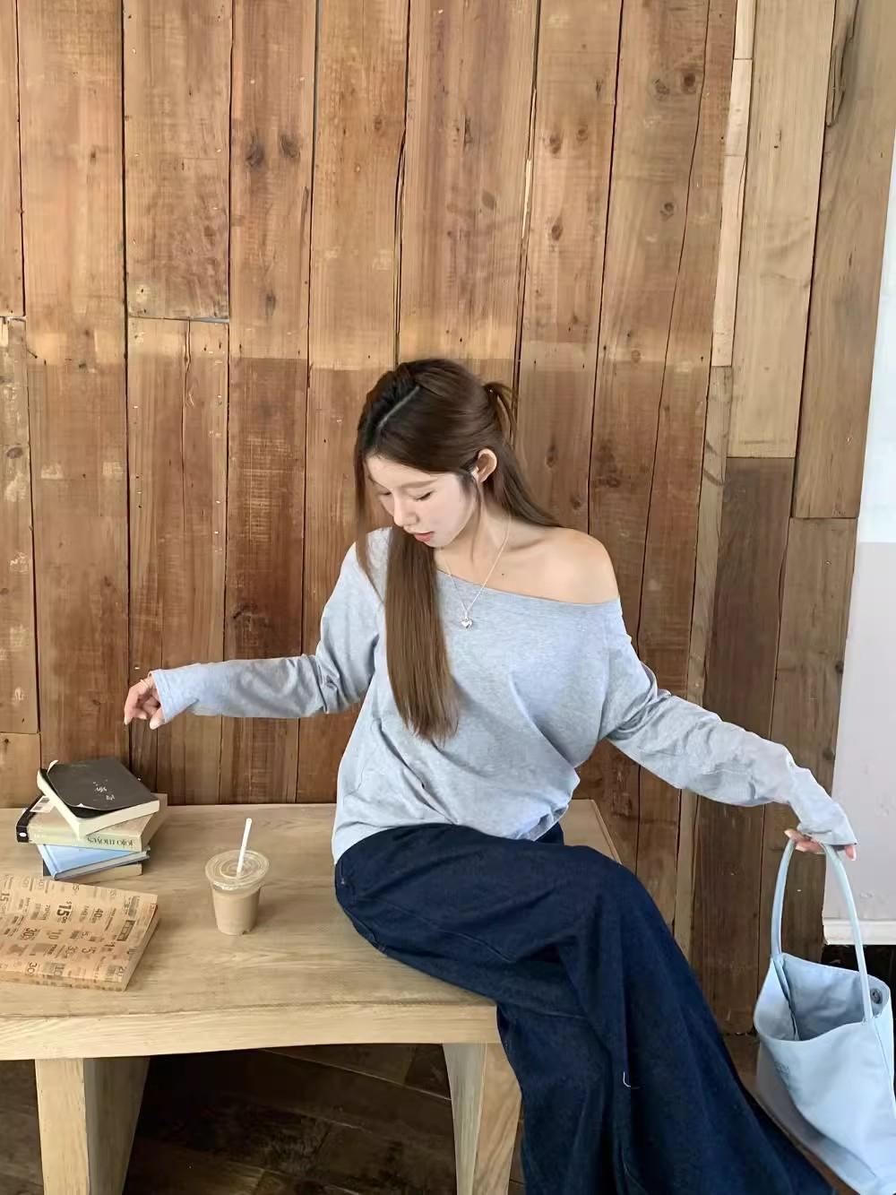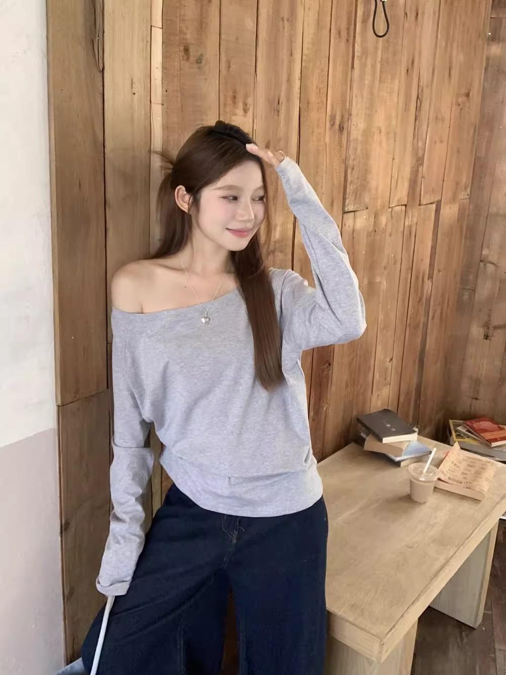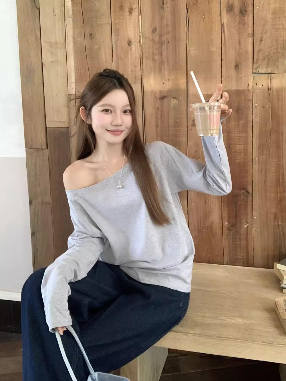 Camiseta de hombros inclinados para mujer, primavera y otoño, nuevo estilo coreano, camisa retro con hombros descubiertos, camisa holgada para uso exterior