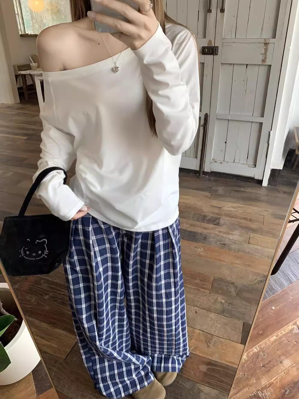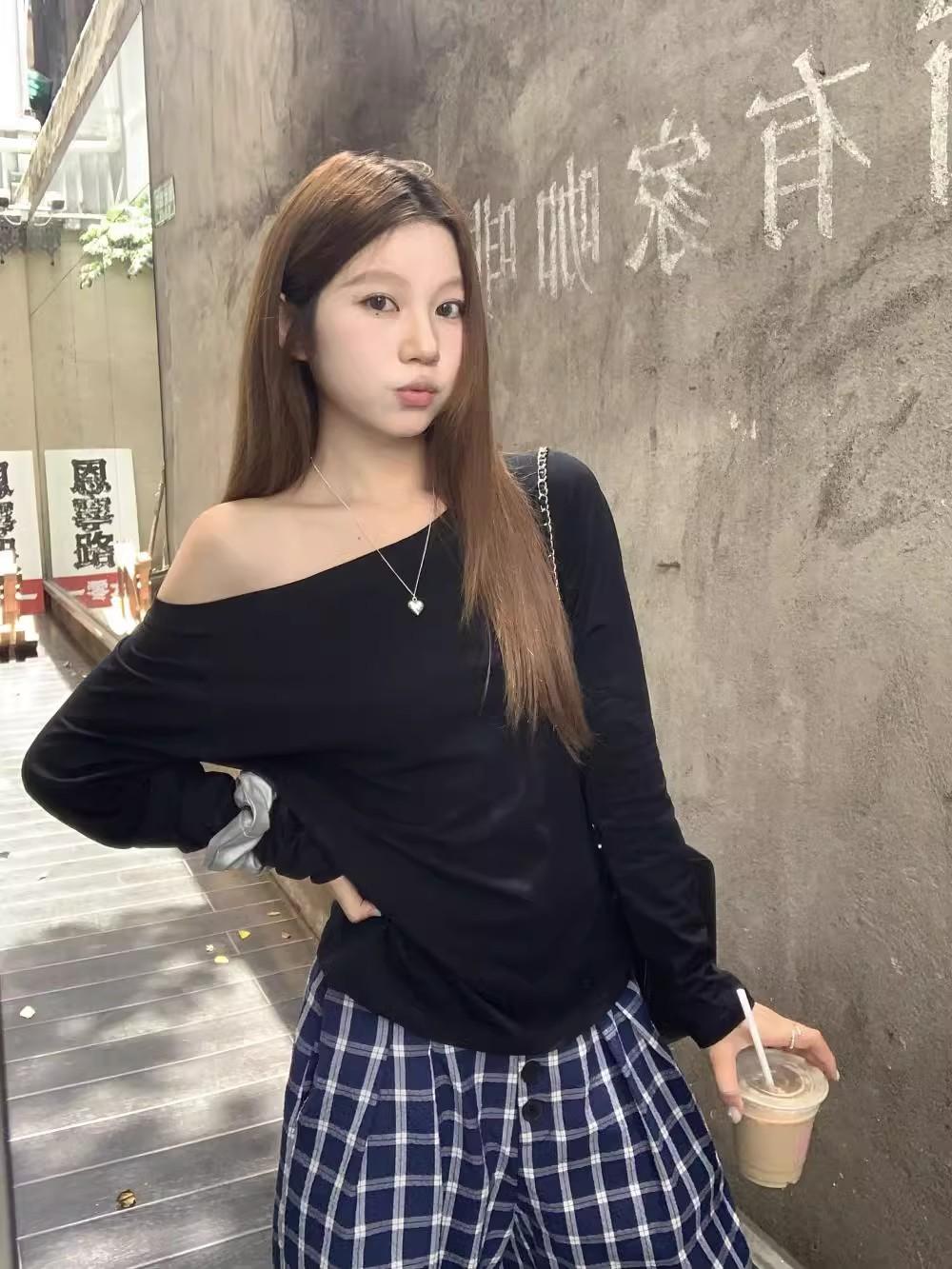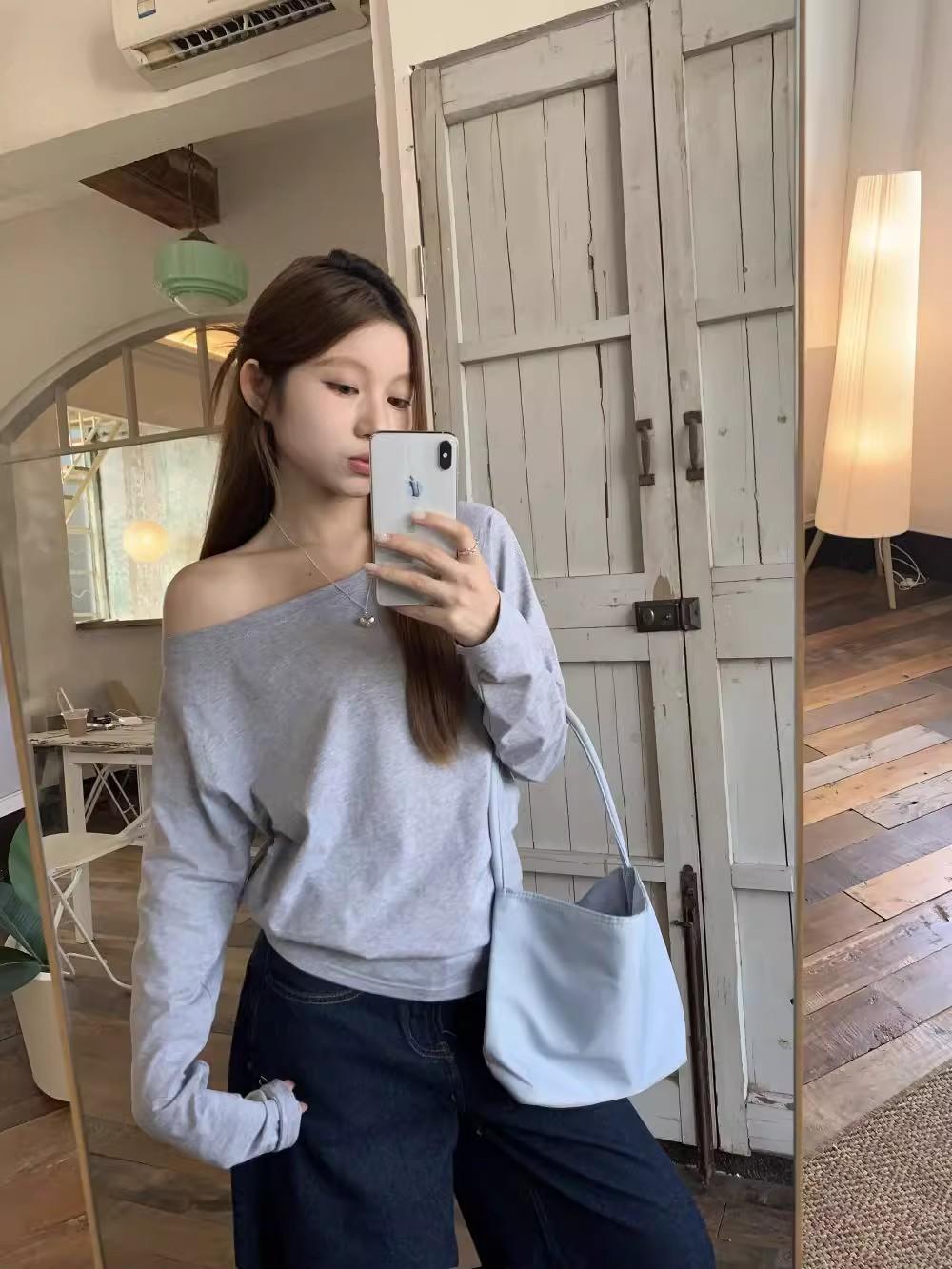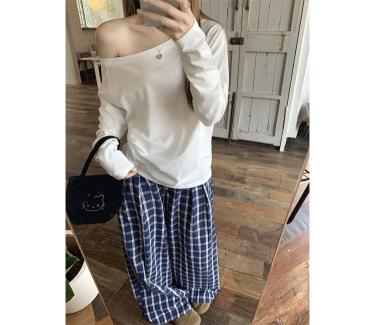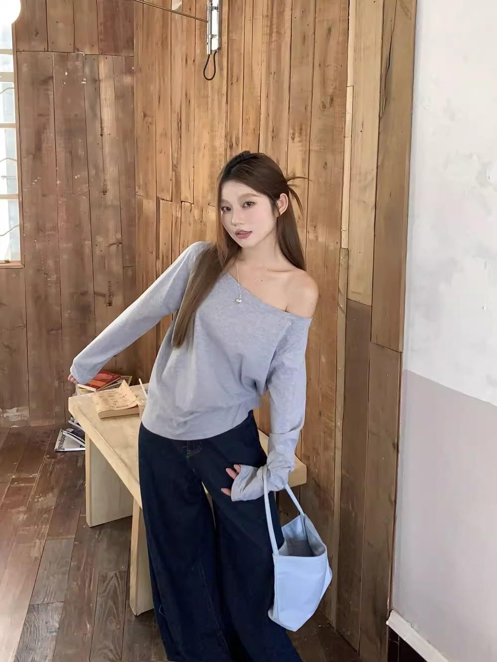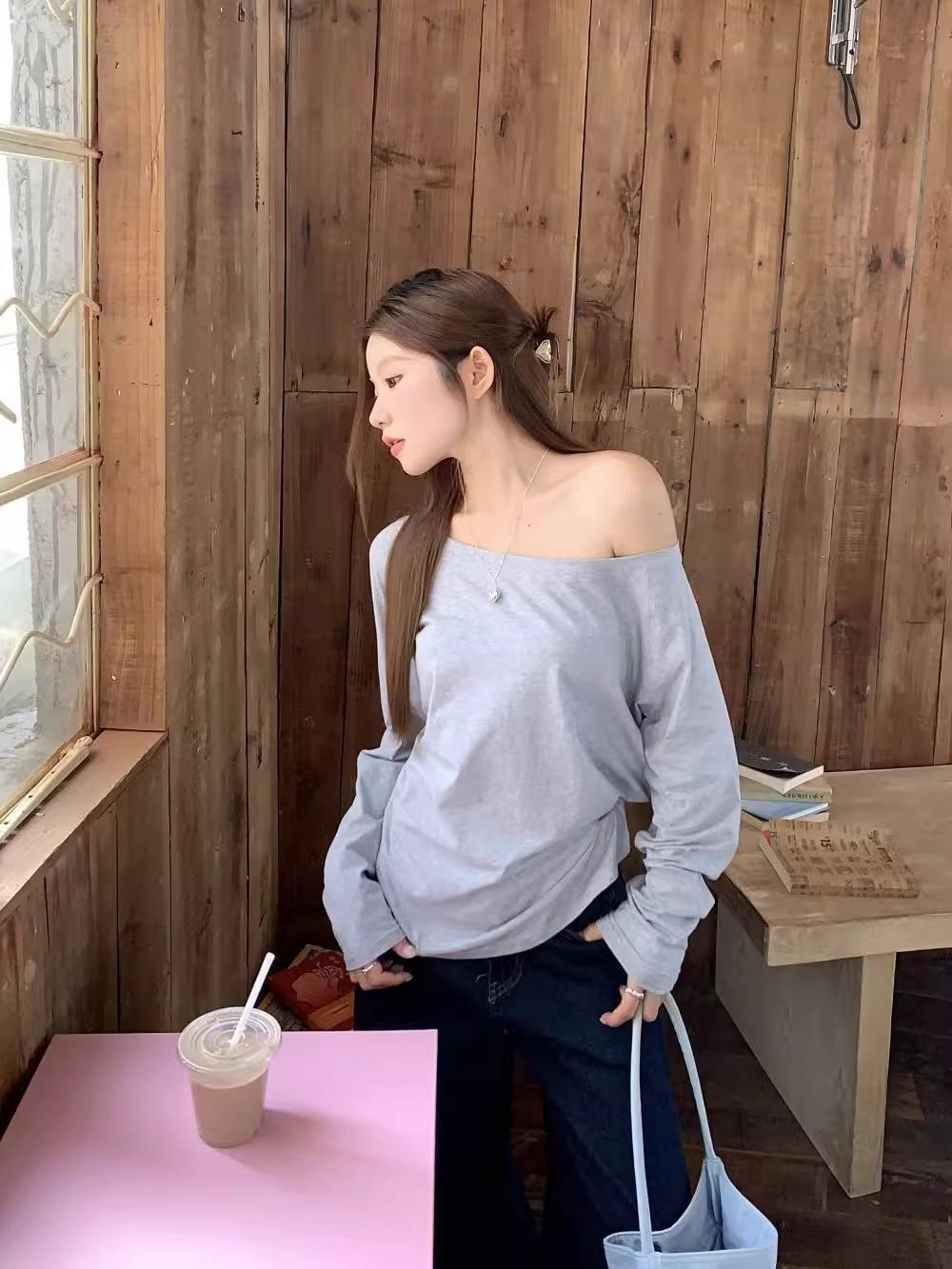 Camiseta de hombros inclinados para mujer, primavera y otoño, nuevo estilo coreano, camisa retro con hombros descubiertos, camisa holgada para uso exterior