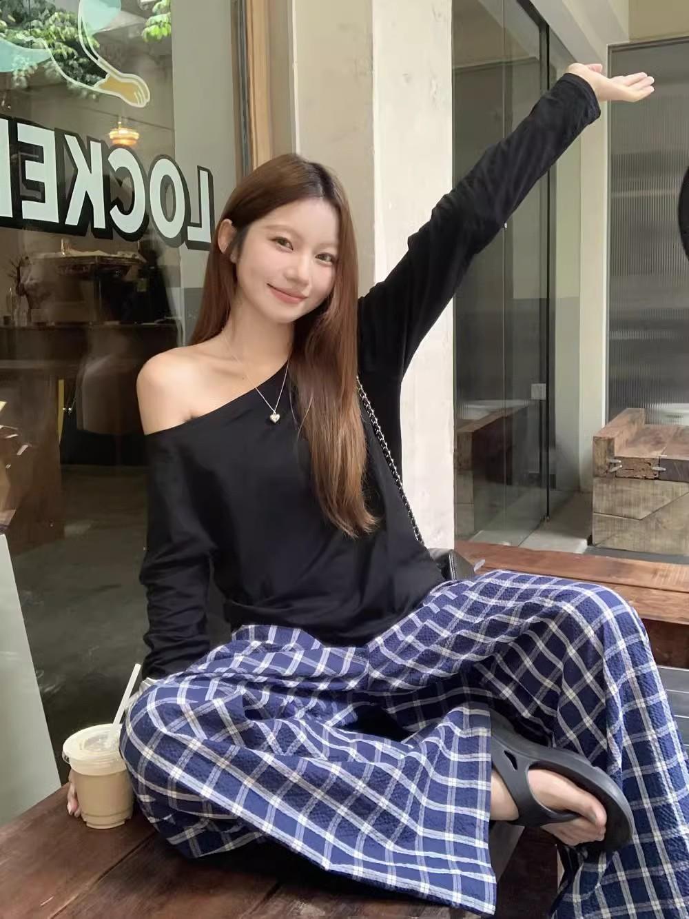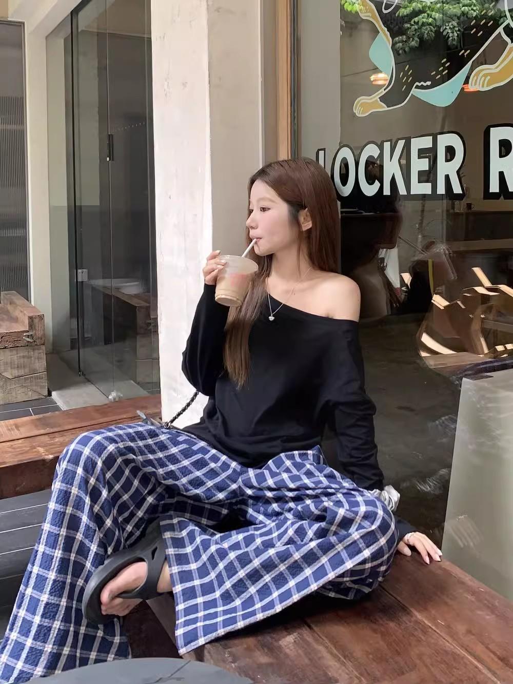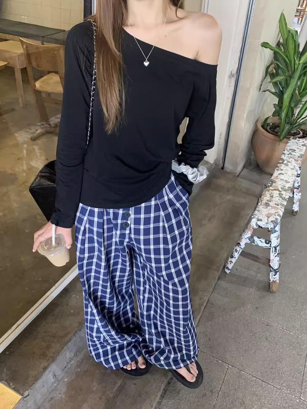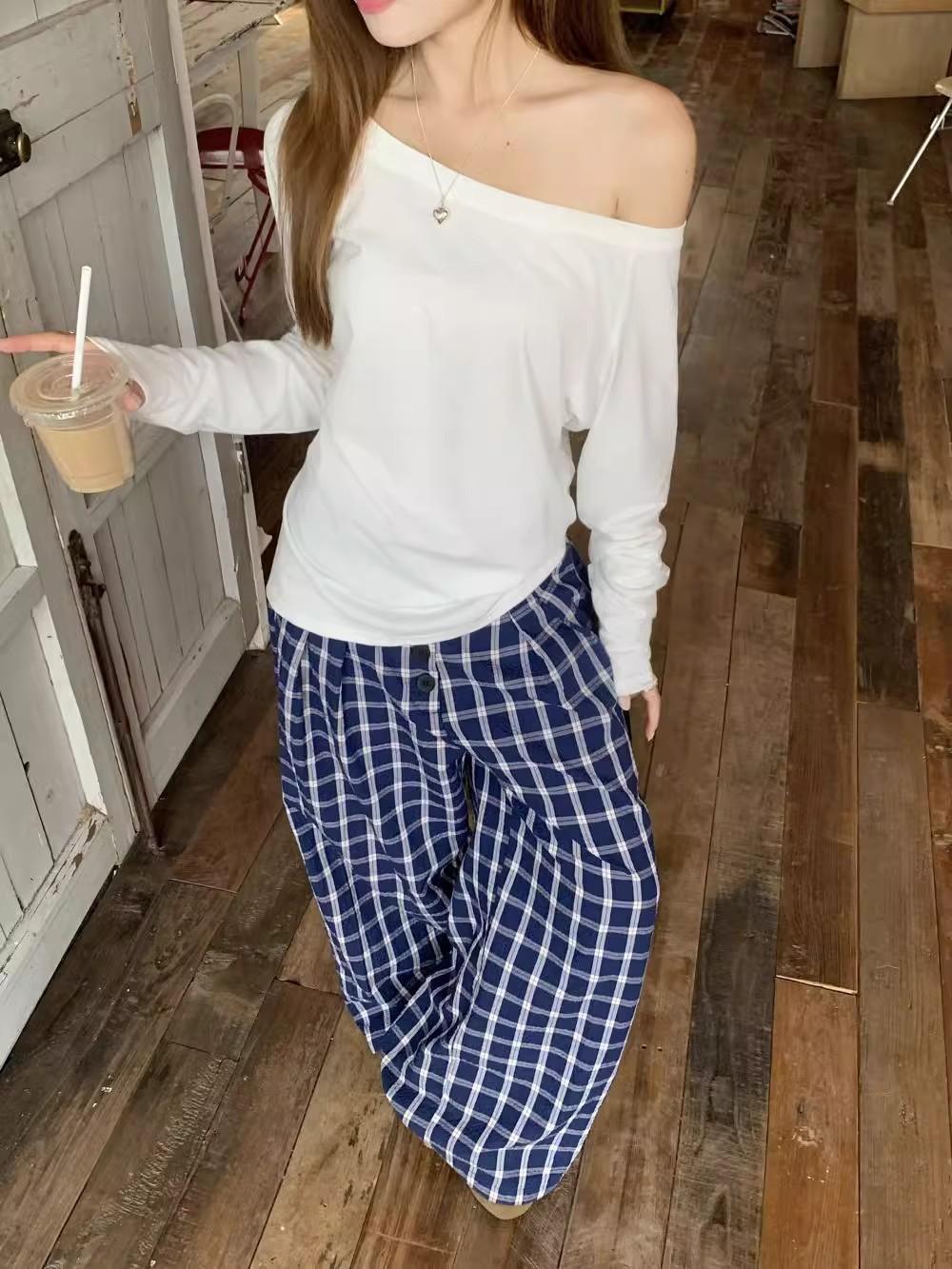 Camiseta de hombros inclinados para mujer, primavera y otoño, nuevo estilo coreano, camisa retro con hombros descubiertos, camisa holgada para uso exterior