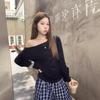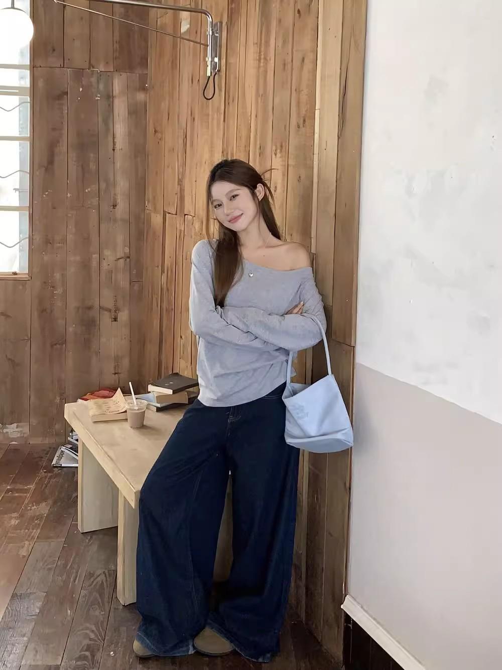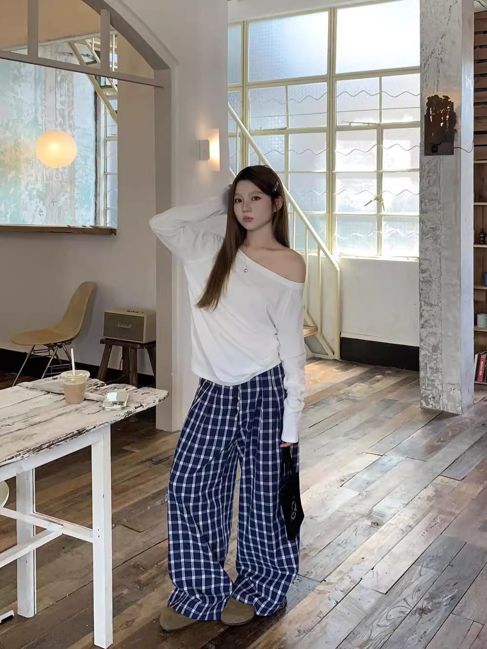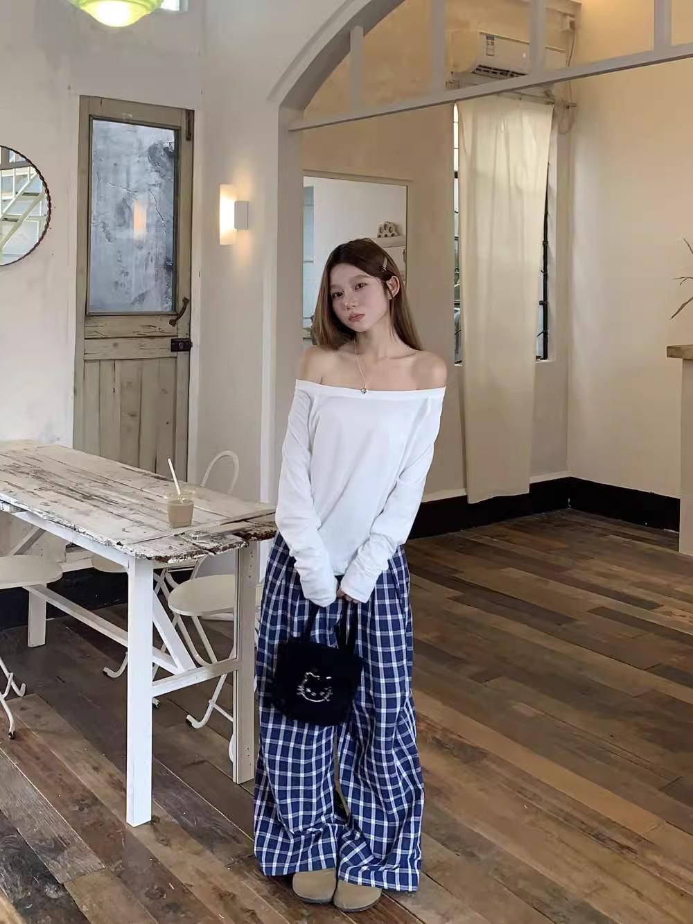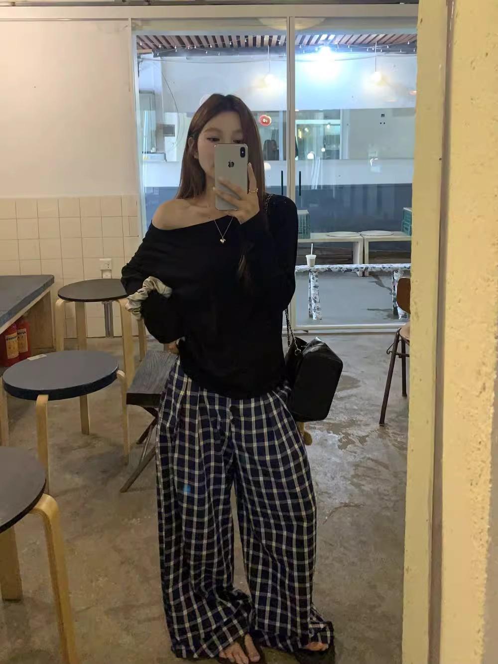 Camiseta de hombros inclinados para mujer, primavera y otoño, nuevo estilo coreano, camisa retro con hombros descubiertos, camisa holgada para uso exterior