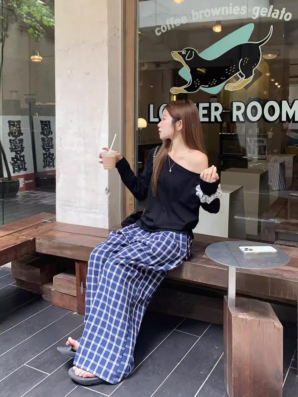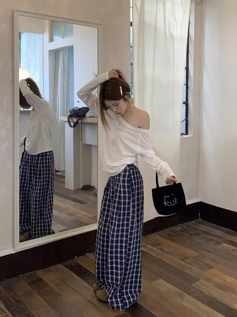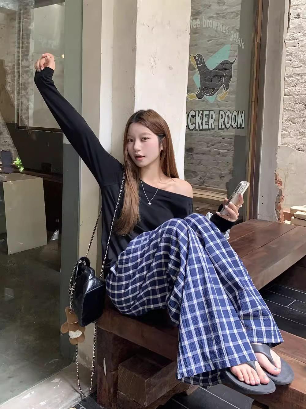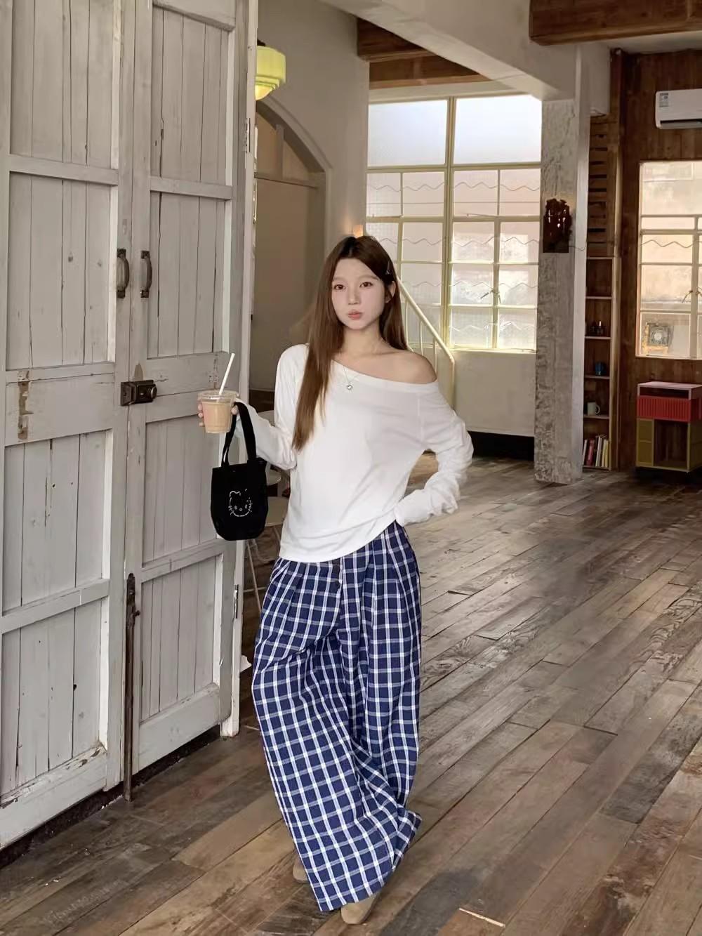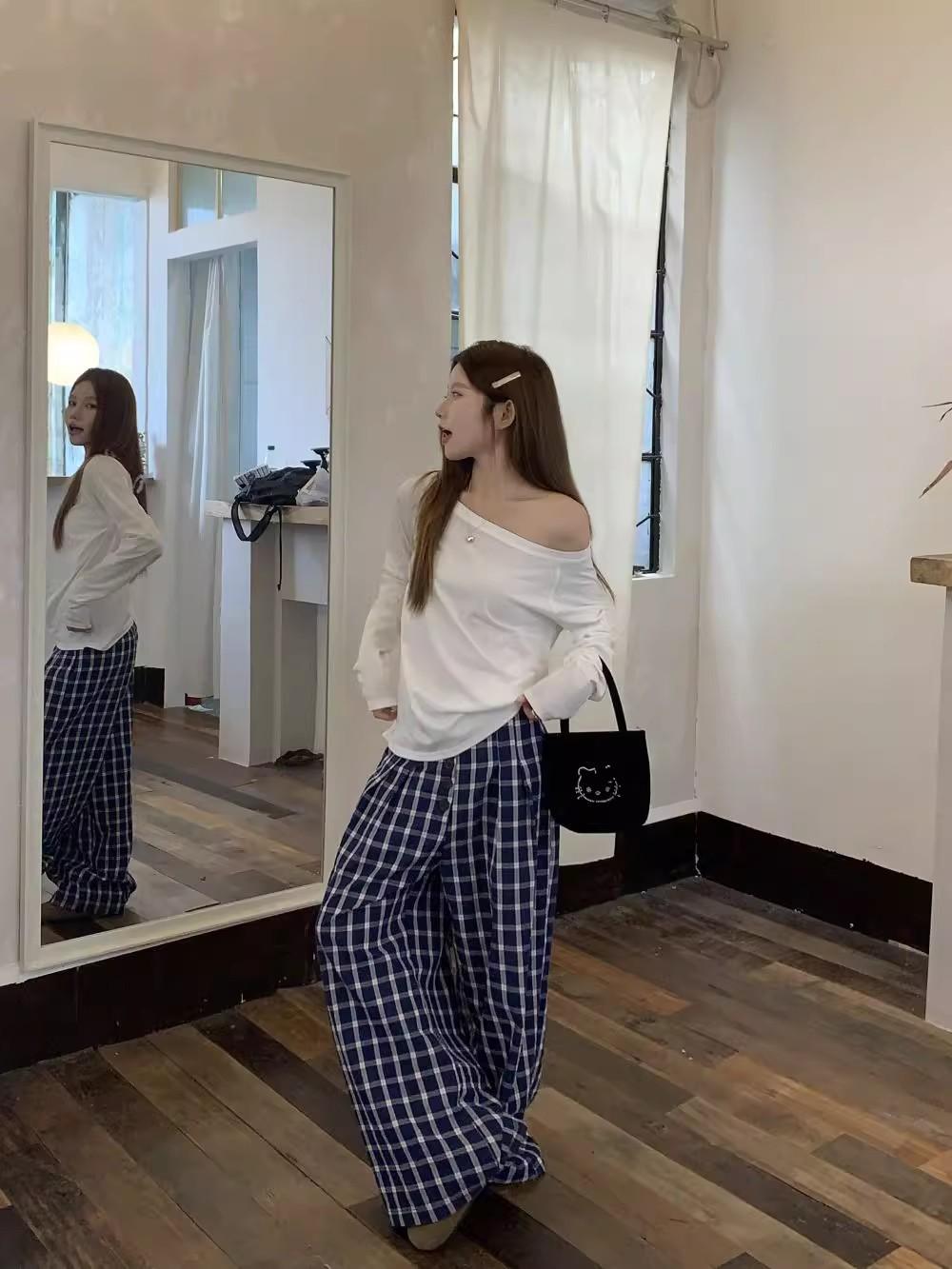 Camiseta de hombros inclinados para mujer, primavera y otoño, nuevo estilo coreano, camisa retro con hombros descubiertos, camisa holgada para uso exterior