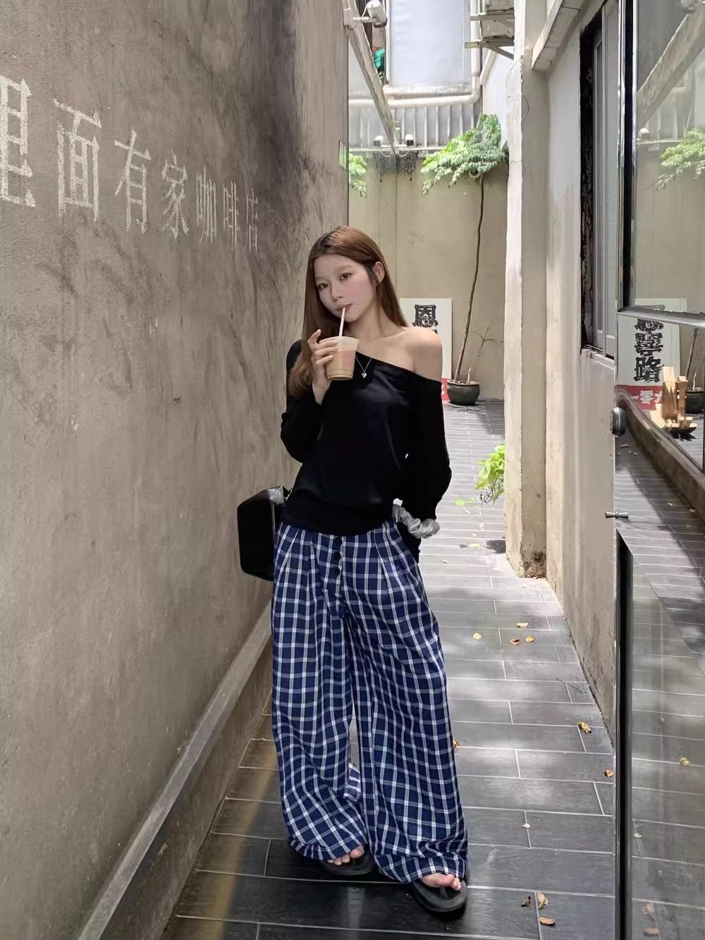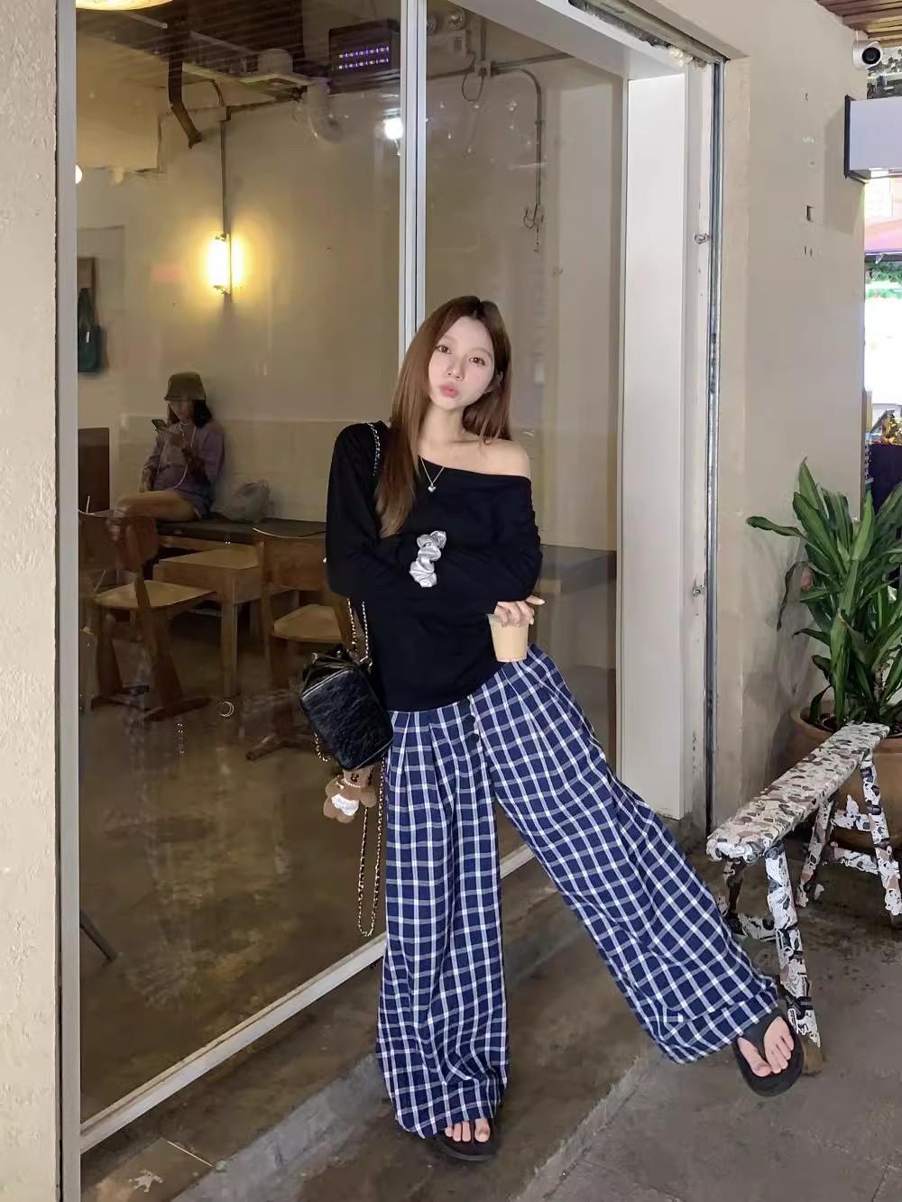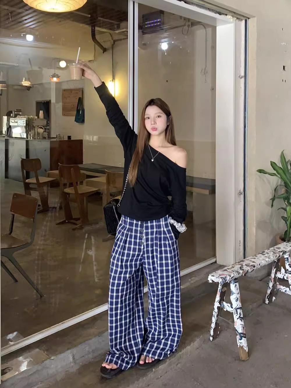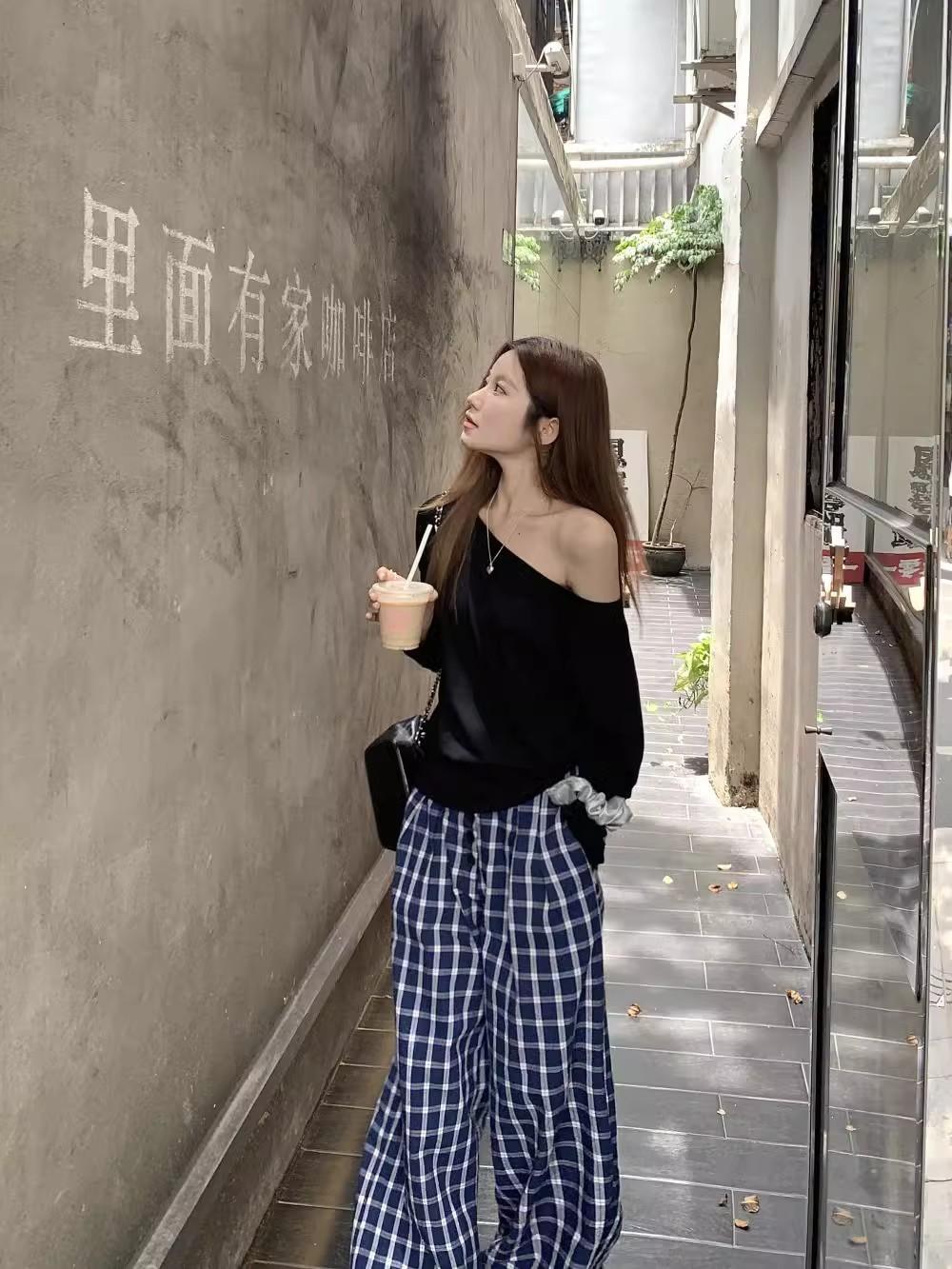 Camiseta de hombros inclinados para mujer, primavera y otoño, nuevo estilo coreano, camisa retro con hombros descubiertos, camisa holgada para uso exterior