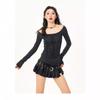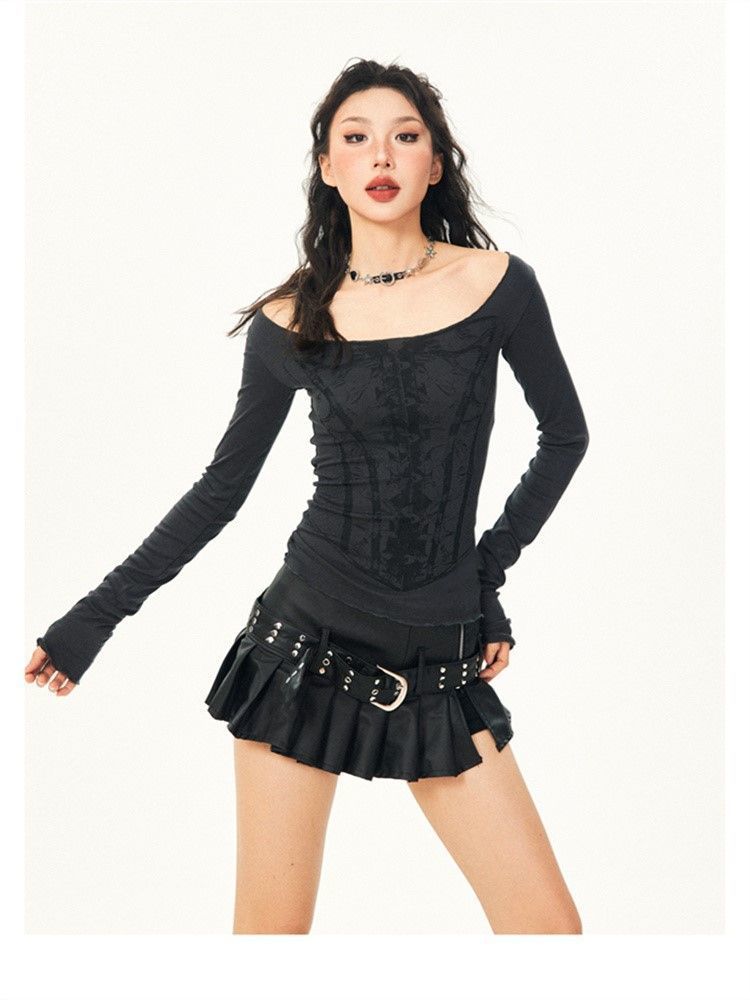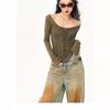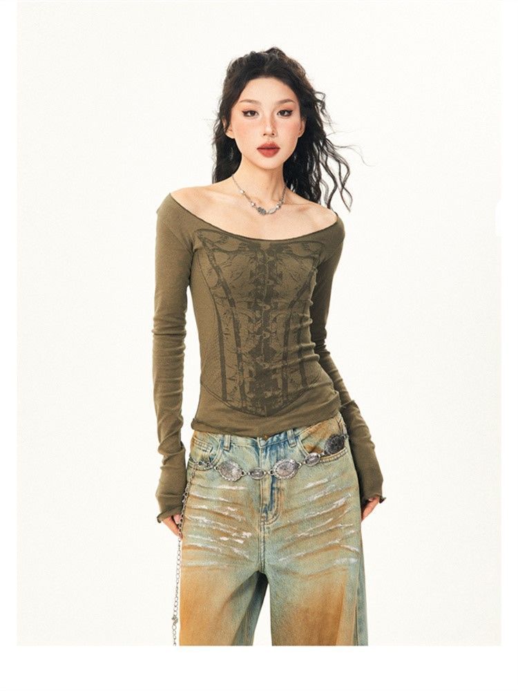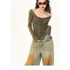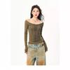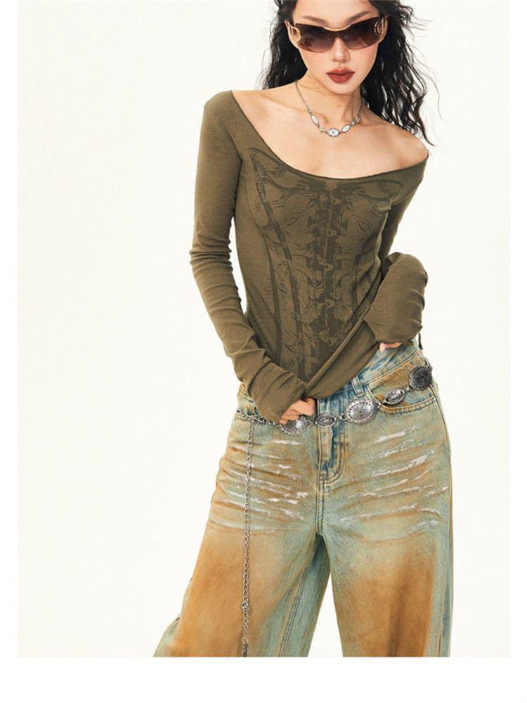 [Diseñador] Camiseta Base de Cuello U Grande de Pure Spice Girl para Mujer, Estilo Americano, Ajustada, Adelgazante, Hermosa, de Manga Larga