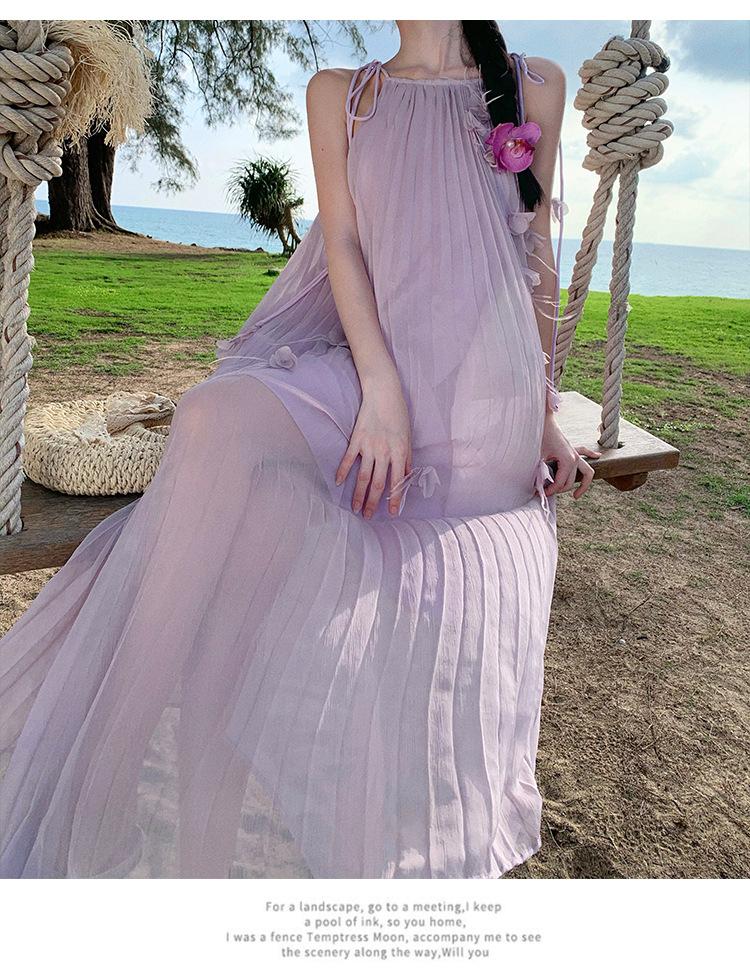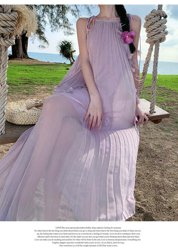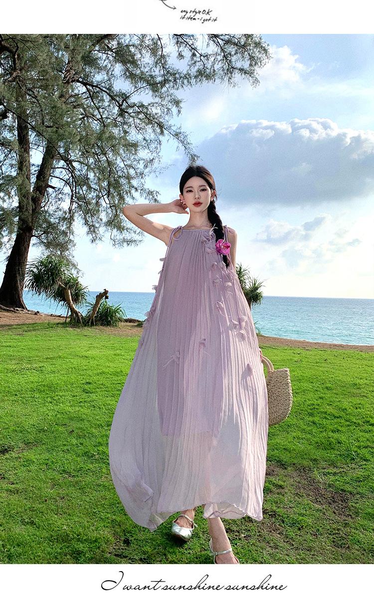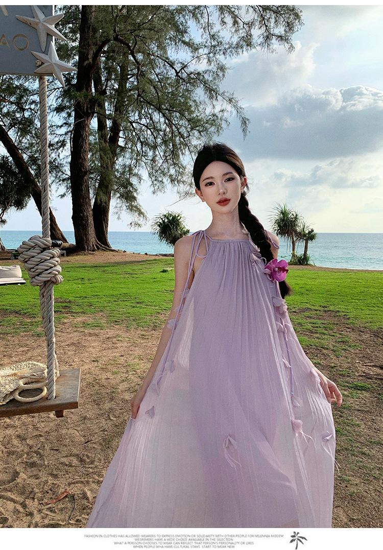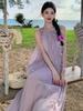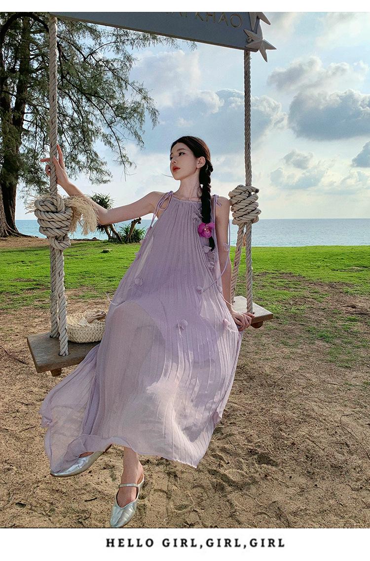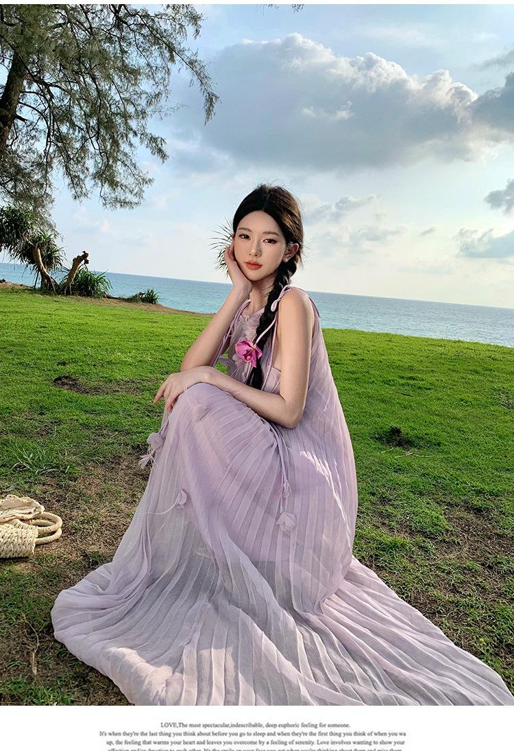 Vestido morado con tirantes y flores de Pure Desire, vestido largo para vacaciones en la playa, vestido playero de verano, elegante falda de hada sin mangas