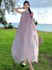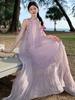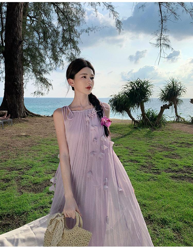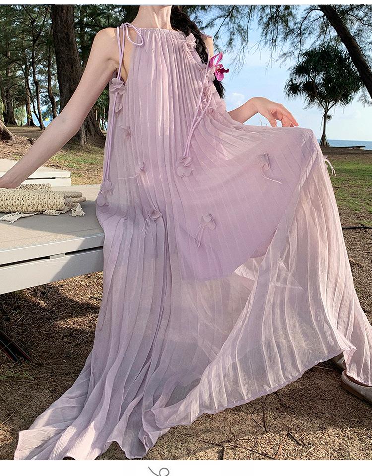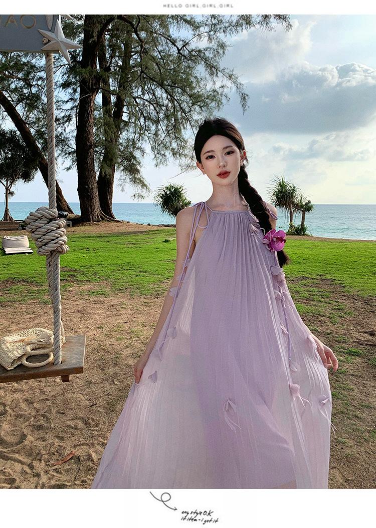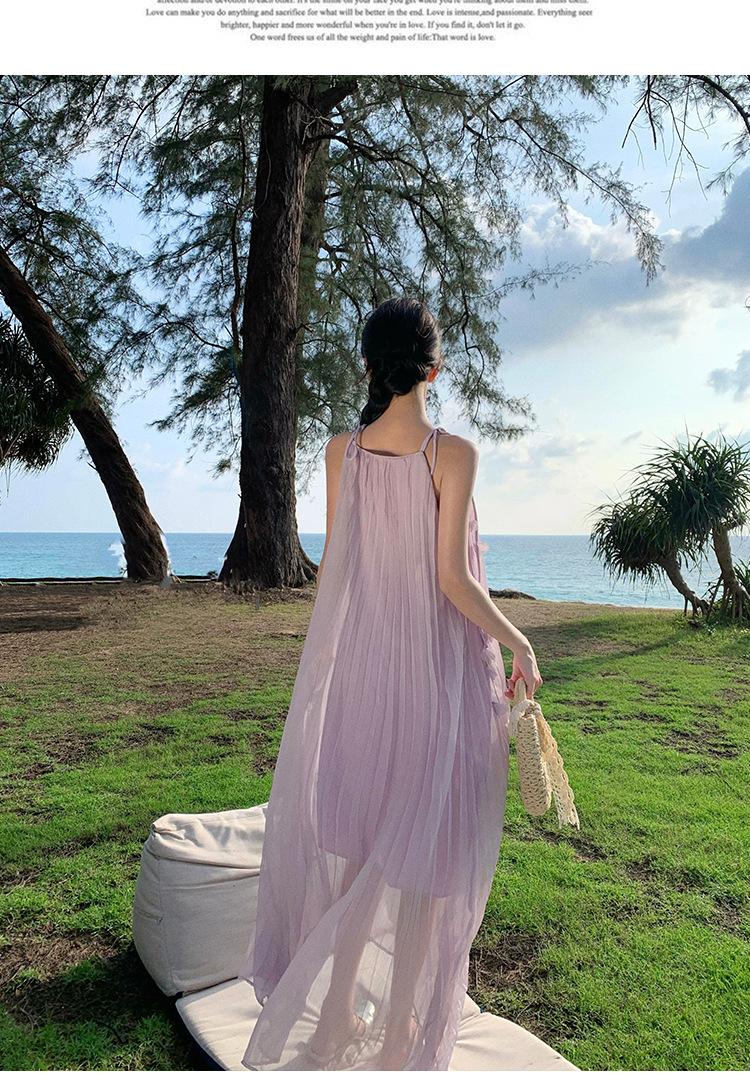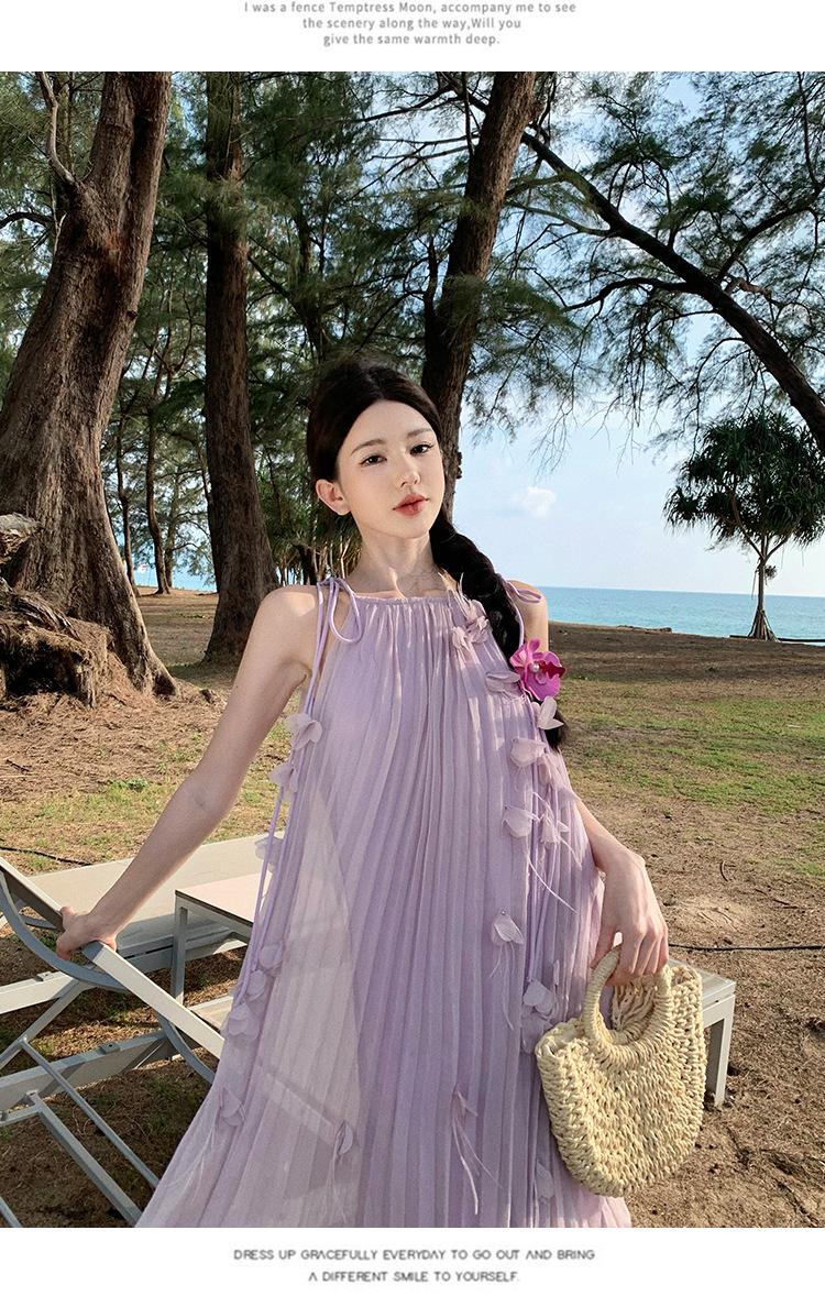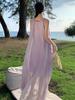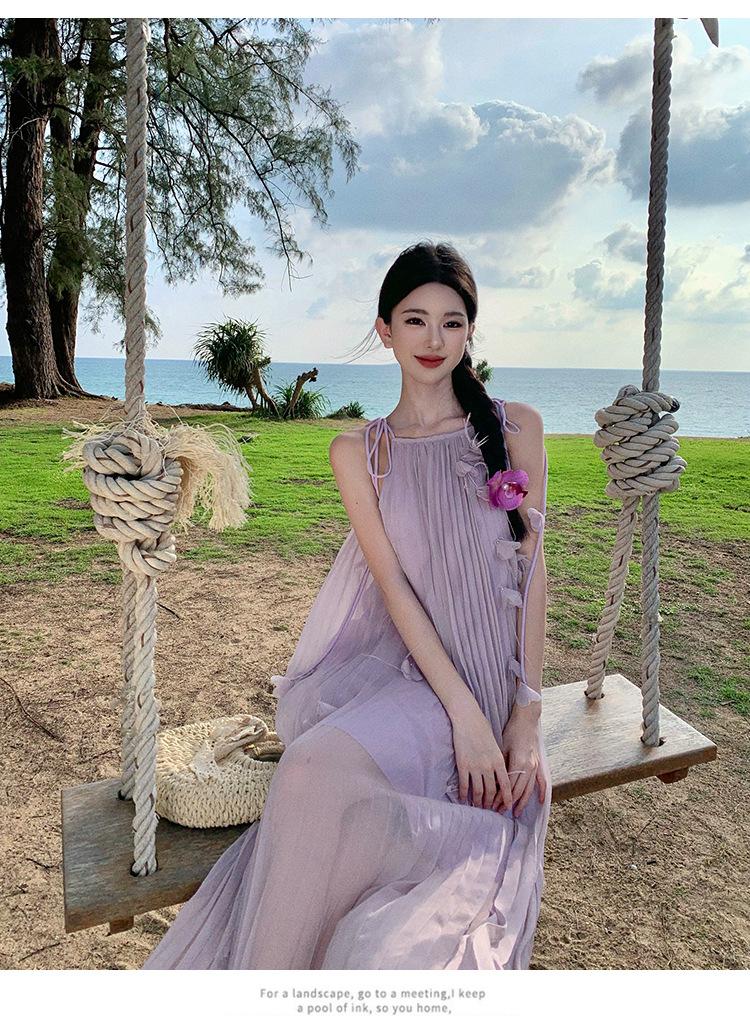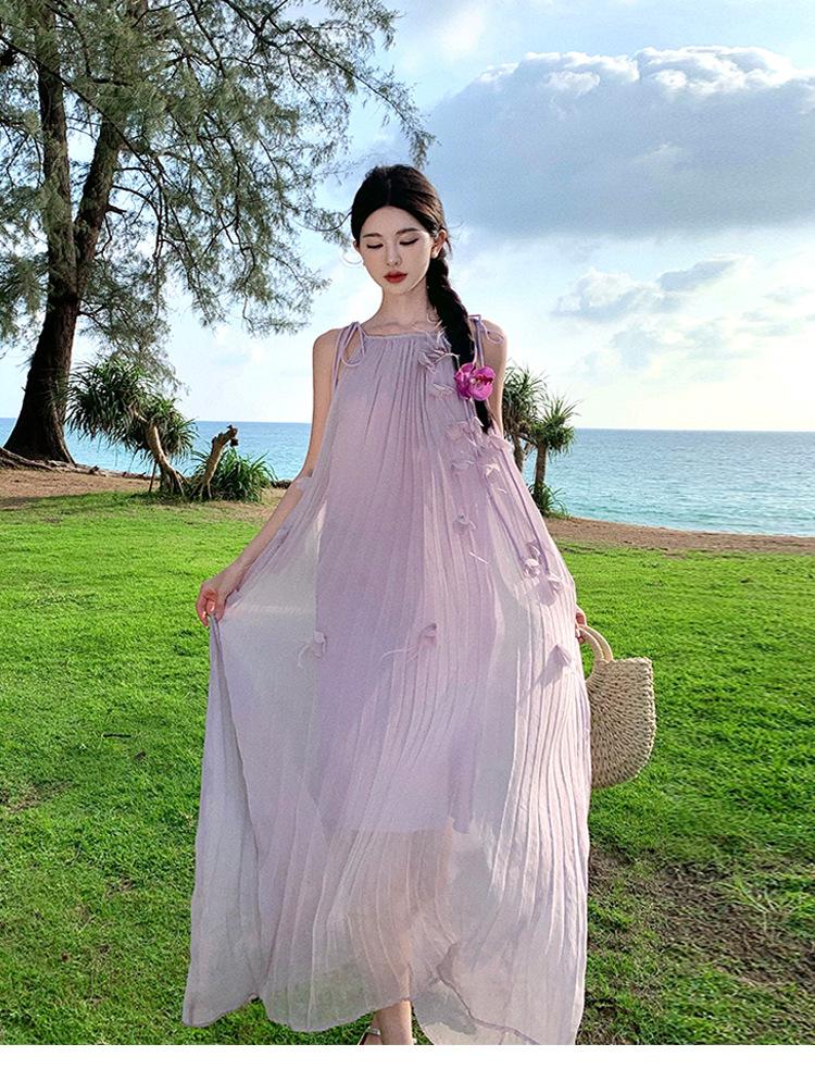 Vestido morado con tirantes y flores de Pure Desire, vestido largo para vacaciones en la playa, vestido playero de verano, elegante falda de hada sin mangas