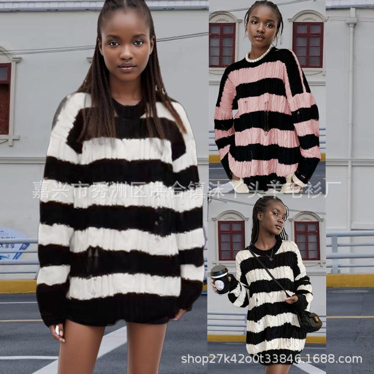 Otoño e Invierno Nuevo Suéter de Mujer de Cuello Redondo Transfronterizo Europeo y Americano Amazon Comercio Exterior Suéter Holgado de Punto Rayado Roto para Mujer