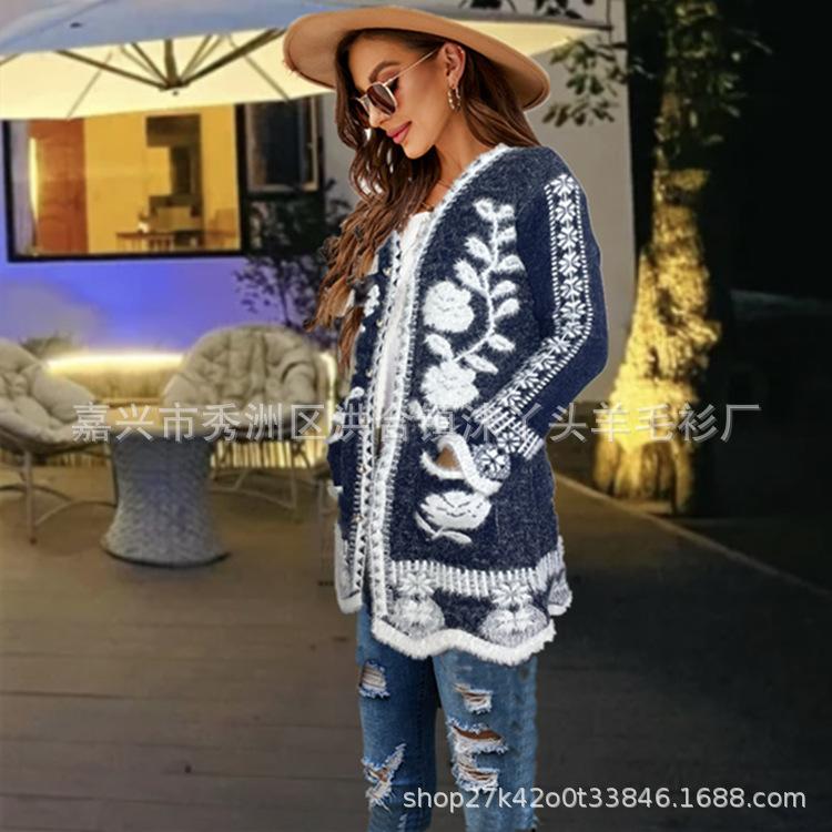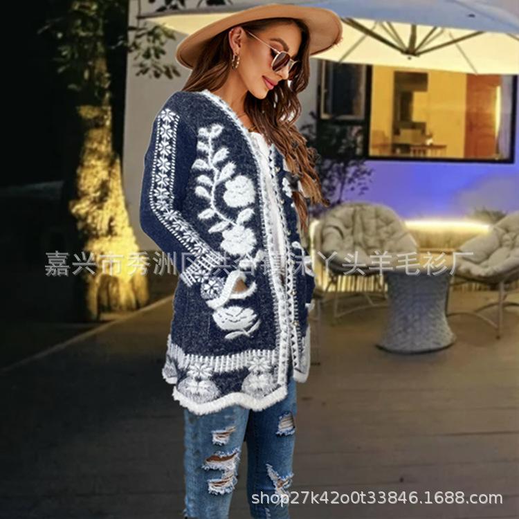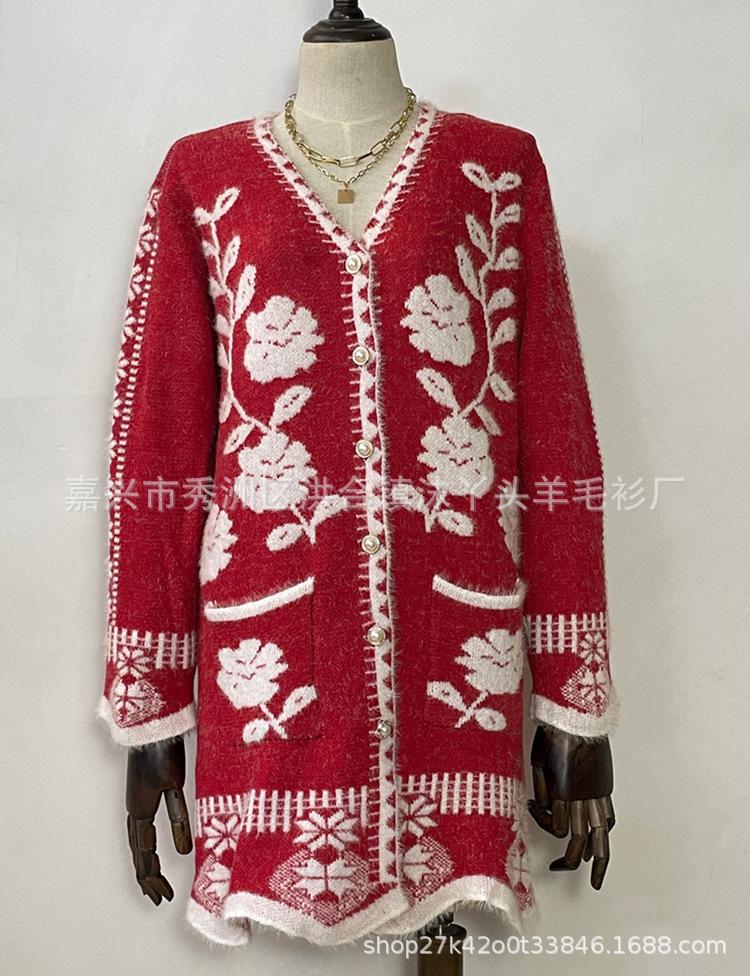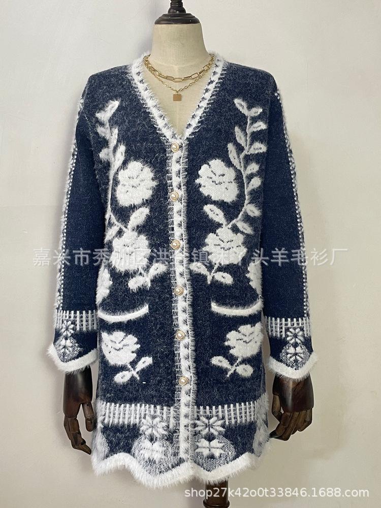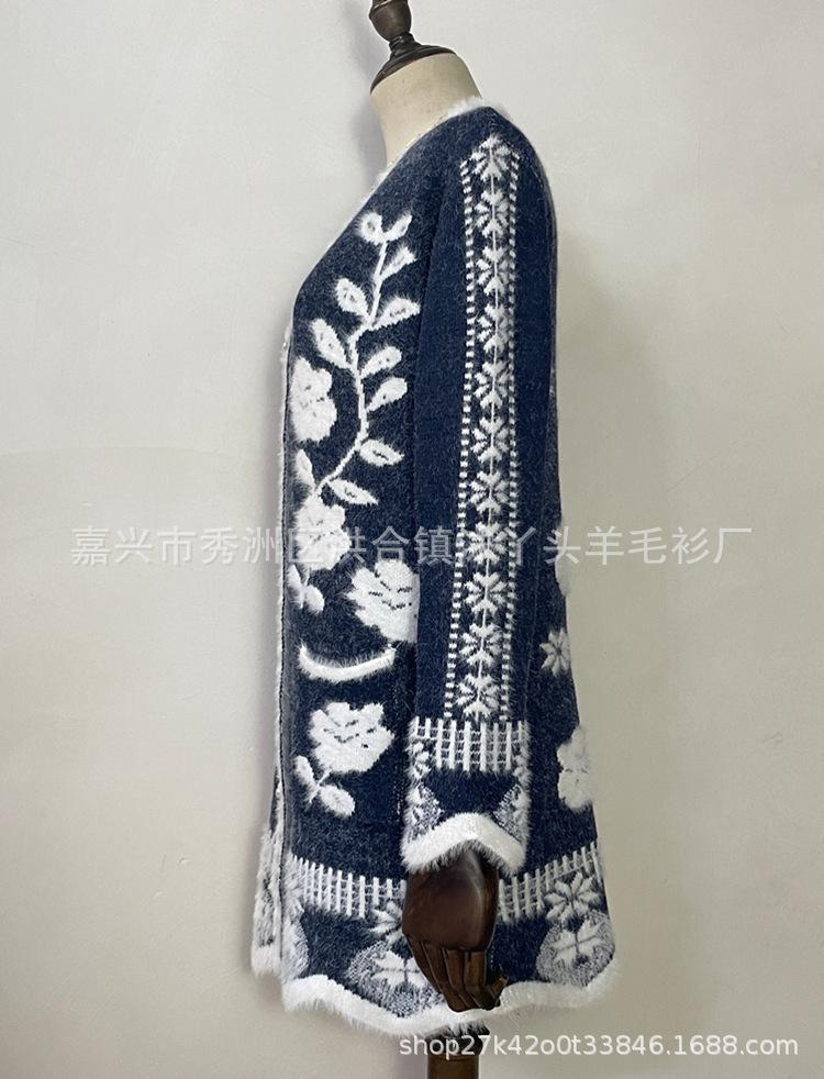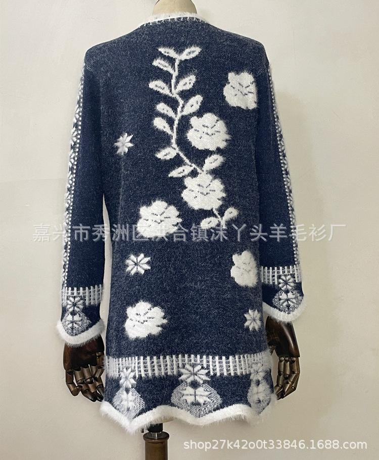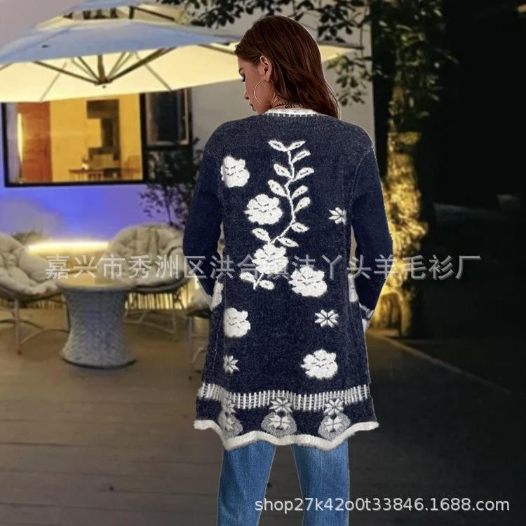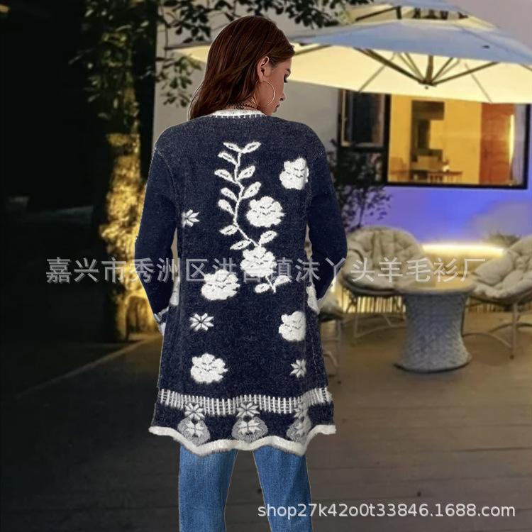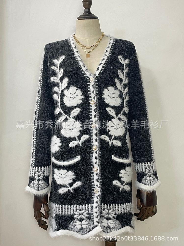 Suéter de longitud media para mujer, cárdigan de punto Jacquard de visón, nuevo, transfronterizo de comercio exterior europeo y americano para mujer