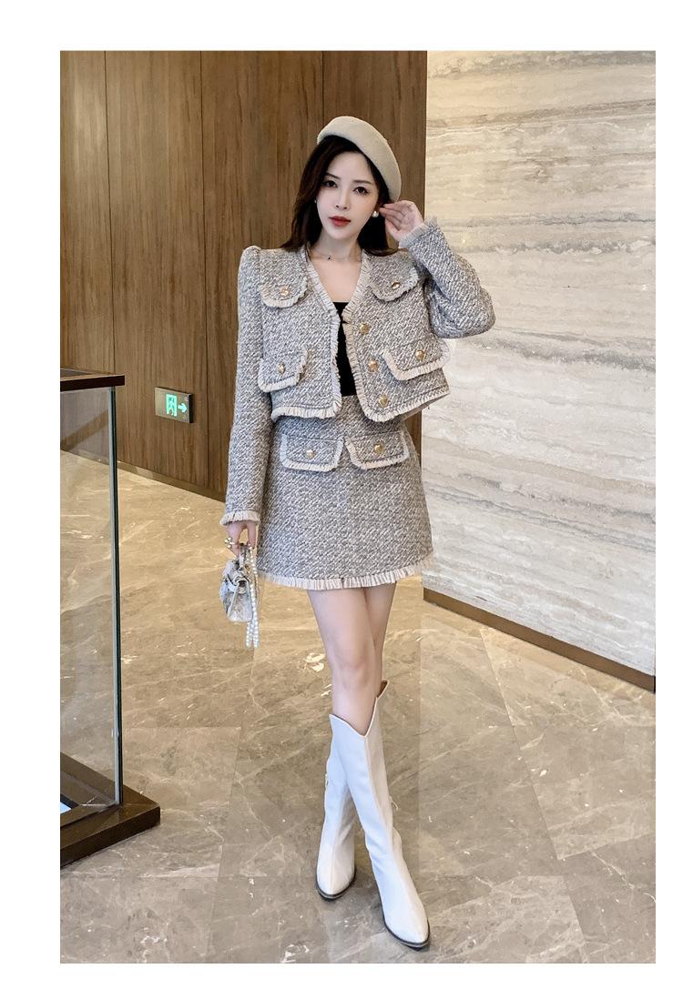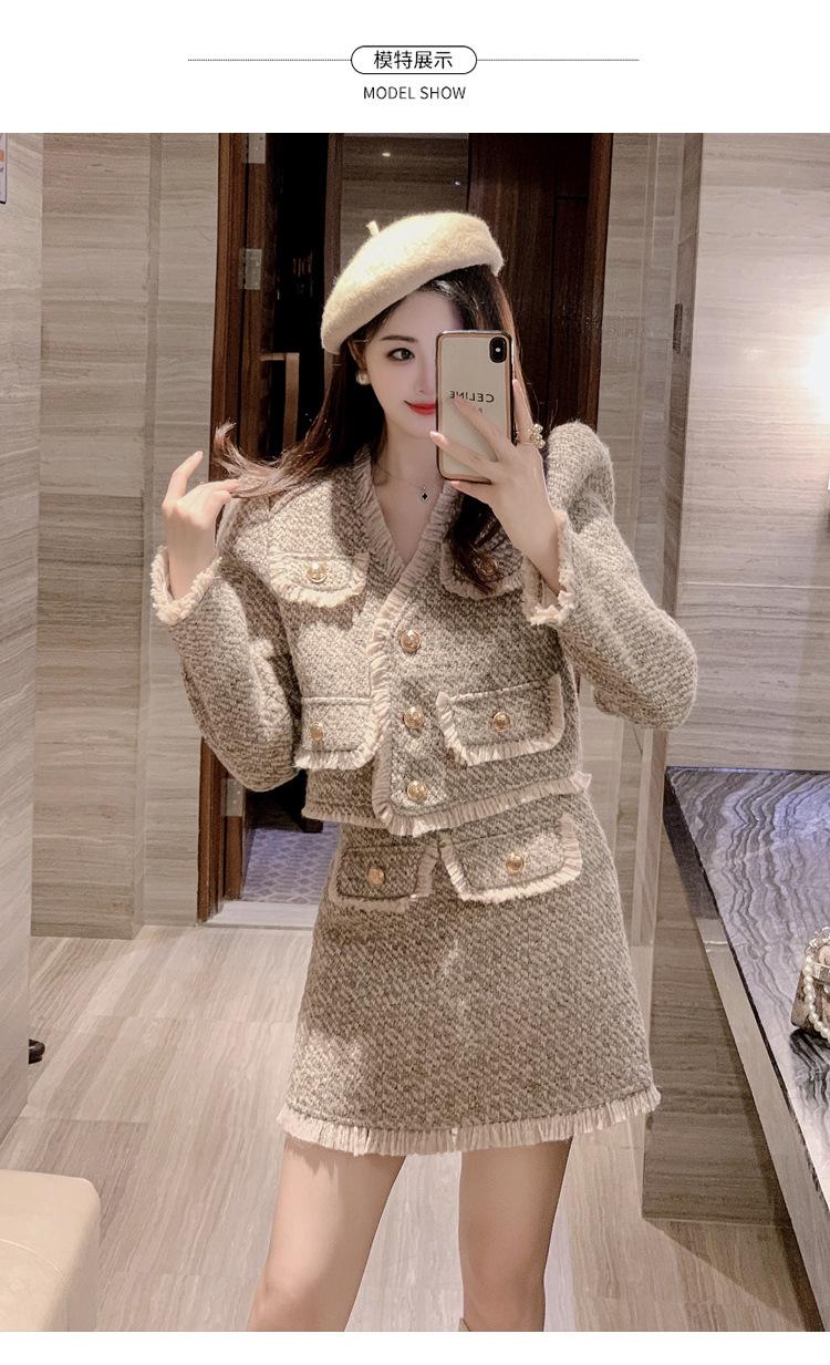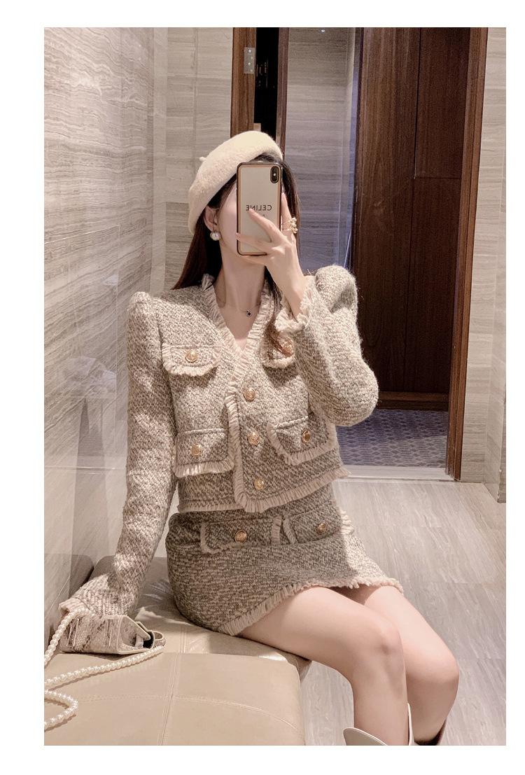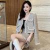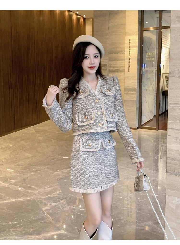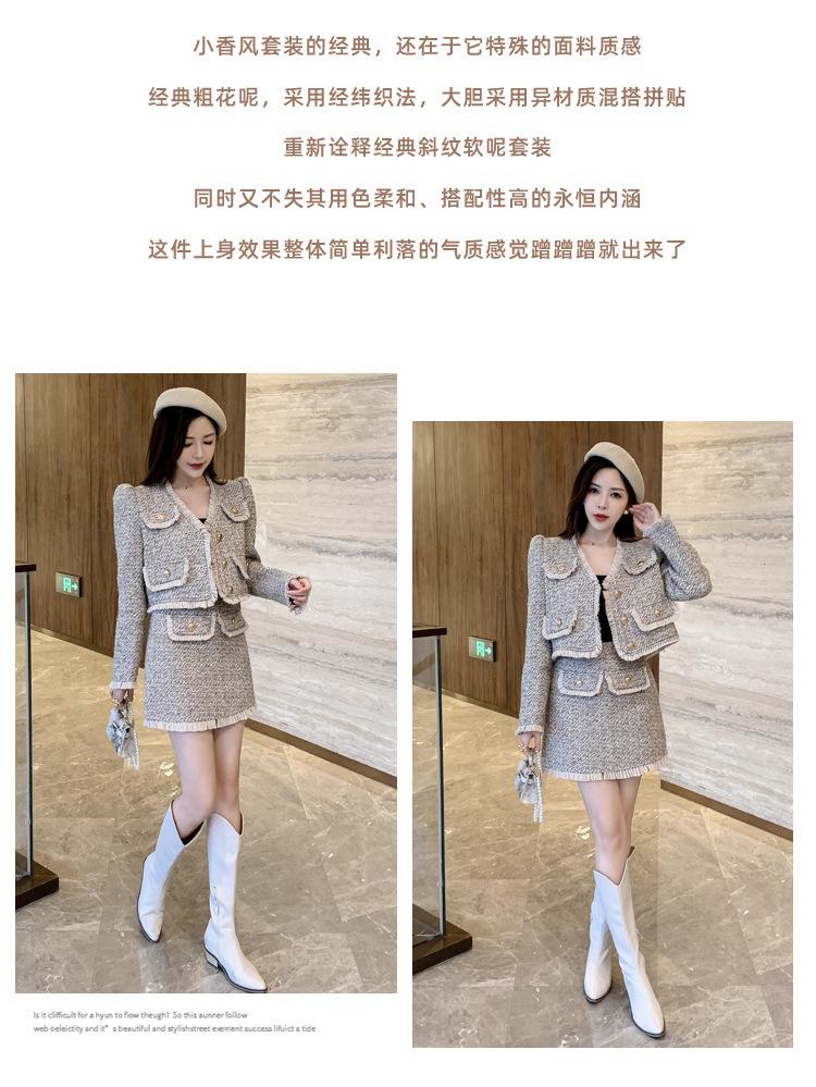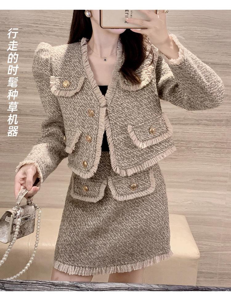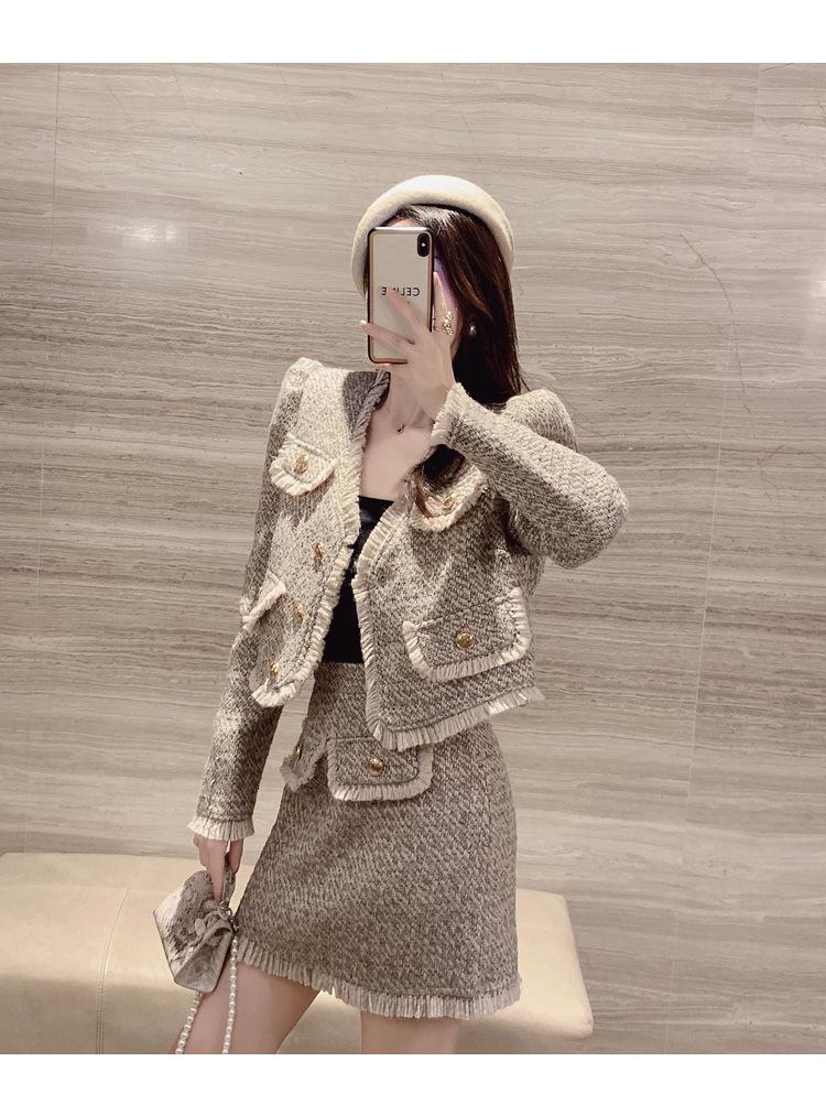 Disparo real en stock Nuevo temperamento de socialité estilo Chanel, conjunto de traje de dos piezas con falda con borlas y top corto