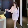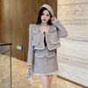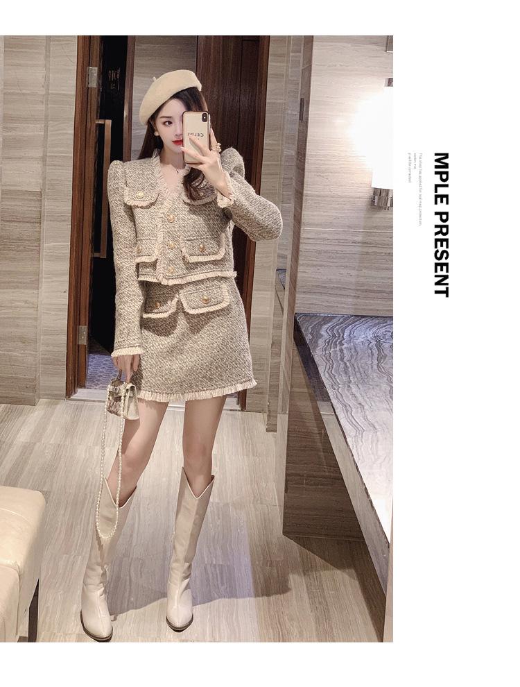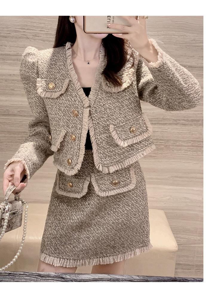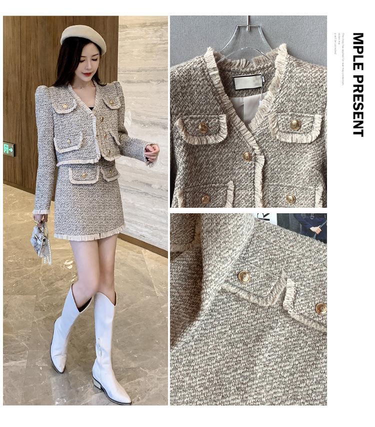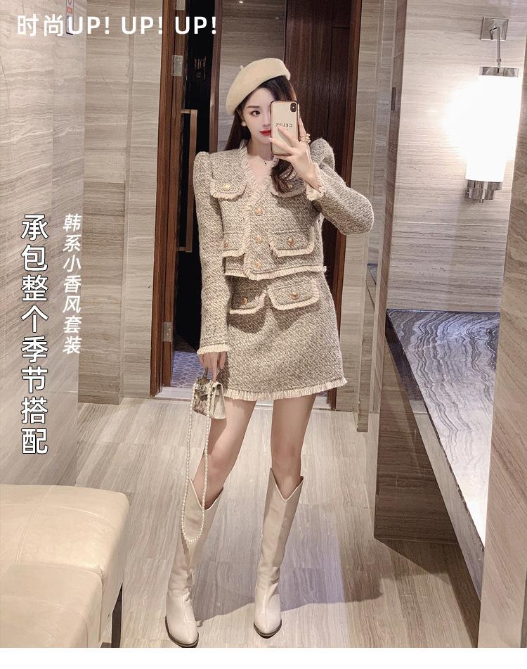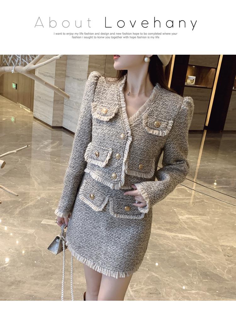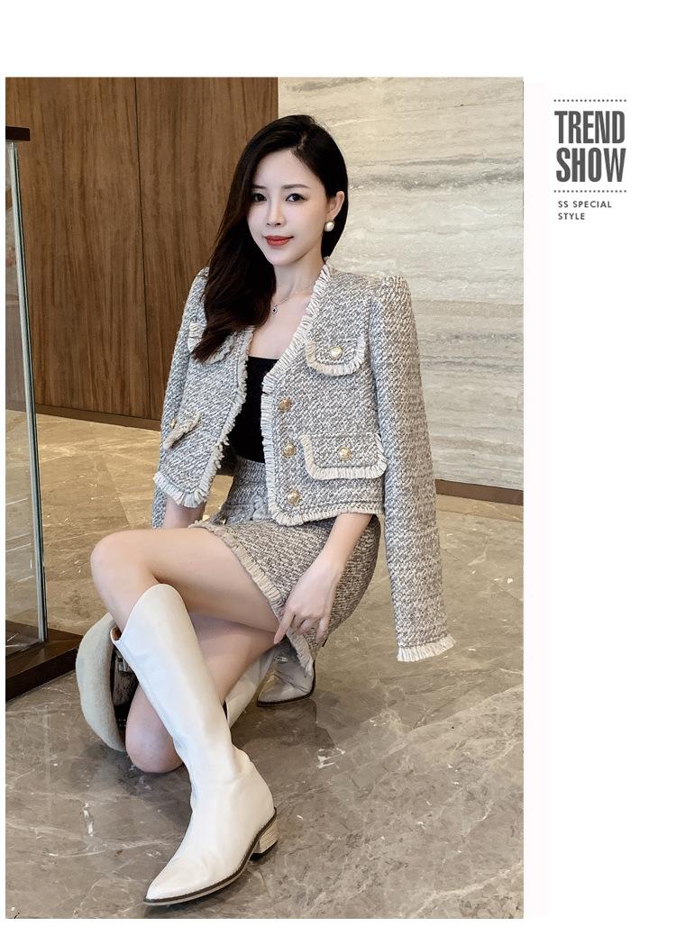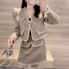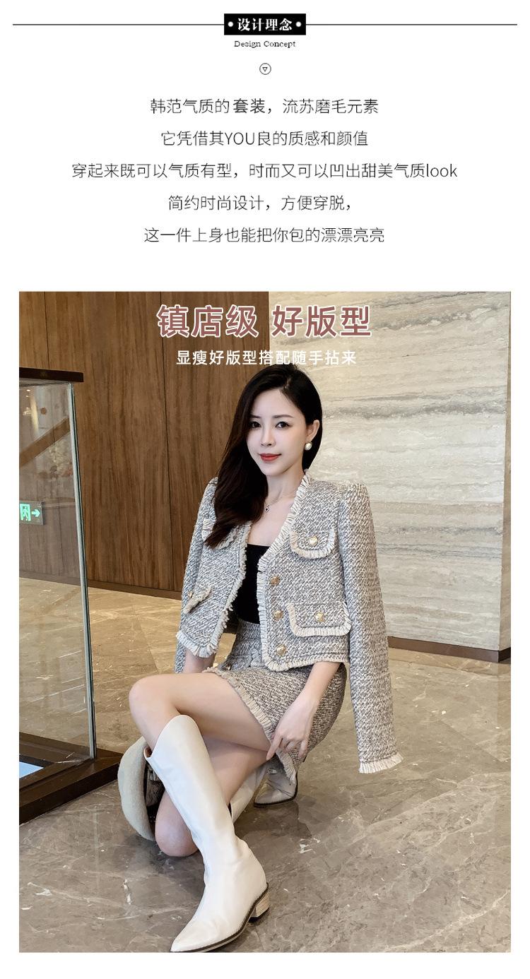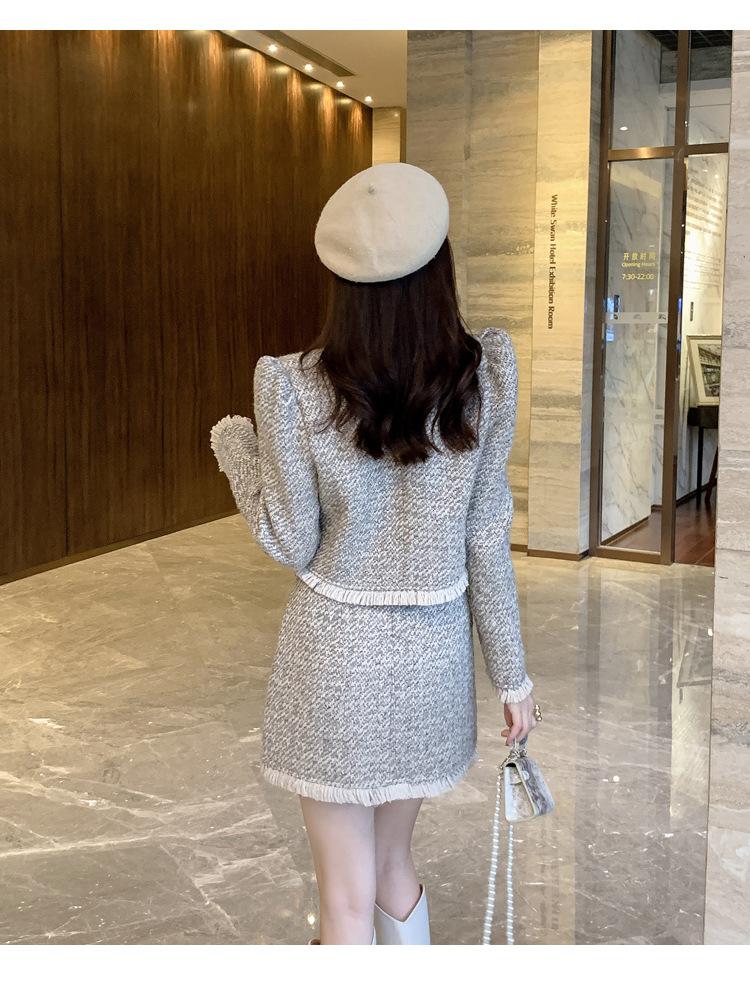 Disparo real en stock Nuevo temperamento de socialité estilo Chanel, conjunto de traje de dos piezas con falda con borlas y top corto