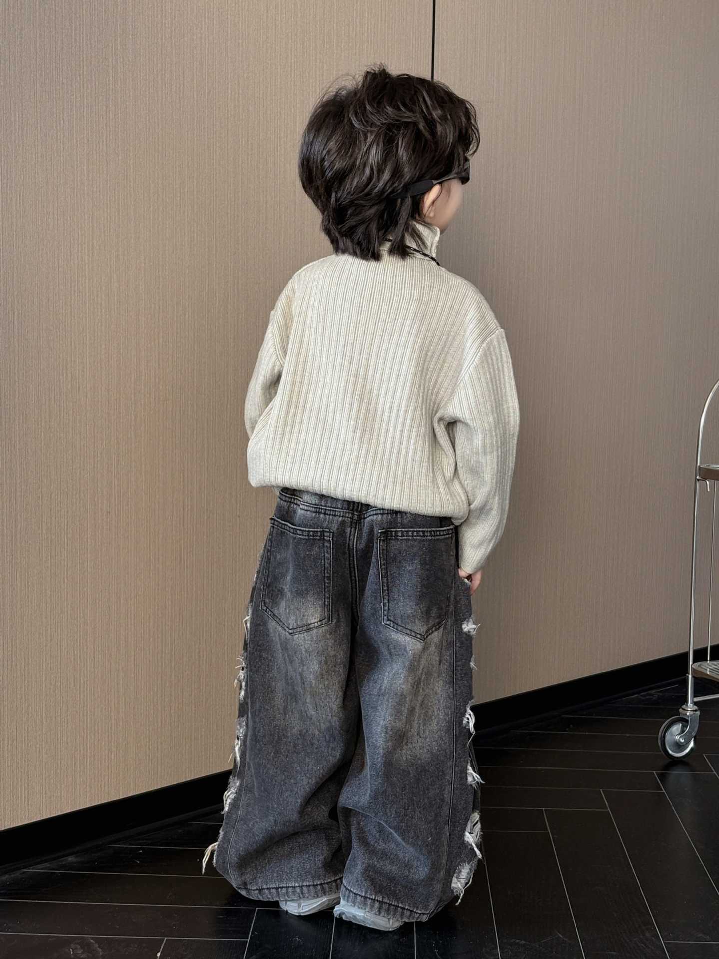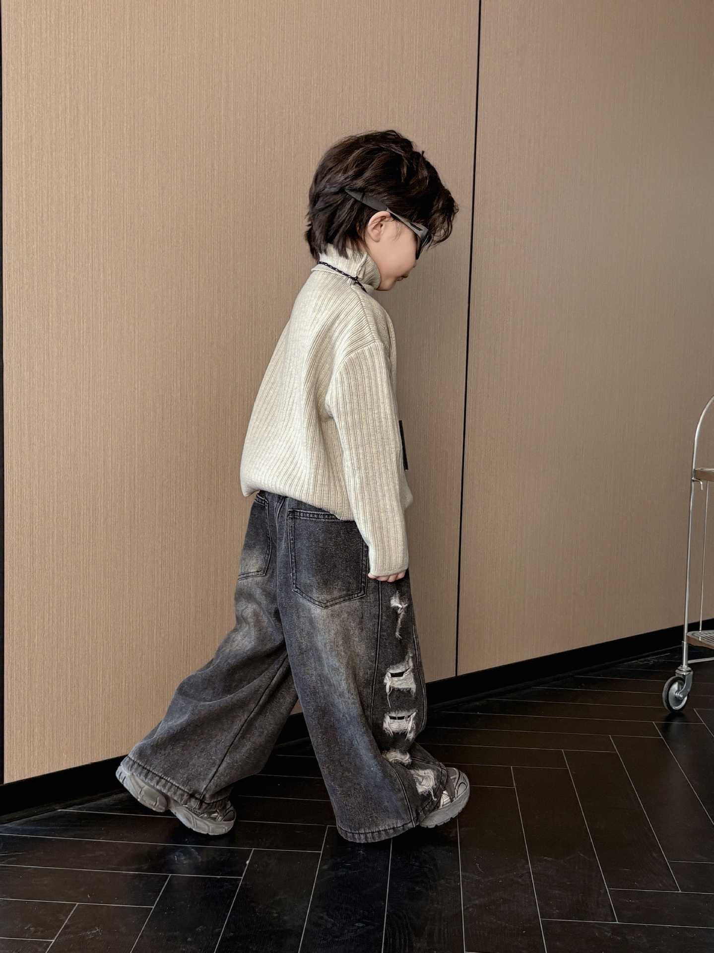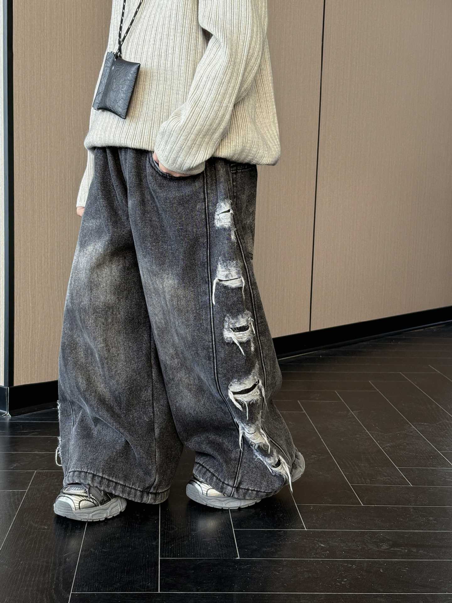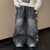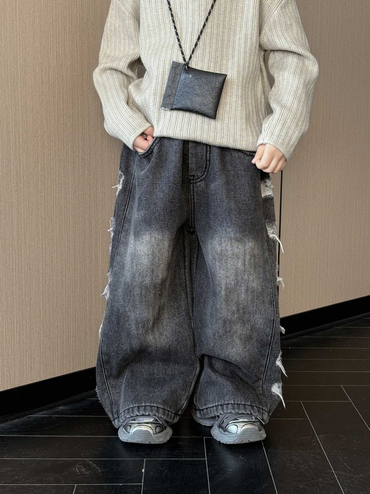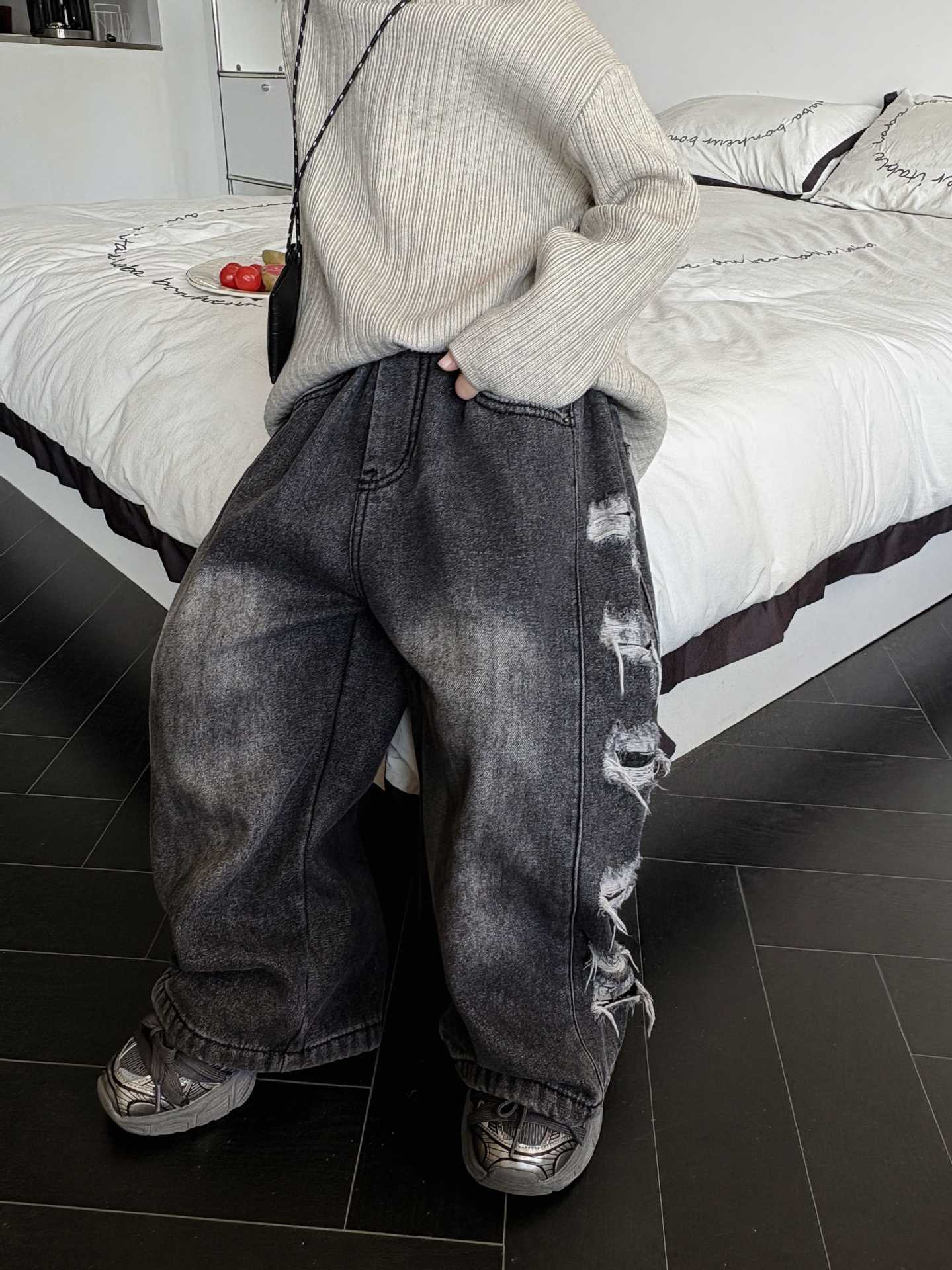 Muyang 2024 Invierno Estilo Coreano Niños Vintage Americano Rotos Pierna Recta Forro Polar Jeans Modernos Desgastados