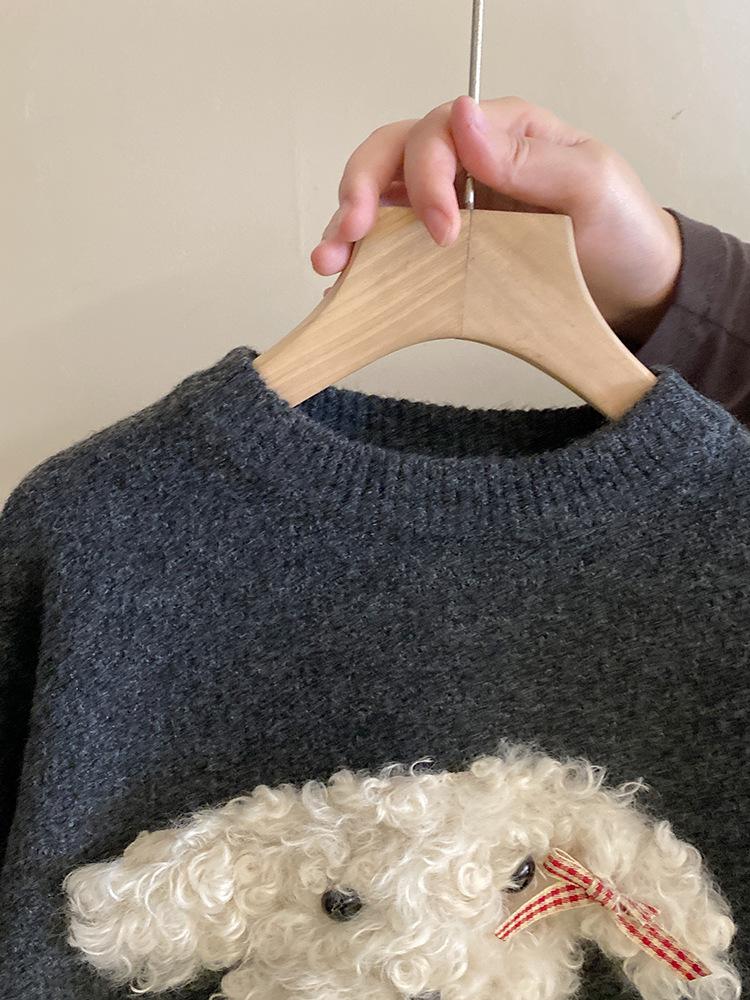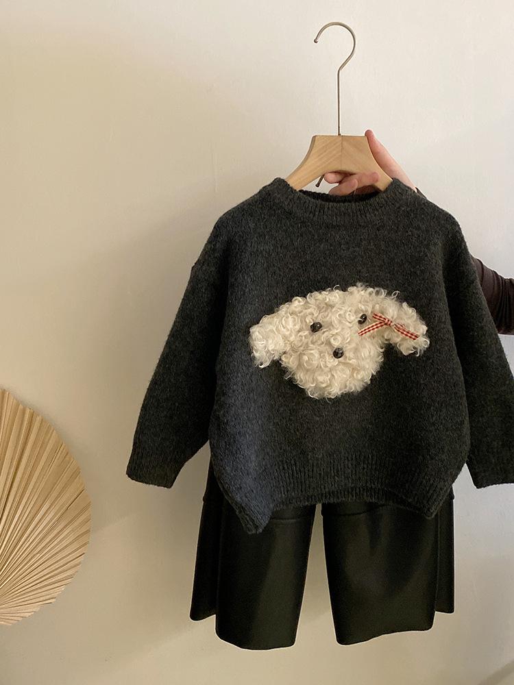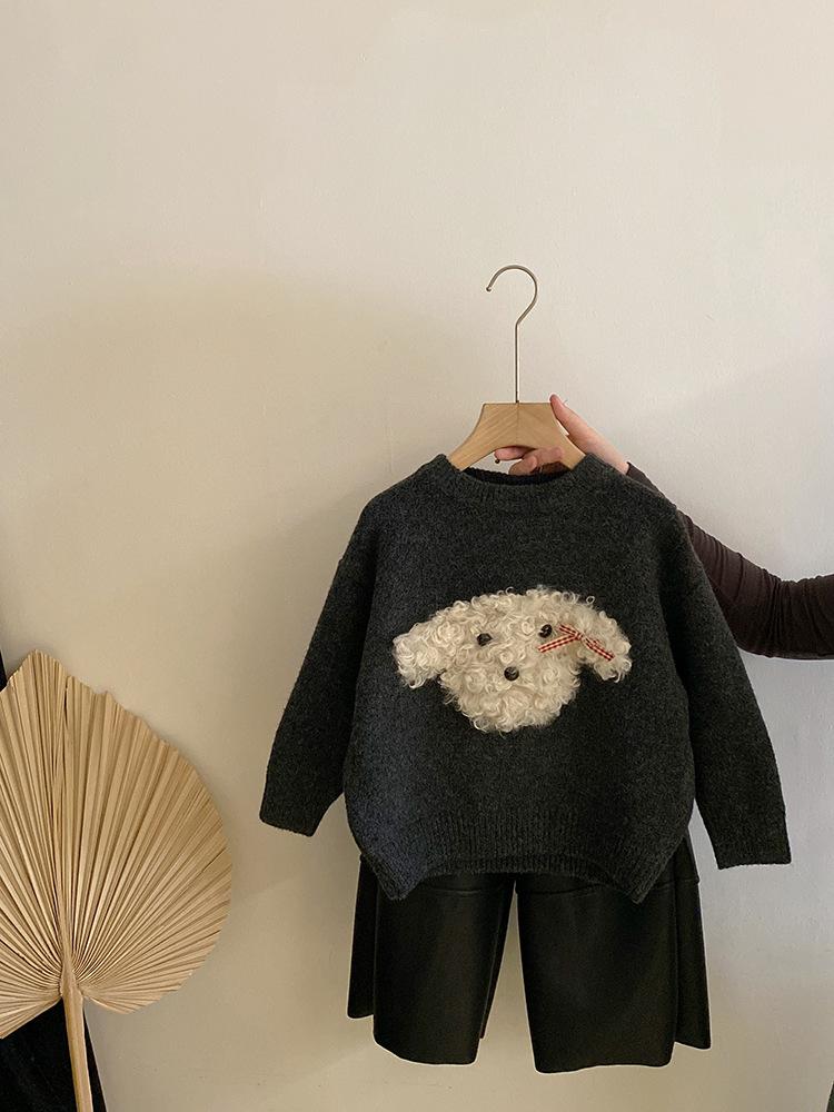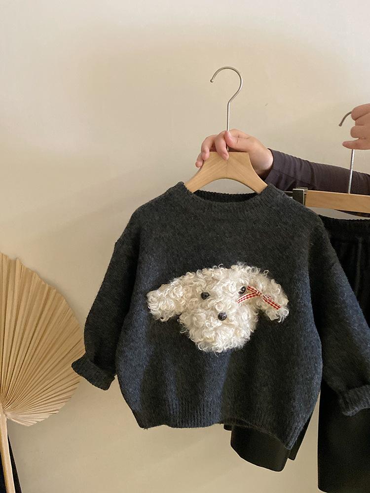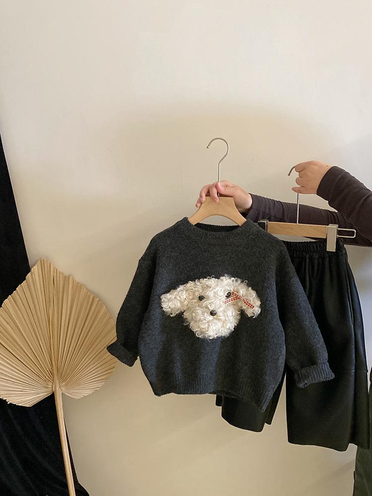 Suéter de punto con bonito cachorro de peluche tridimensional para niñas, otoño e invierno 2024, nuevo pantalón de cuero cálido con forro polar, traje estilo occidental