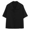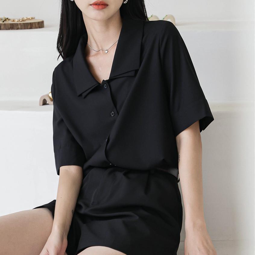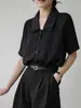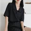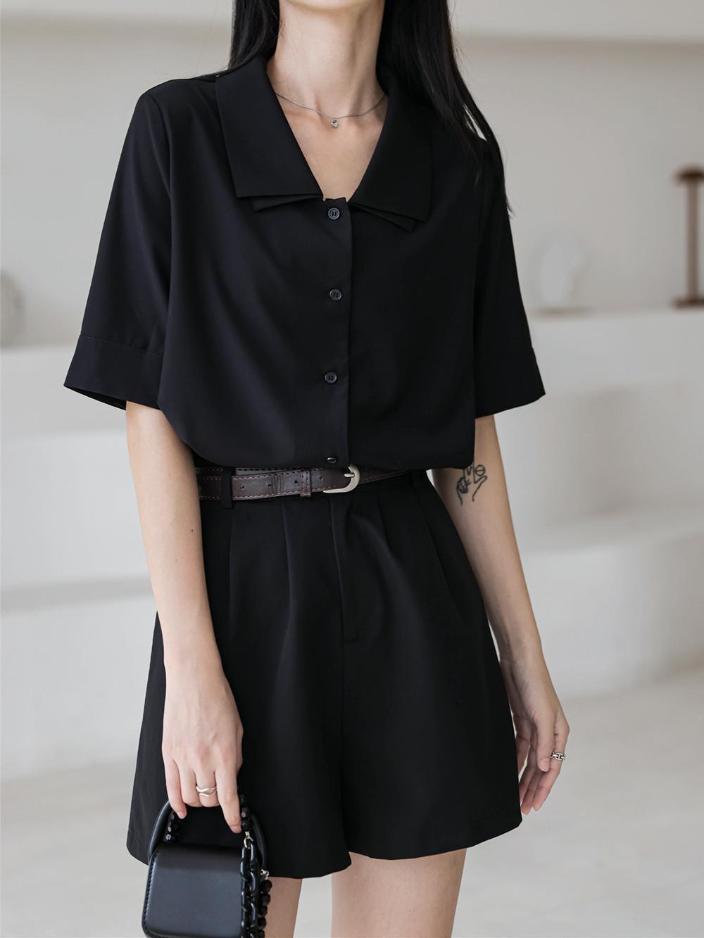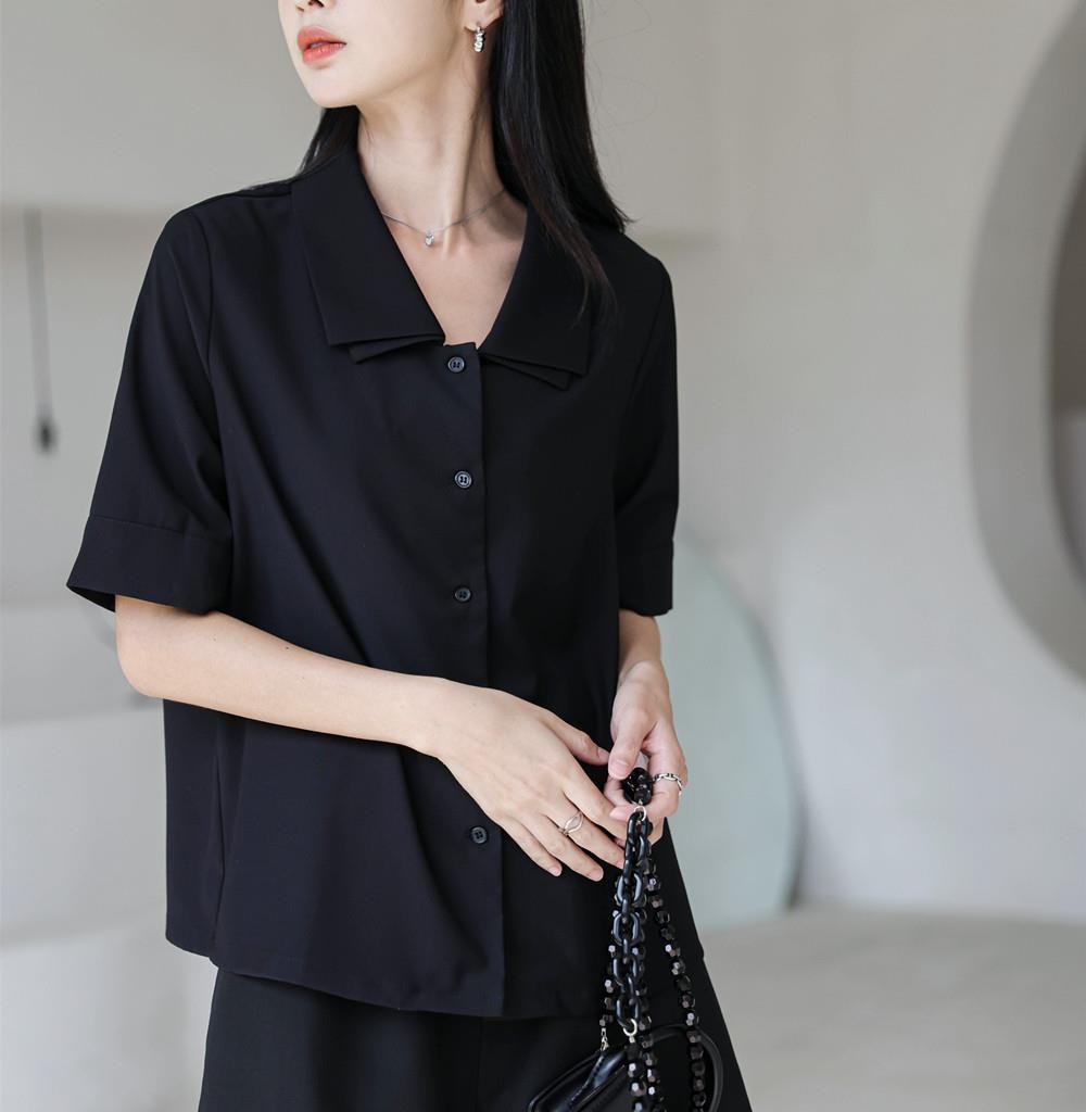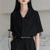 Verano nuevo estilo francés elegante camisa delgada sentido del diseño nicho retro solapa camisa negra de manga corta para mujer