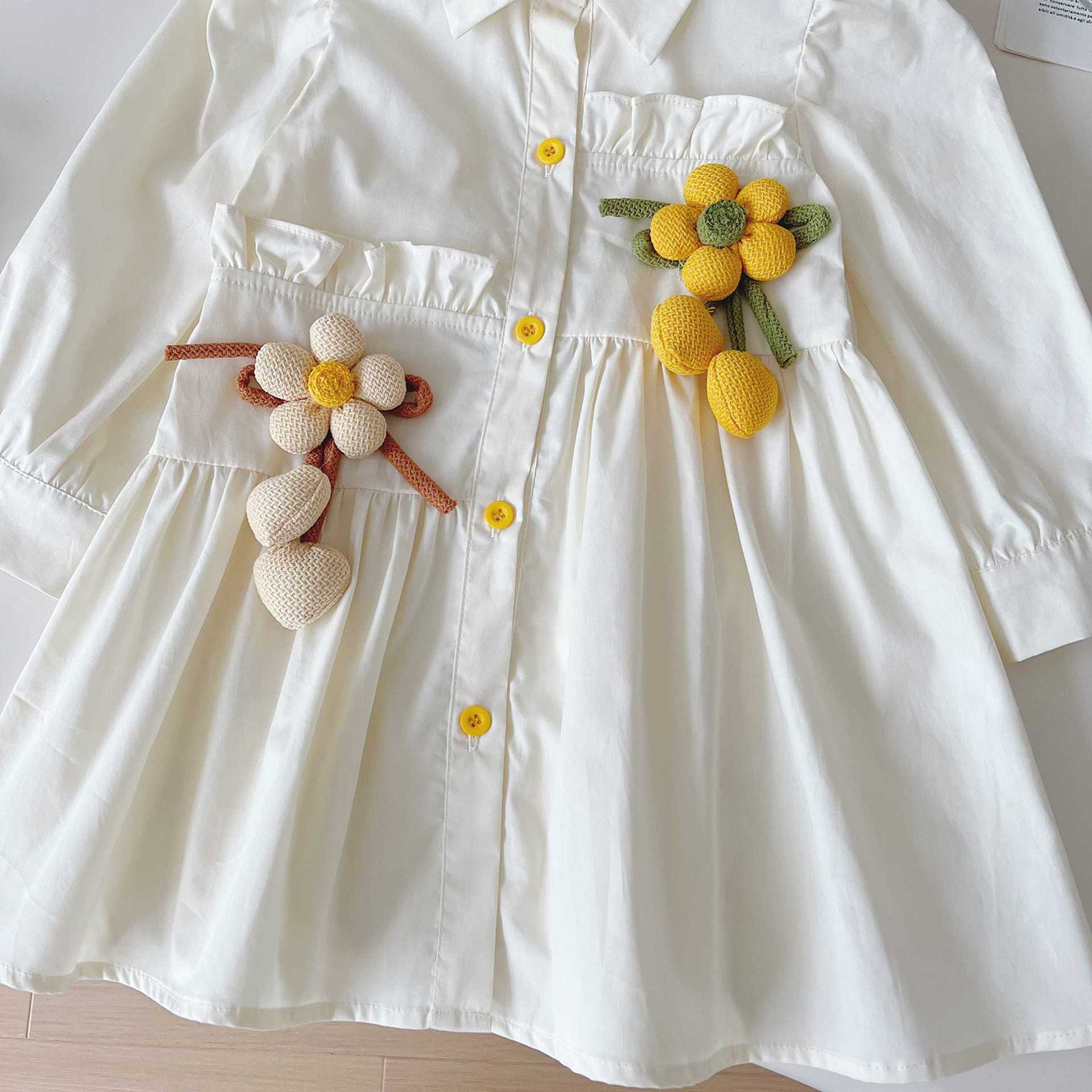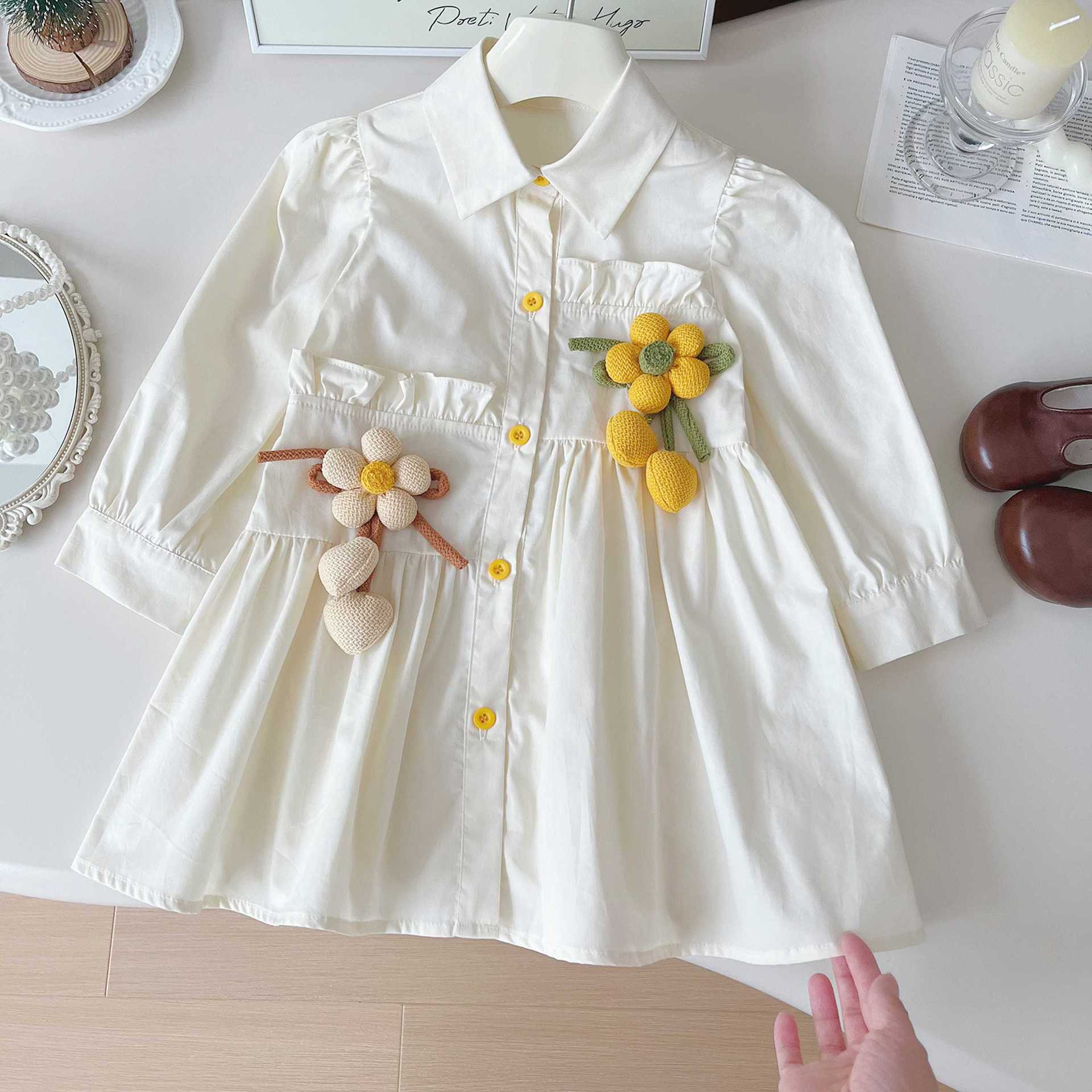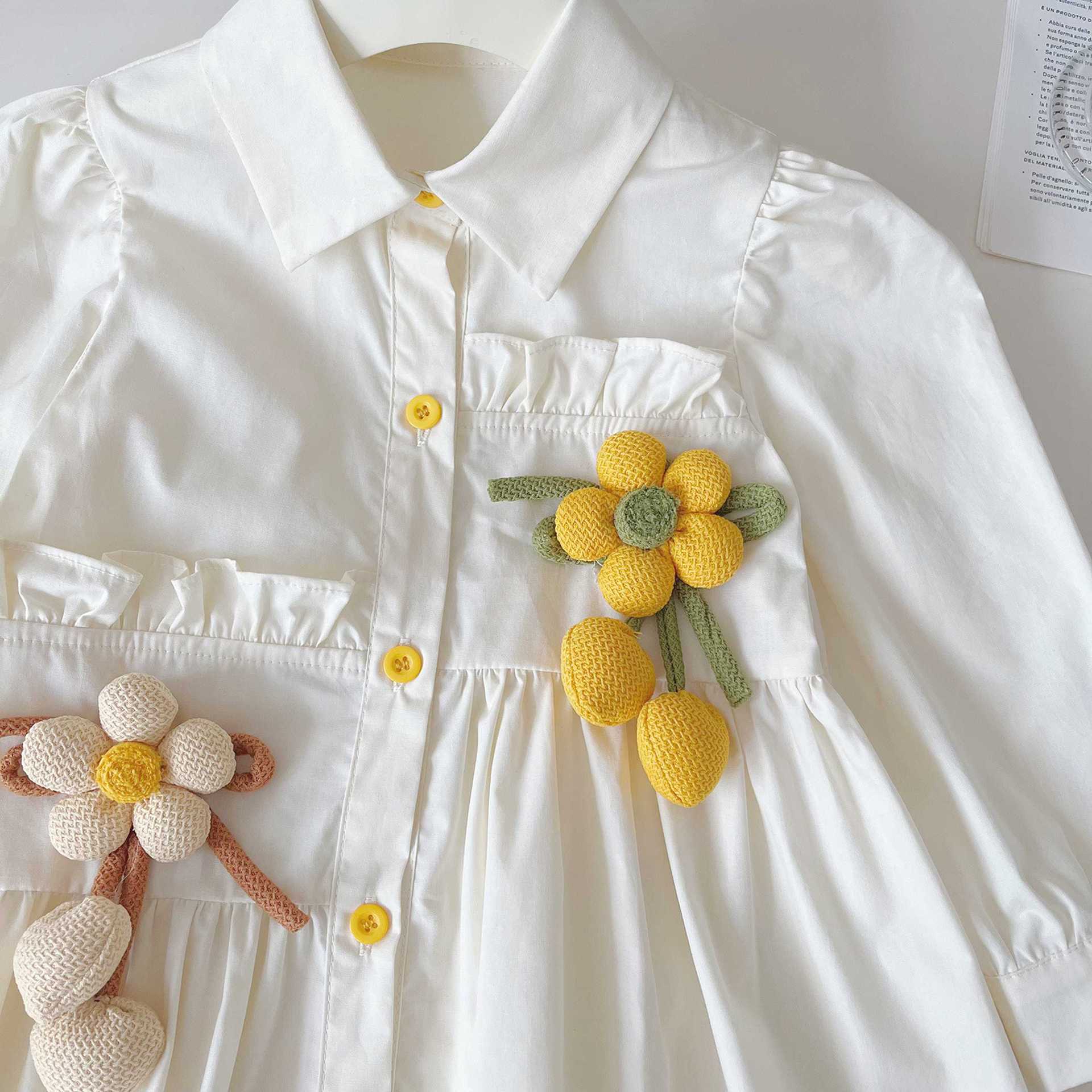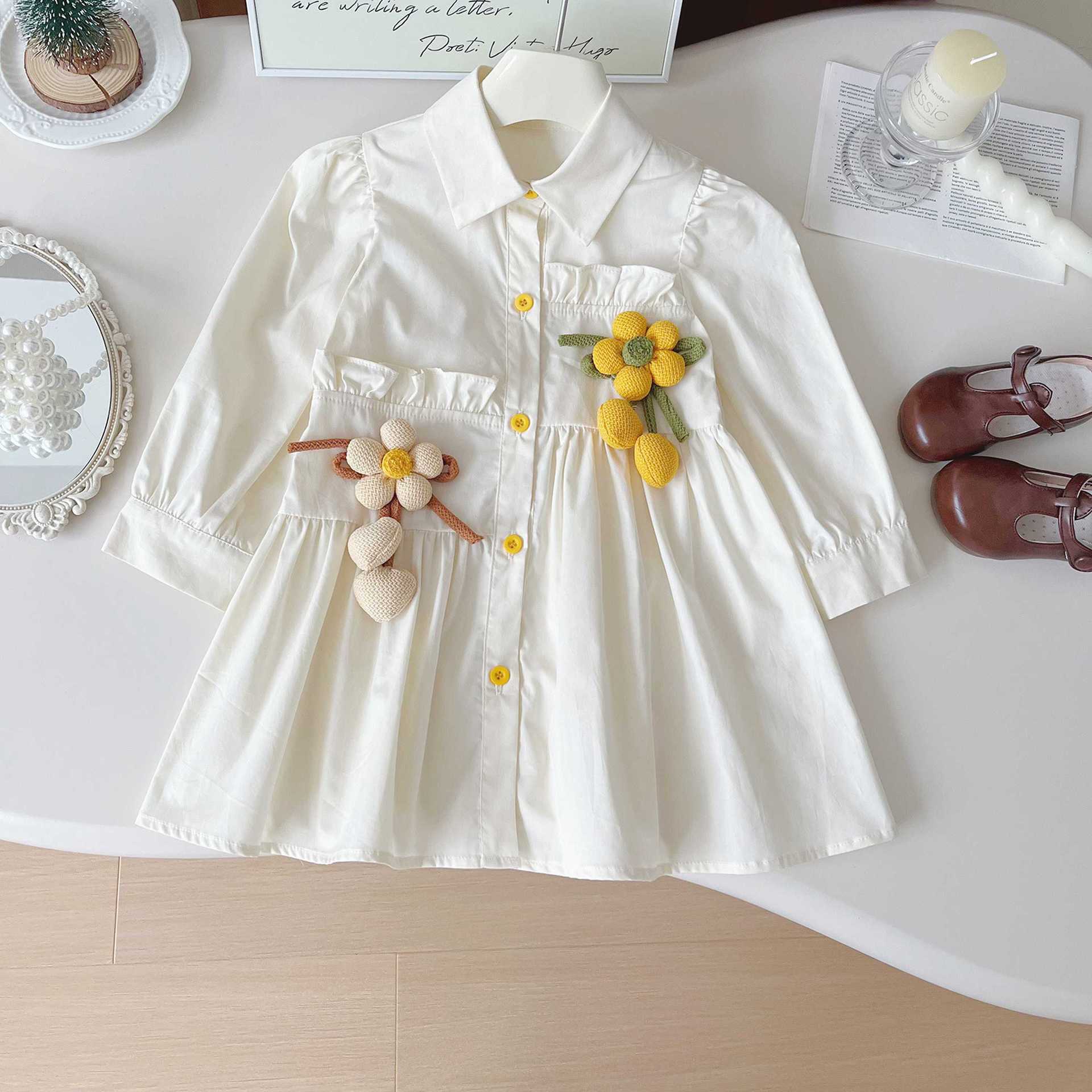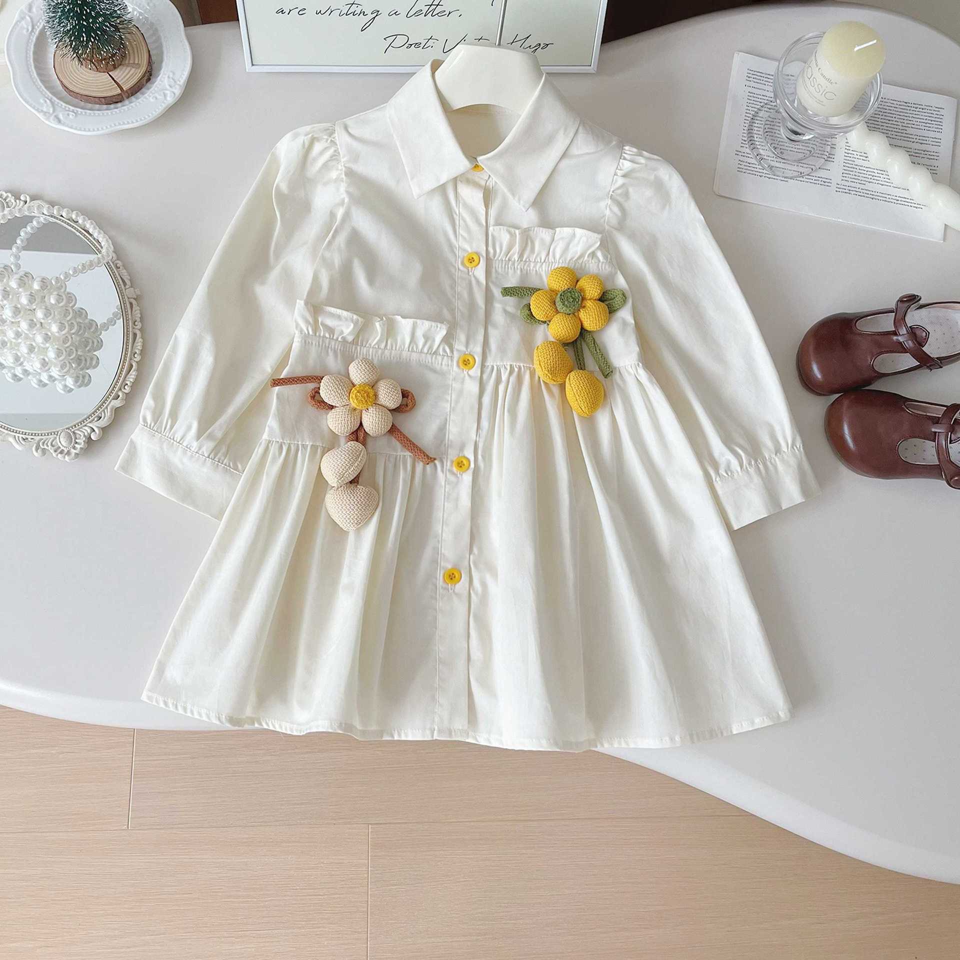 Estilo Primavera y Otoño 2025 Camisa Falda de Manga Larga para Niña Flor Tridimensional en la Cintura Vestido de Botonadura Sencilla Moderno
