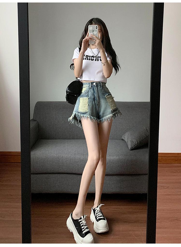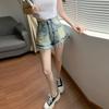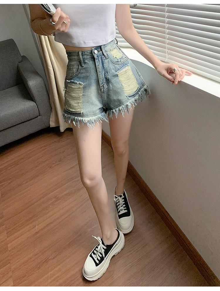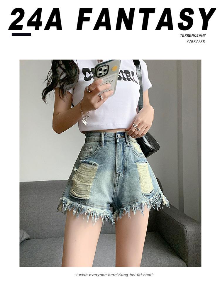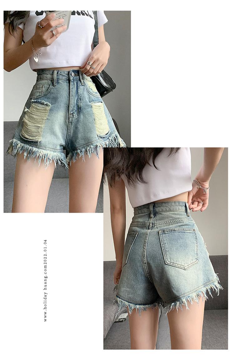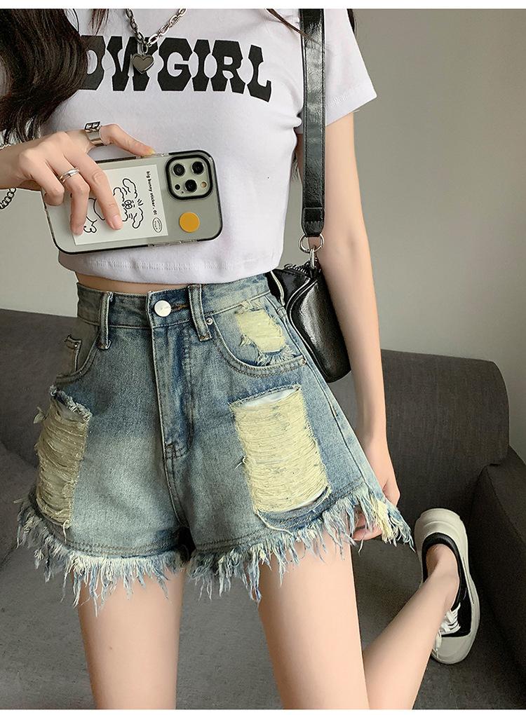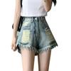 Shorts de mezclilla de cintura alta con flecos para mujer 2024 Verano Nuevo Diseño Americano Retro Desgastados A-Line Pierna Ancha