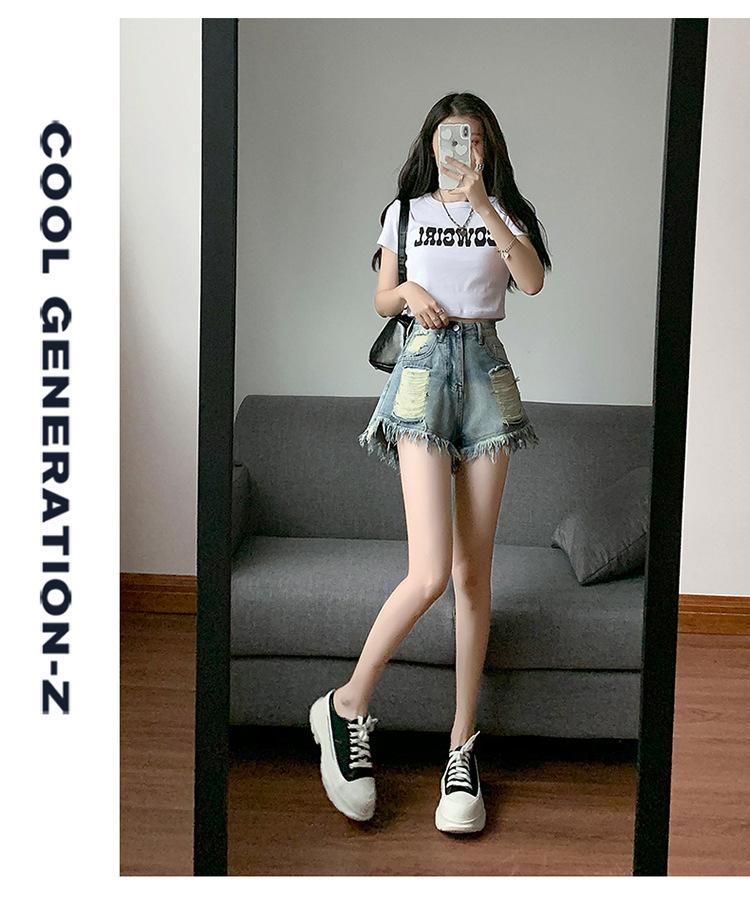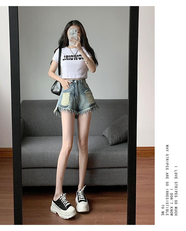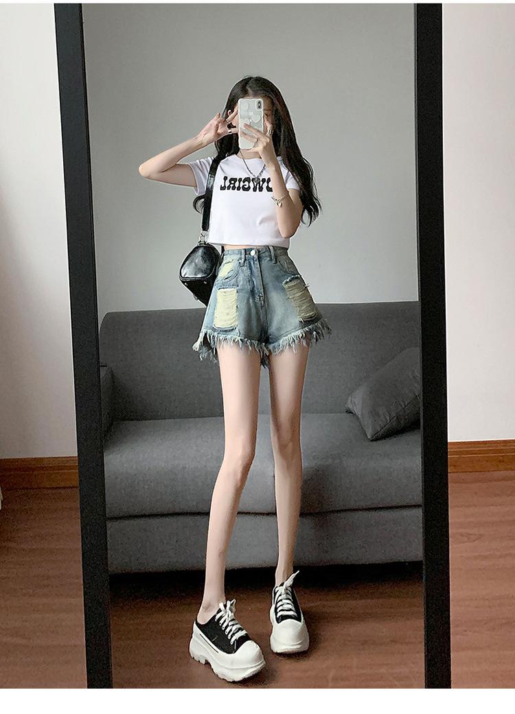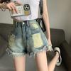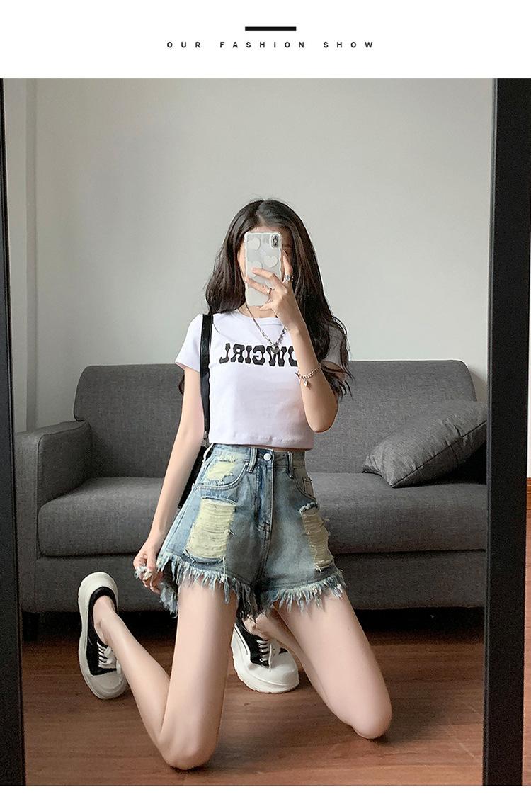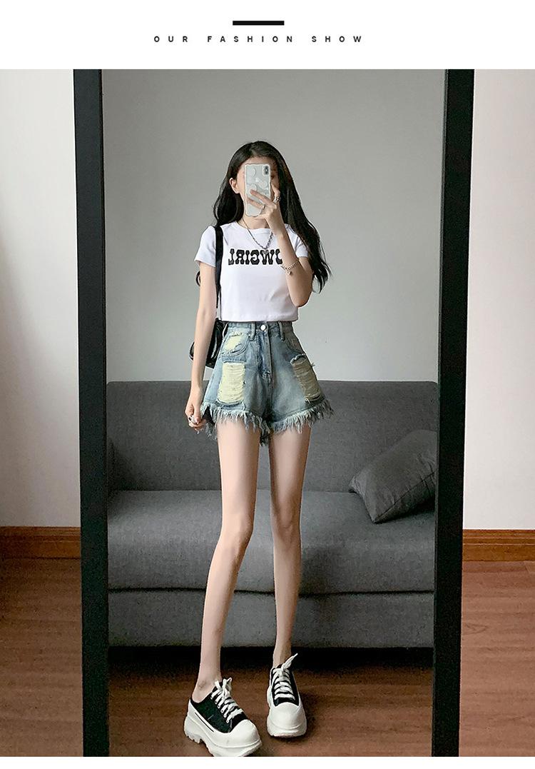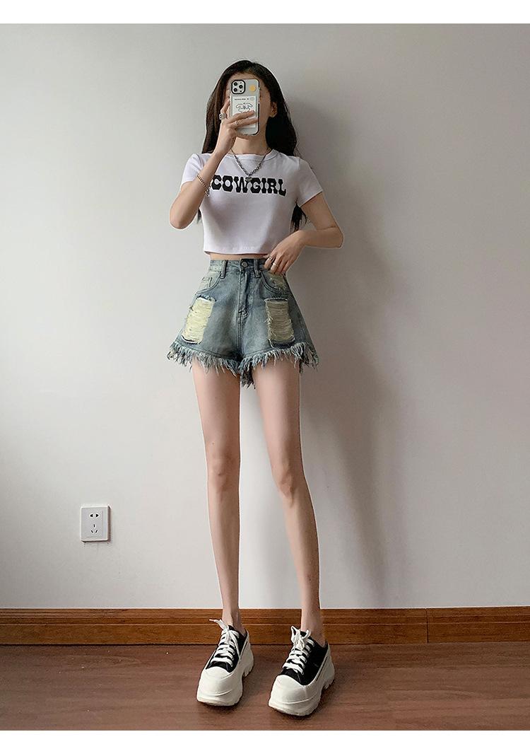 Shorts de mezclilla de cintura alta con flecos para mujer 2024 Verano Nuevo Diseño Americano Retro Desgastados A-Line Pierna Ancha