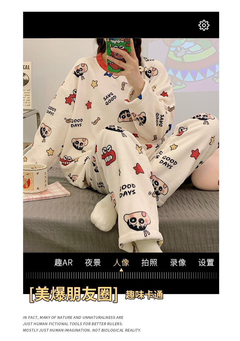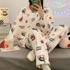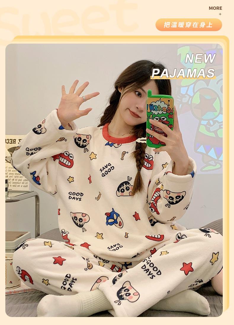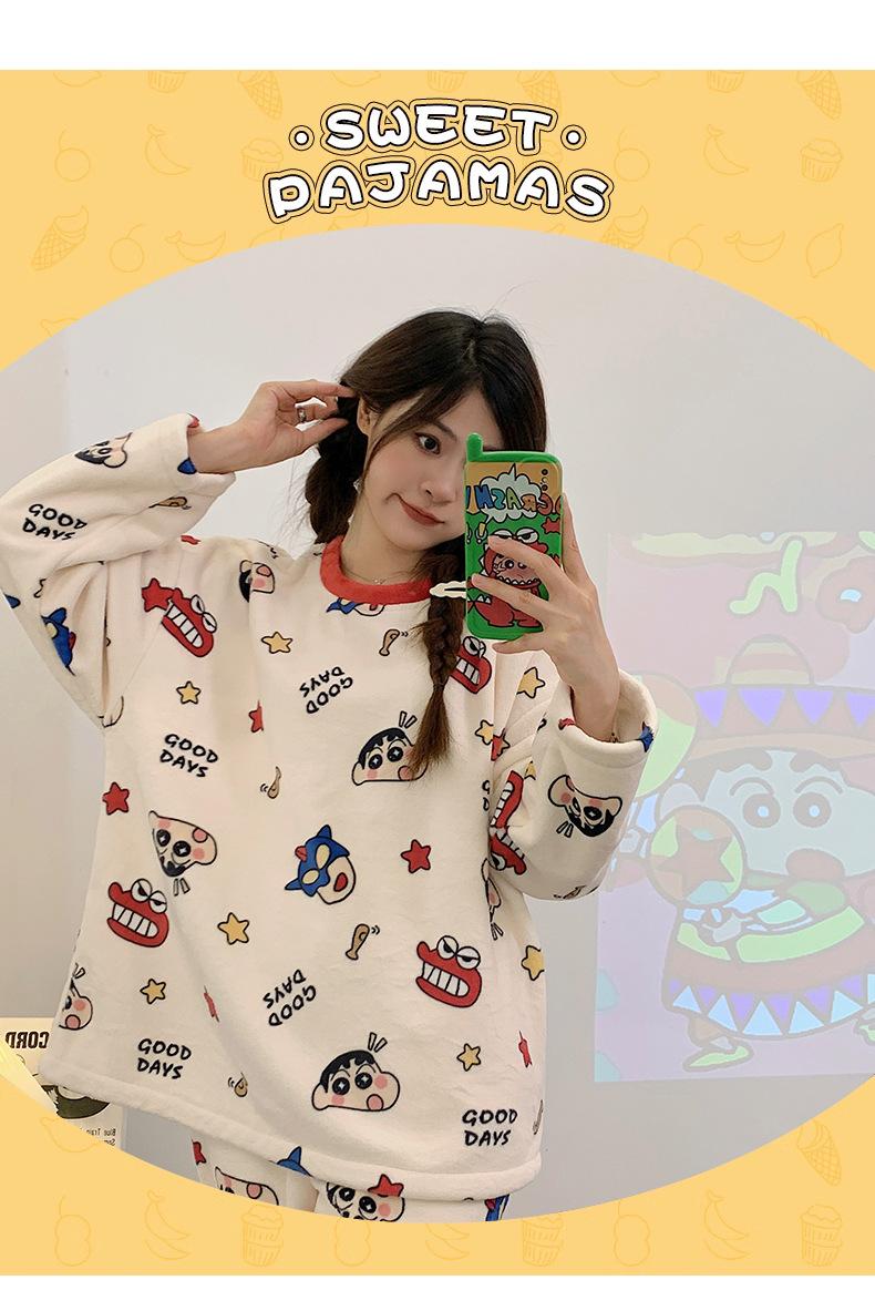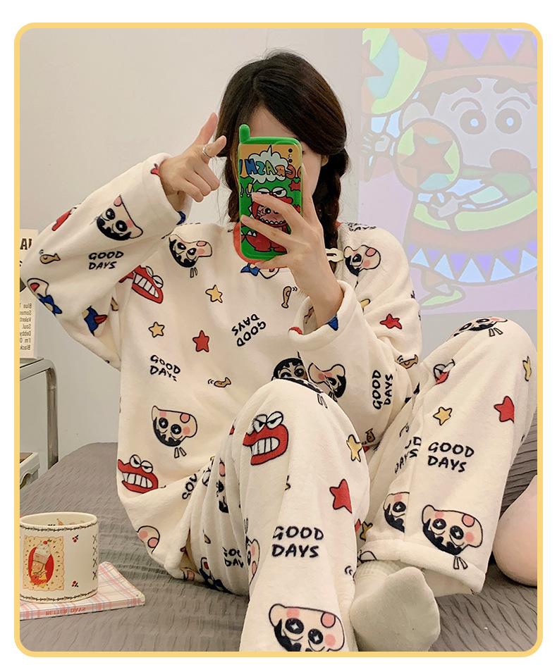 Pijamas de otoño e invierno 2024 para mujer, de manga larga, de forro polar coral, con cuello redondo, de franela estampada con dibujos animados para estudiantes, ropa para el hogar