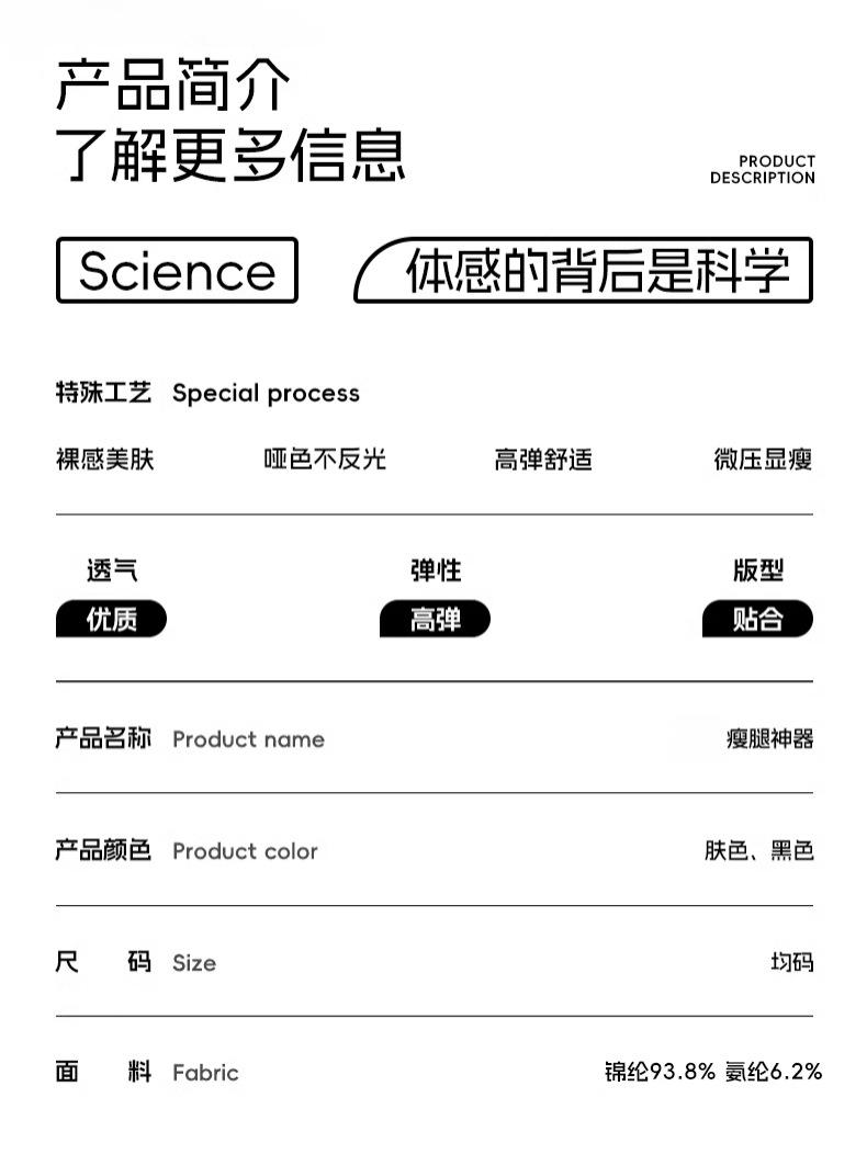 Butt lift, Shaping, Anti-glare, Anti-shedding, Anti-friction