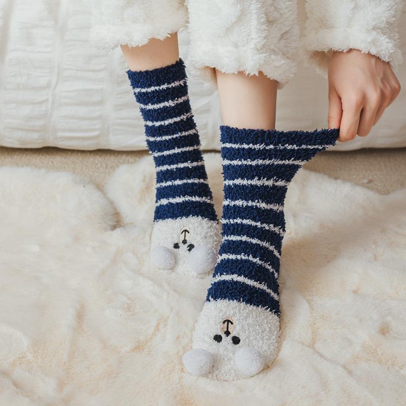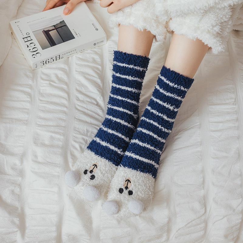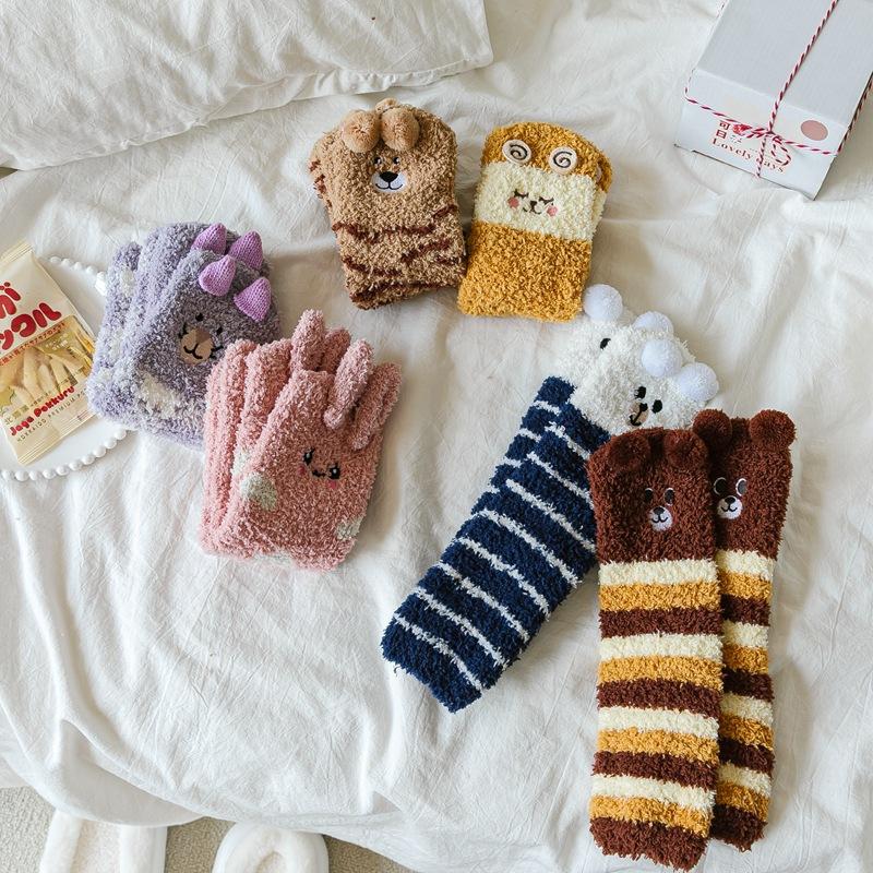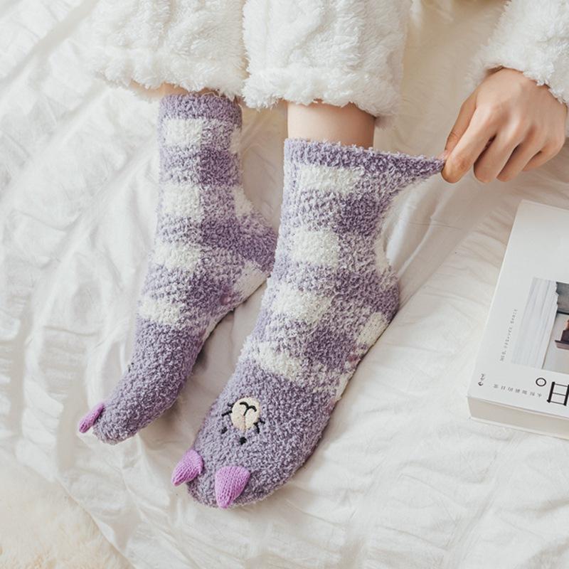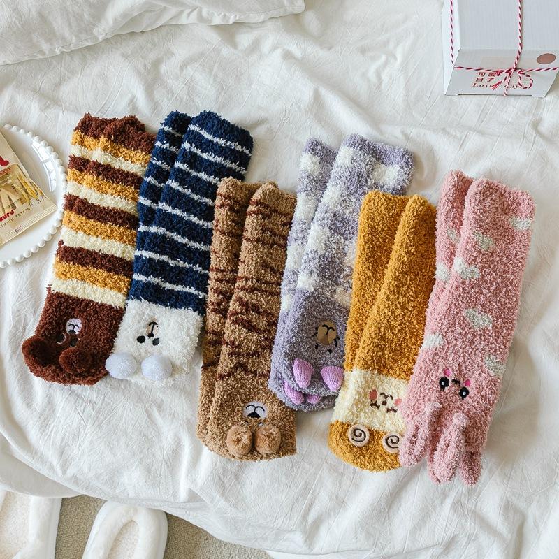 Calcetines de lana coral con dibujos animados para mujer, otoño e invierno, con forro polar, gruesos, cálidos y bonitos, para dormir en casa.