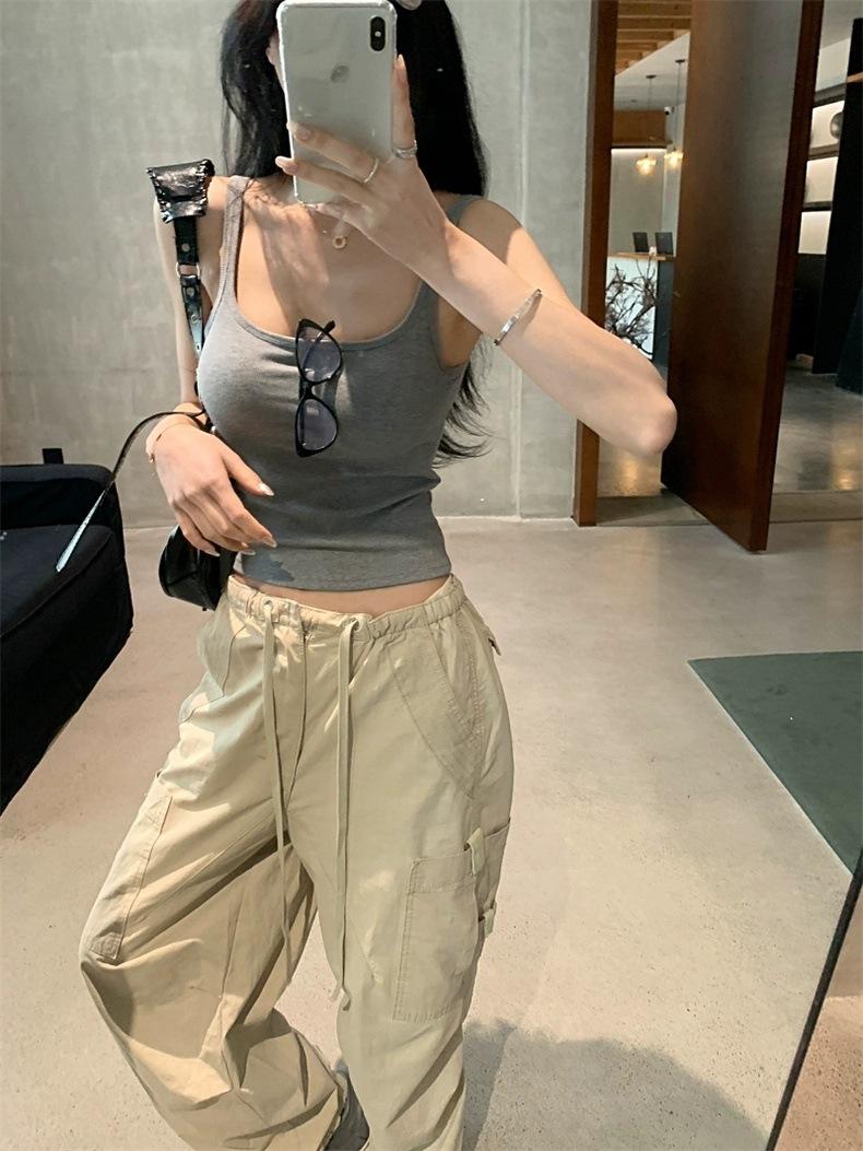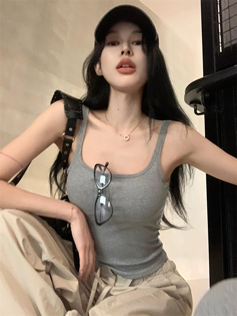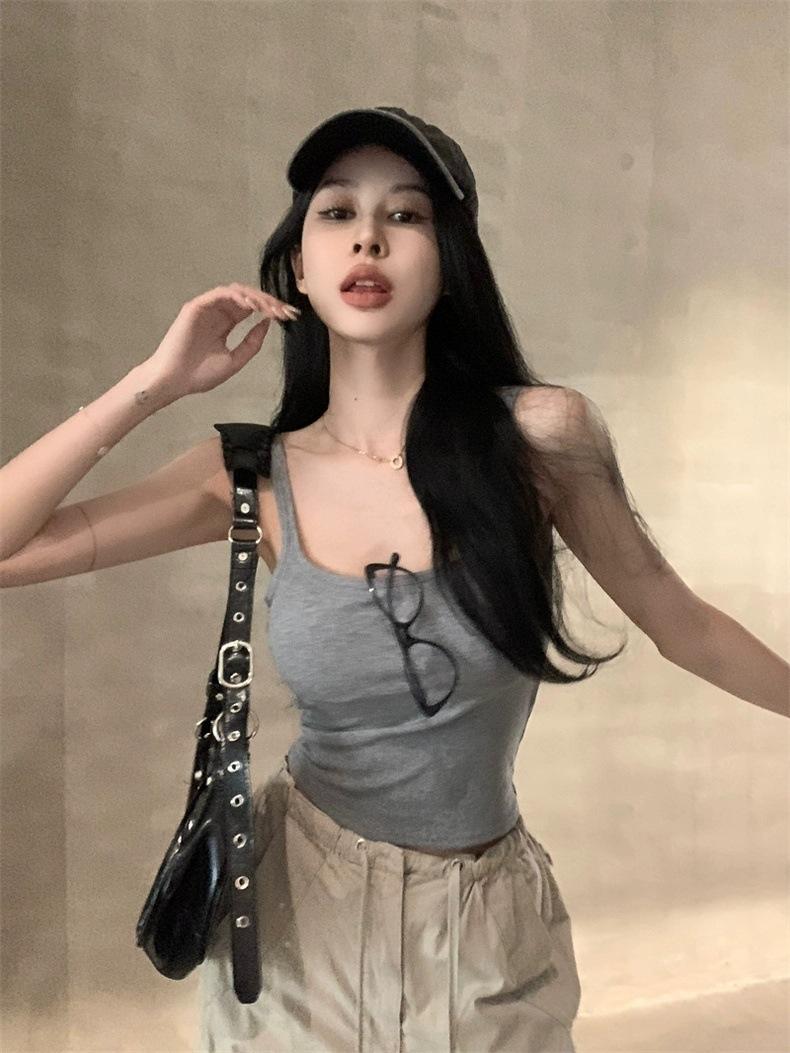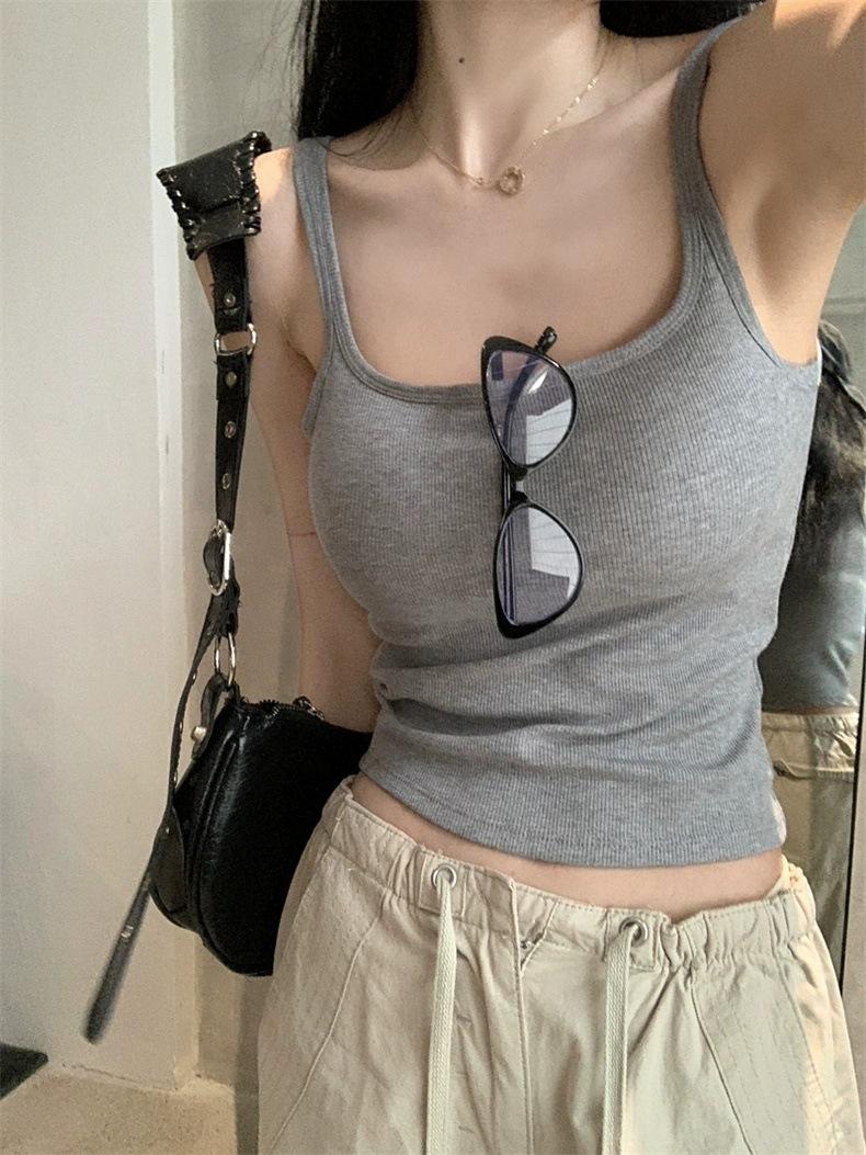Camisola gris retro estilo americano con almohadilla para el pecho, prenda exterior sexy de verano para mujer, estilo Spice Girl, top corto ajustado con espalda hermosa