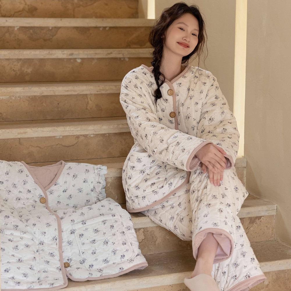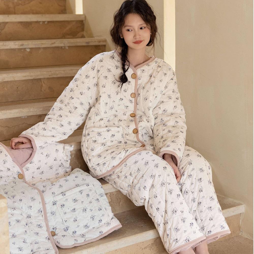 Pijama Familiar Marte otoño/invierno para mujer, dulce chaqueta acolchada de puro algodón, acolchada cálida, talla grande de tres piezas para el hogar 185/225
