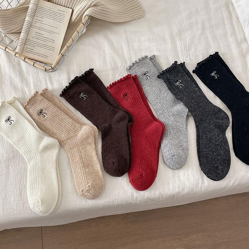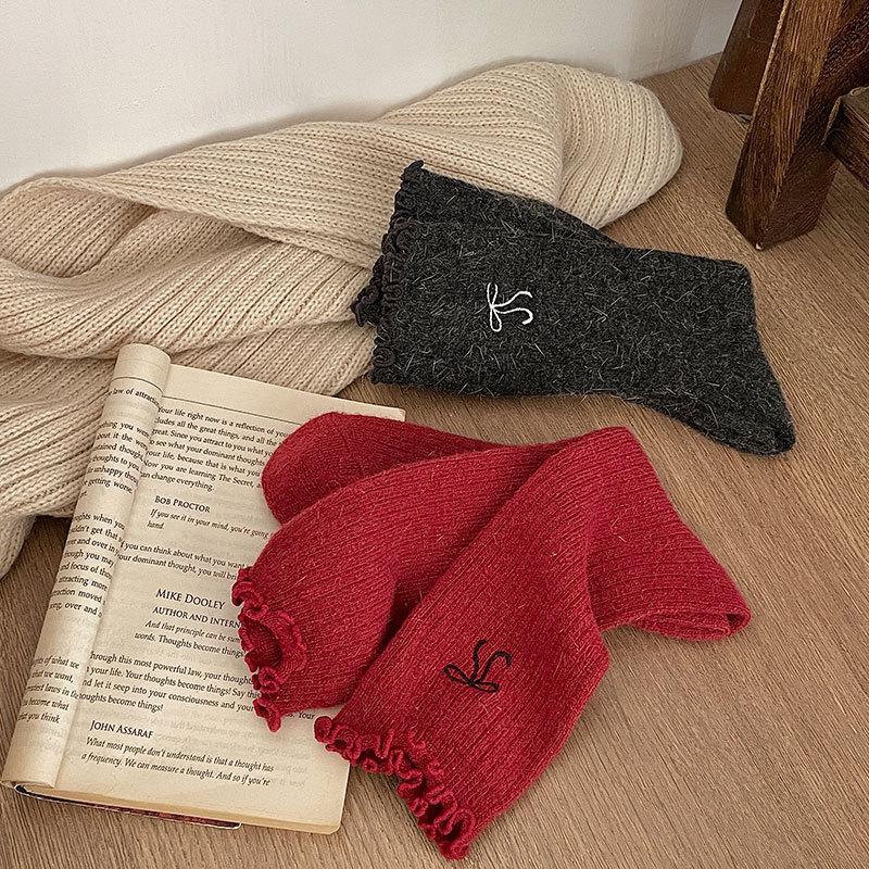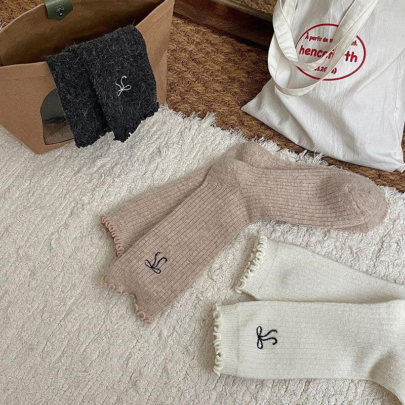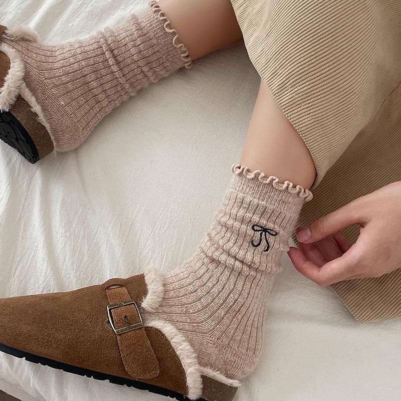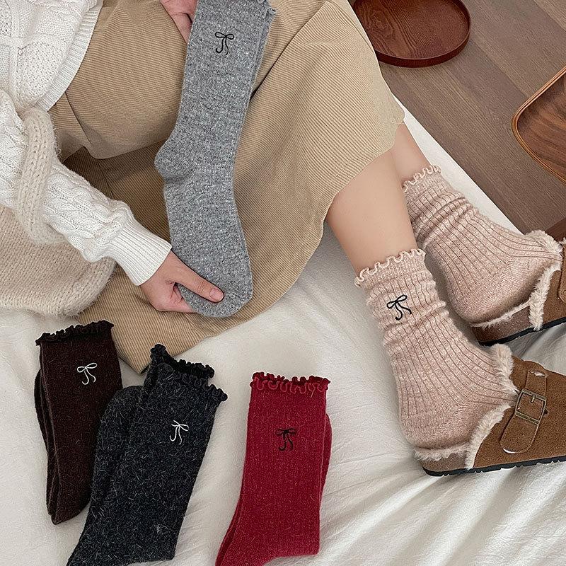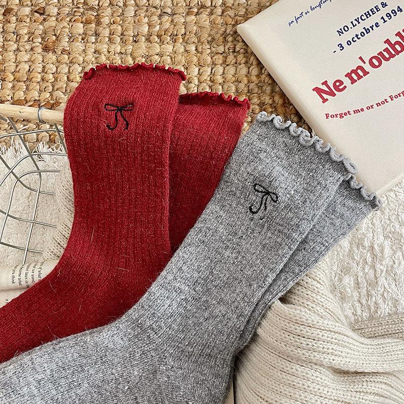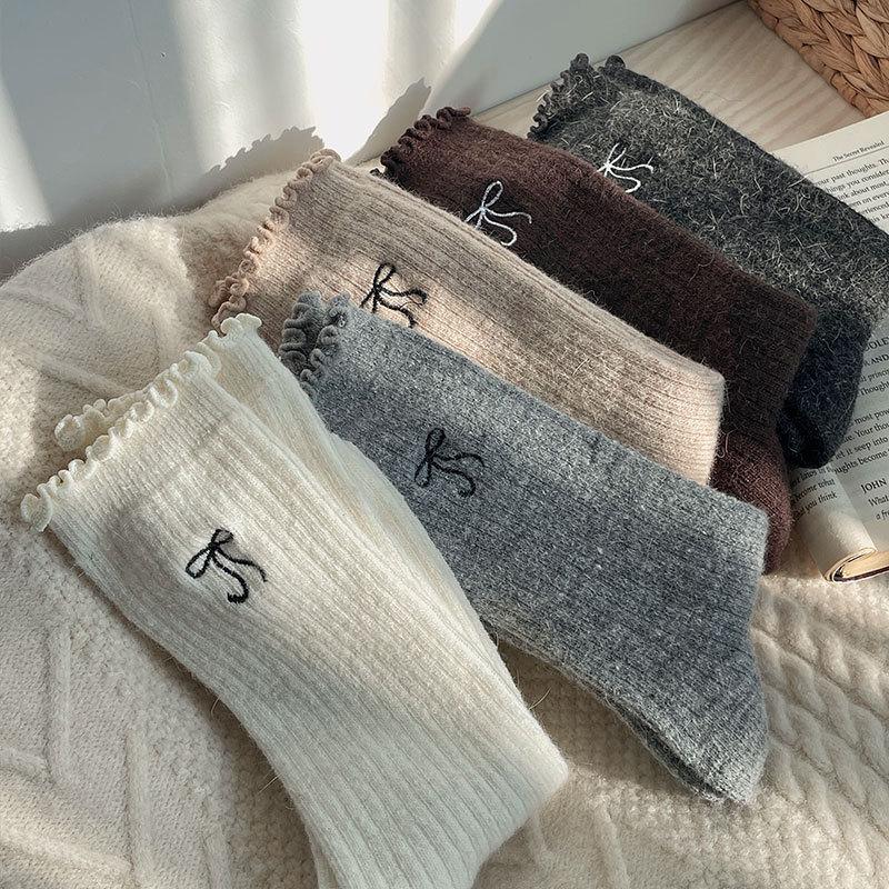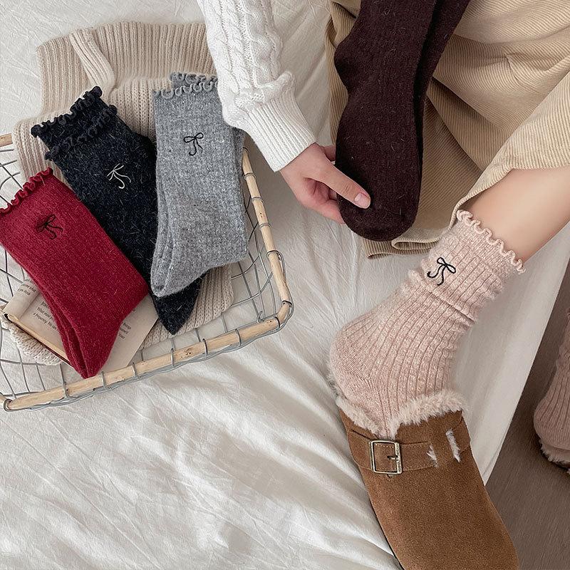 Calcetines de Lana de Invierno Bordado de Lazo Calcetines de Mujer Estilo Coreano Oreja de Madera Calcetines Medios Calcetines Gruesos Cálidos de Pelo de Conejo Apilados