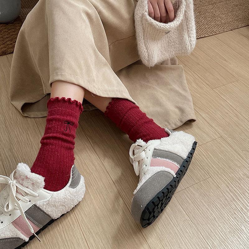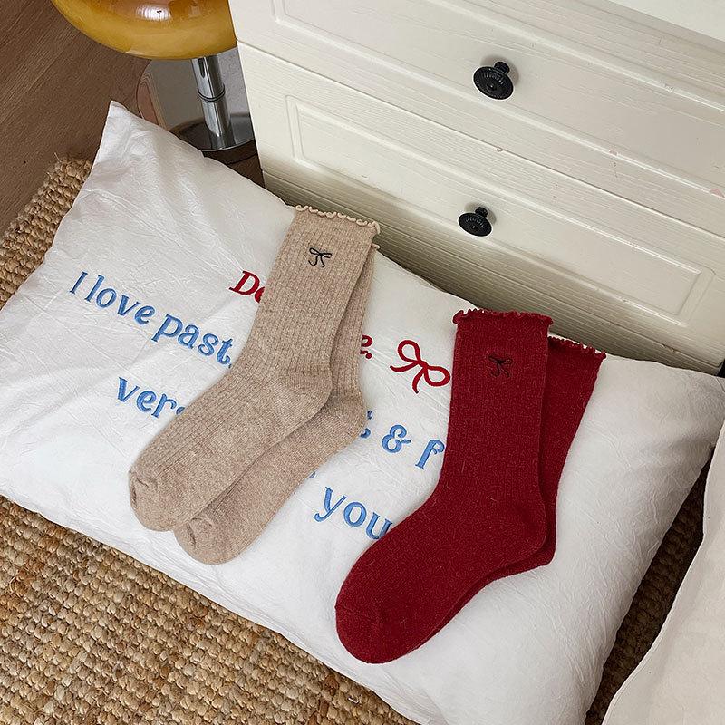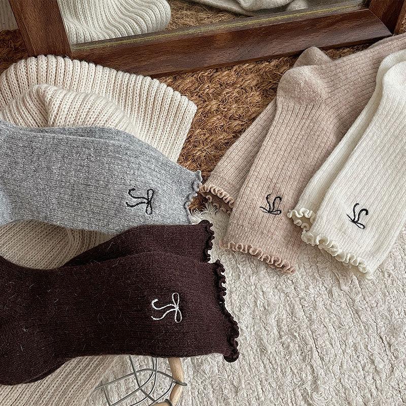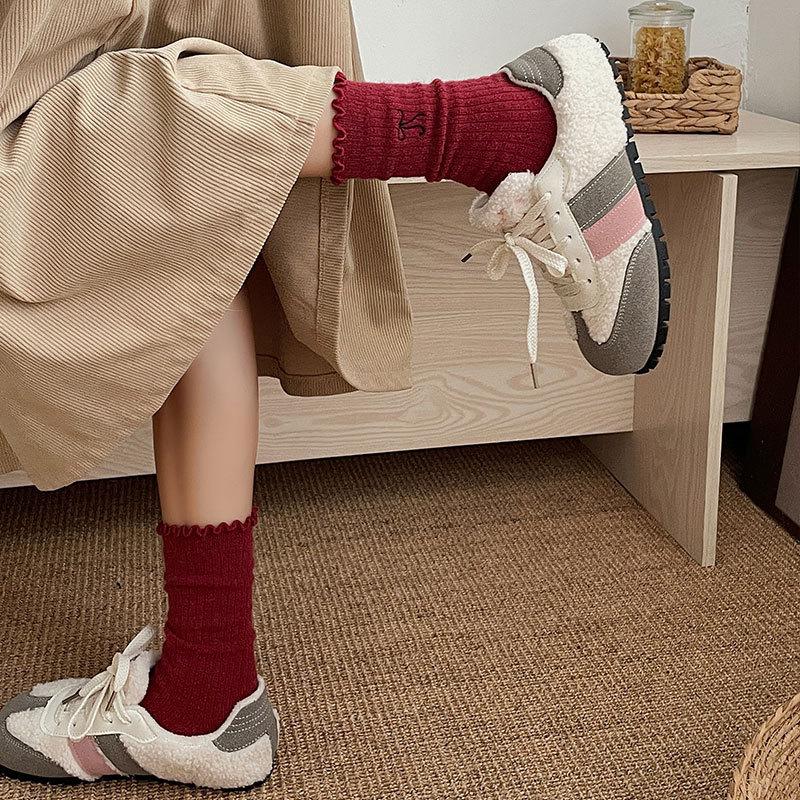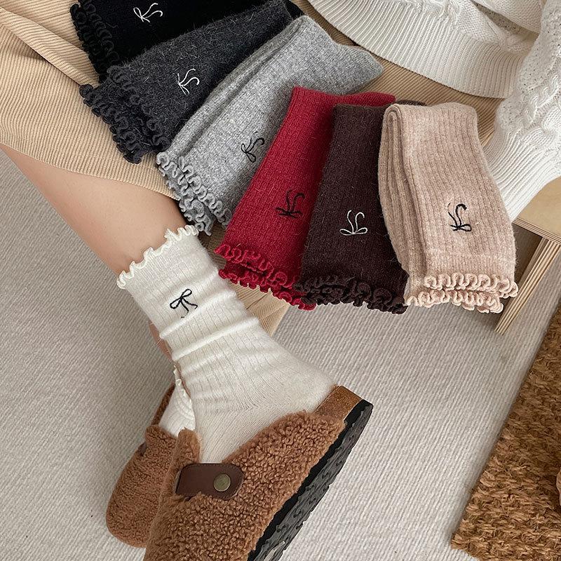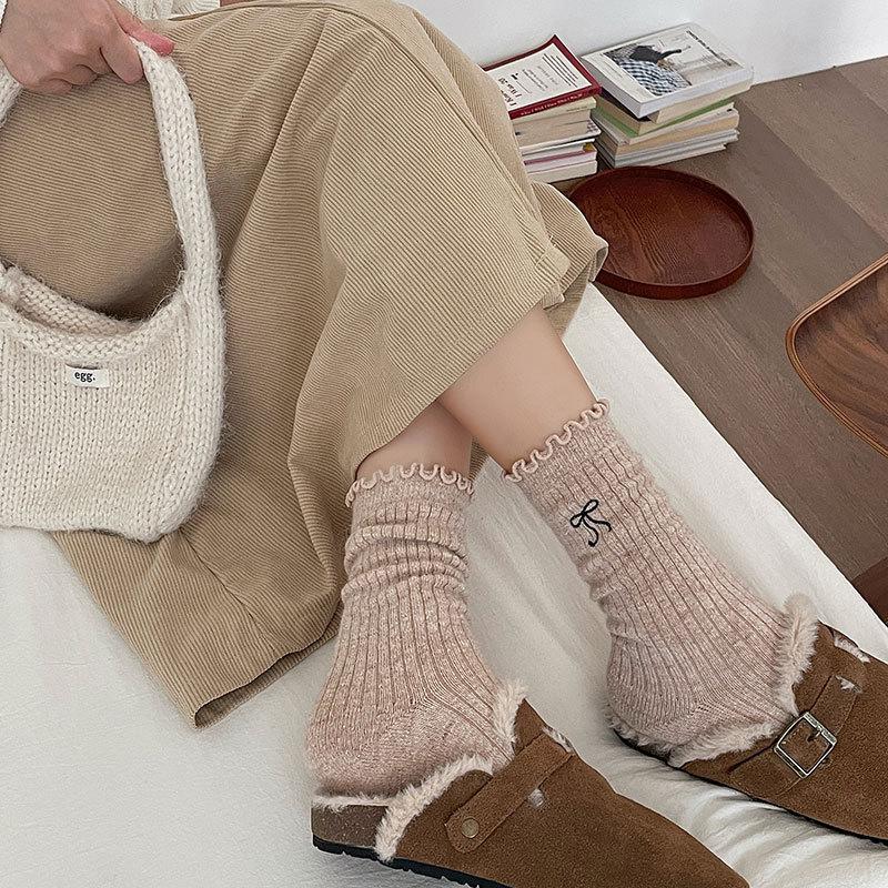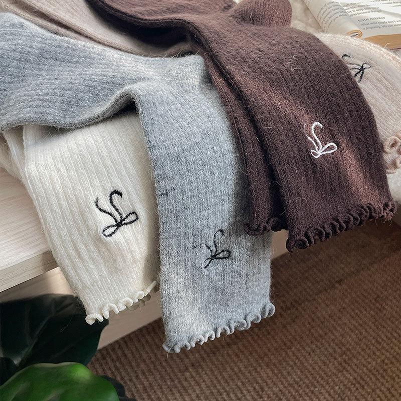 Calcetines de Lana de Invierno Bordado de Lazo Calcetines de Mujer Estilo Coreano Oreja de Madera Calcetines Medios Calcetines Gruesos Cálidos de Pelo de Conejo Apilados