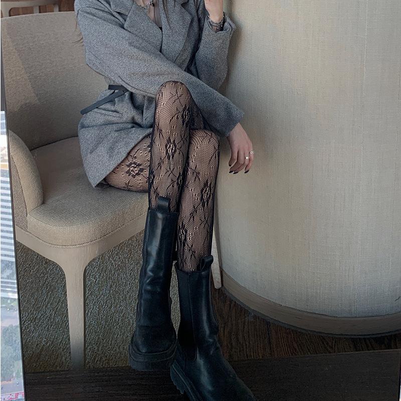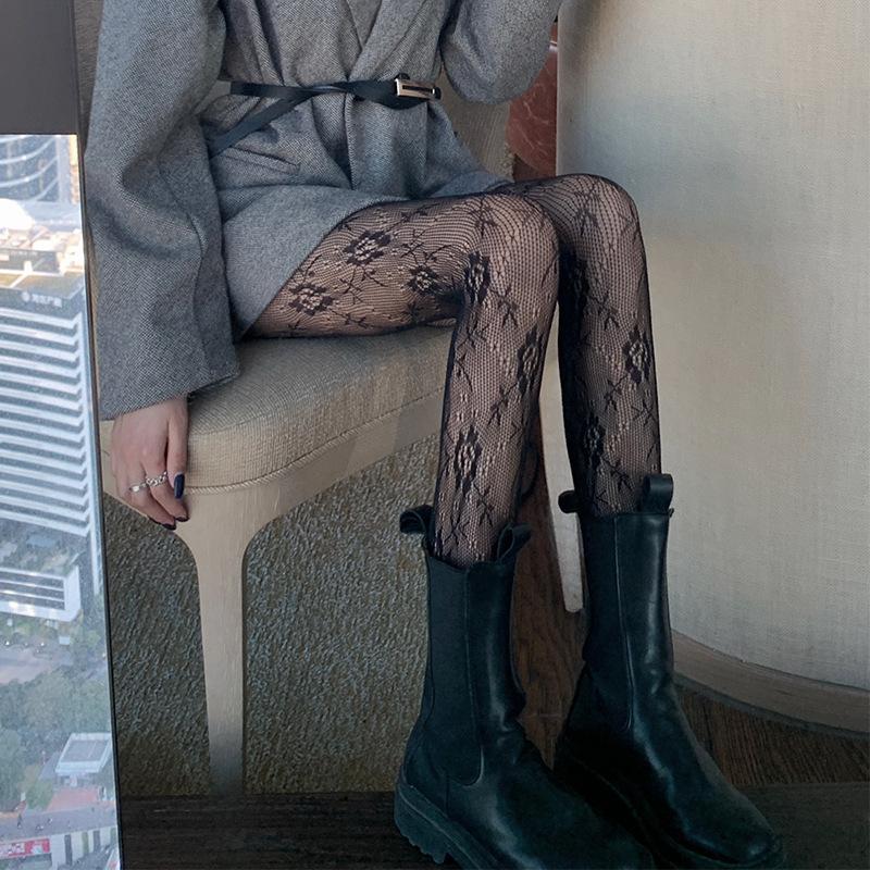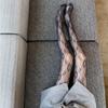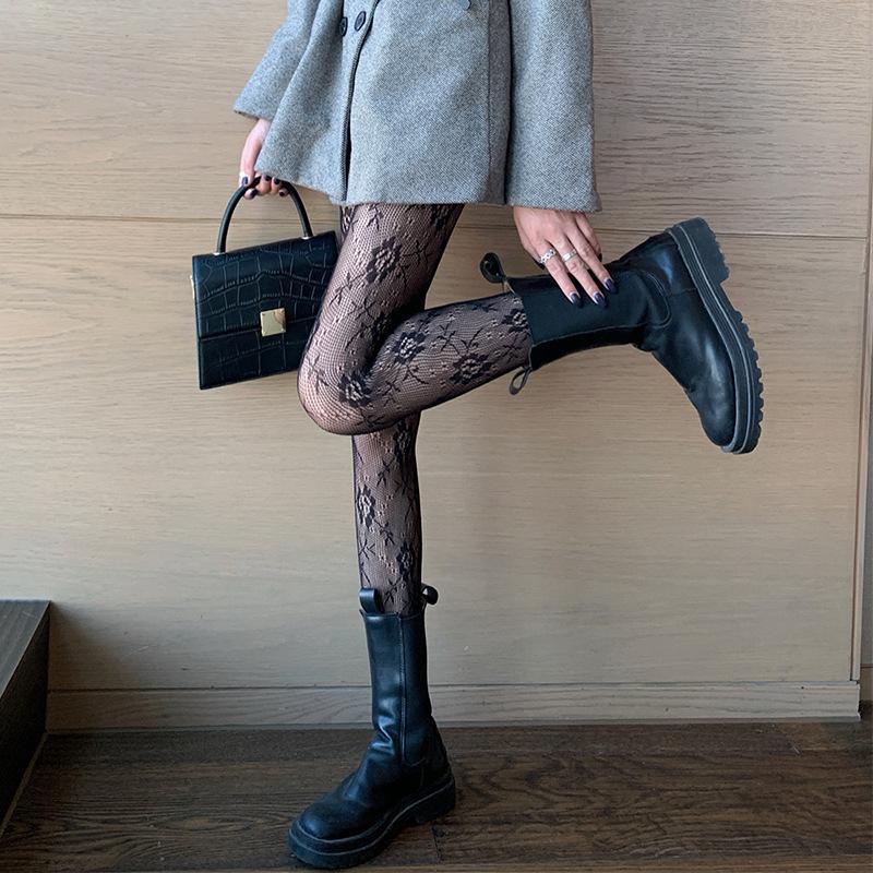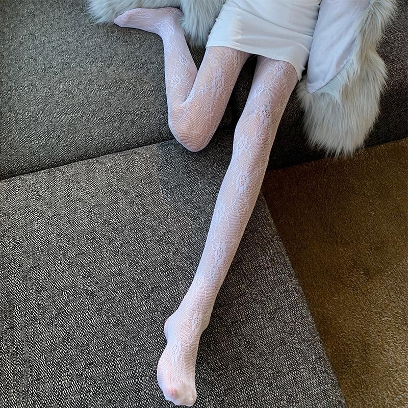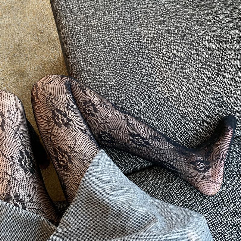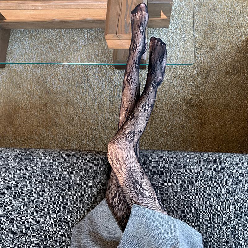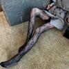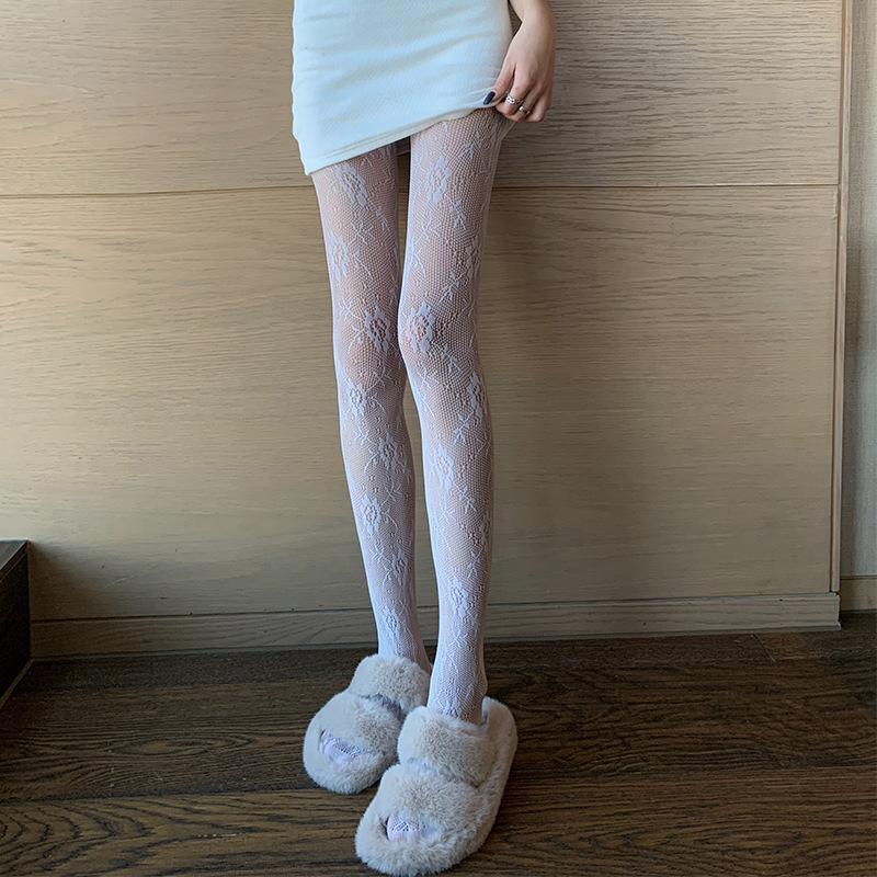 Medias de rejilla Spice Girls de seda negra con lazo hueco y estampado jacquard, pantimedias sexys de encaje oscuro antigancho