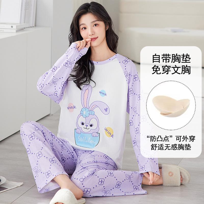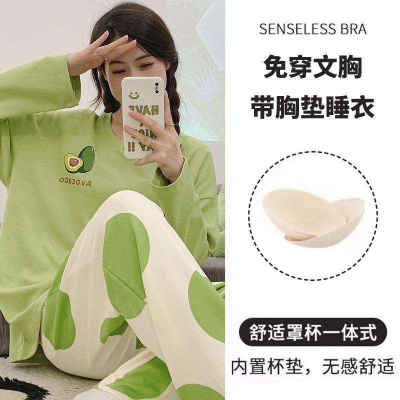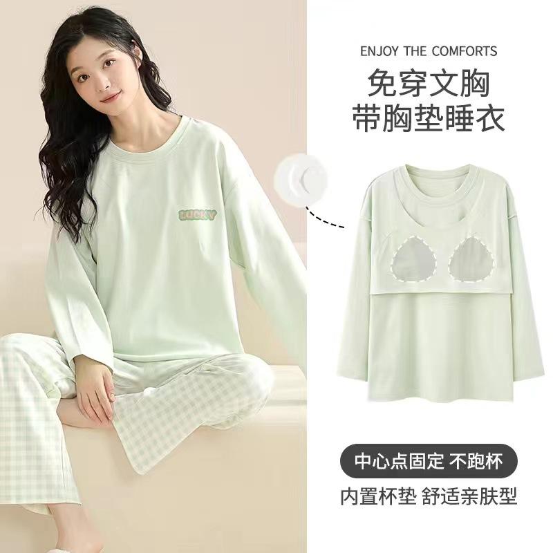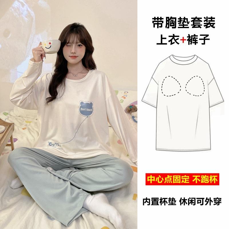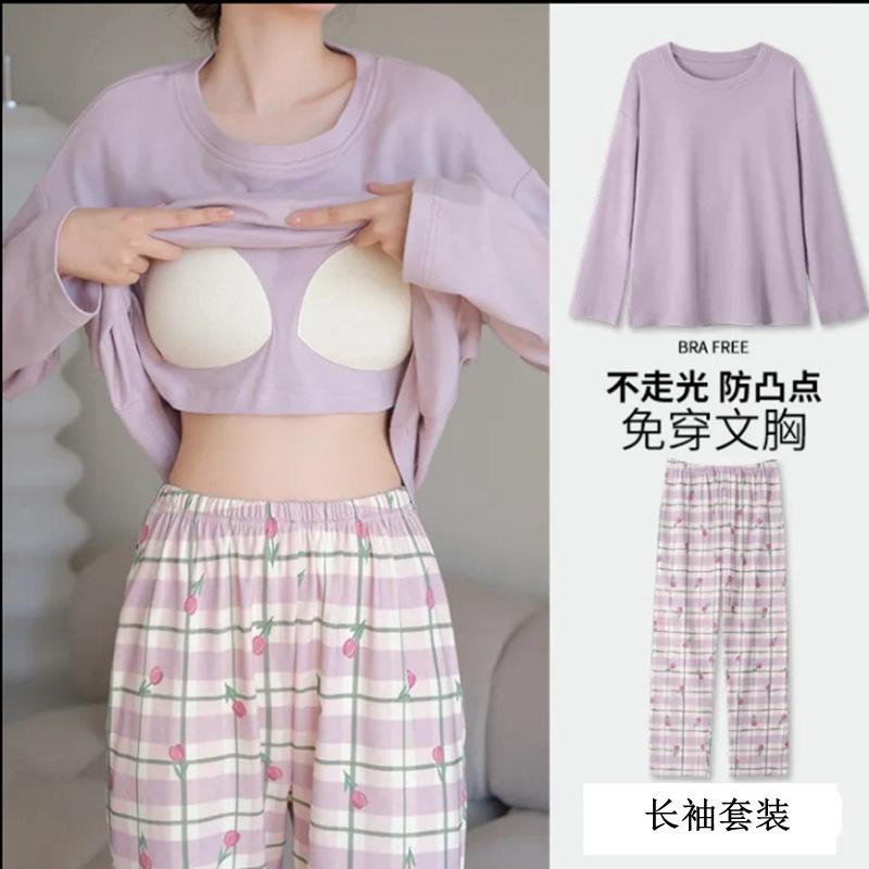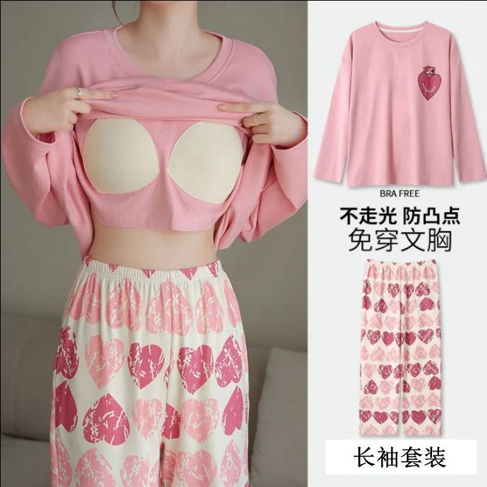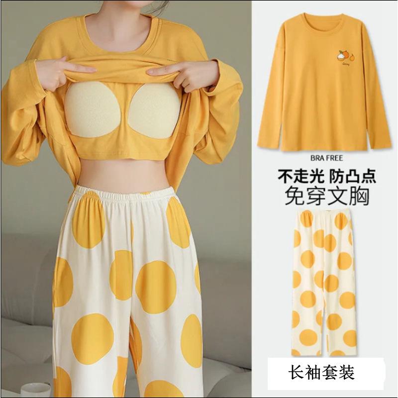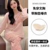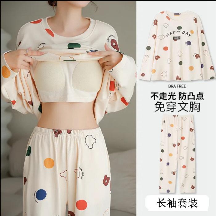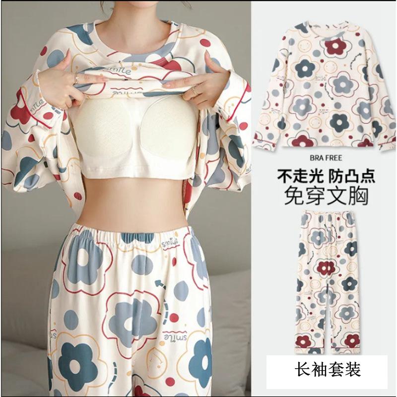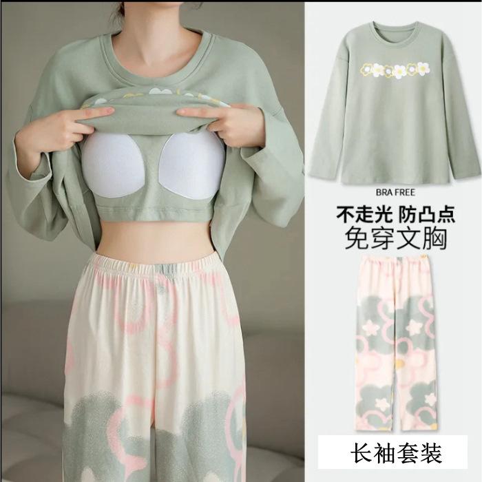 Pijama de exportación transfronteriza con almohadilla de pecho integrada, pijama de algodón de imitación 2025 nuevo para mujer, primavera y otoño, pantalones de manga larga, pijama para mujer