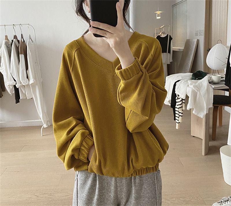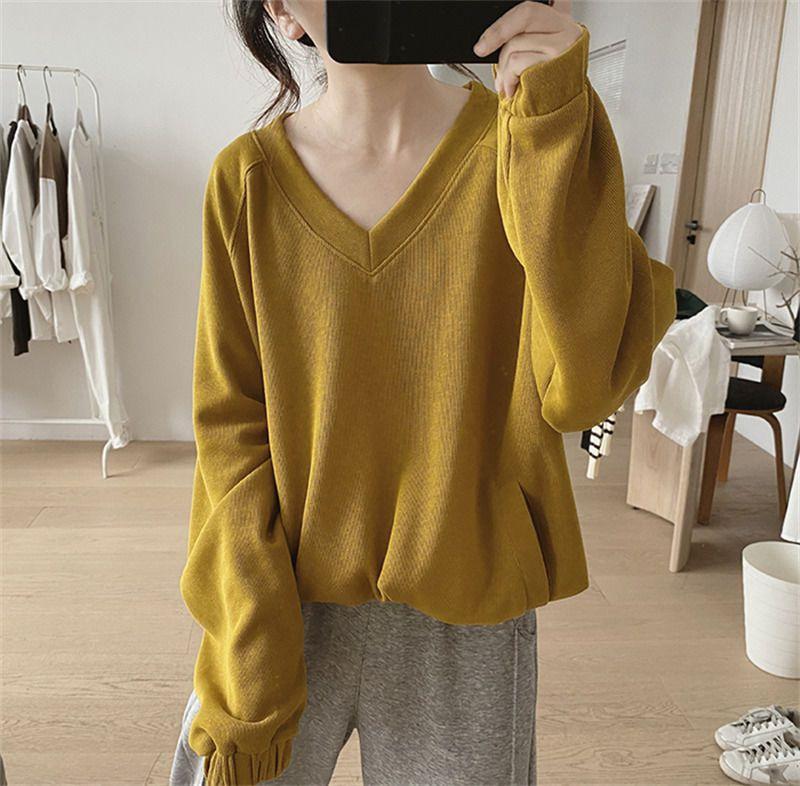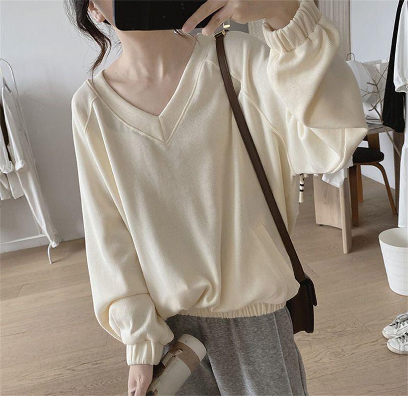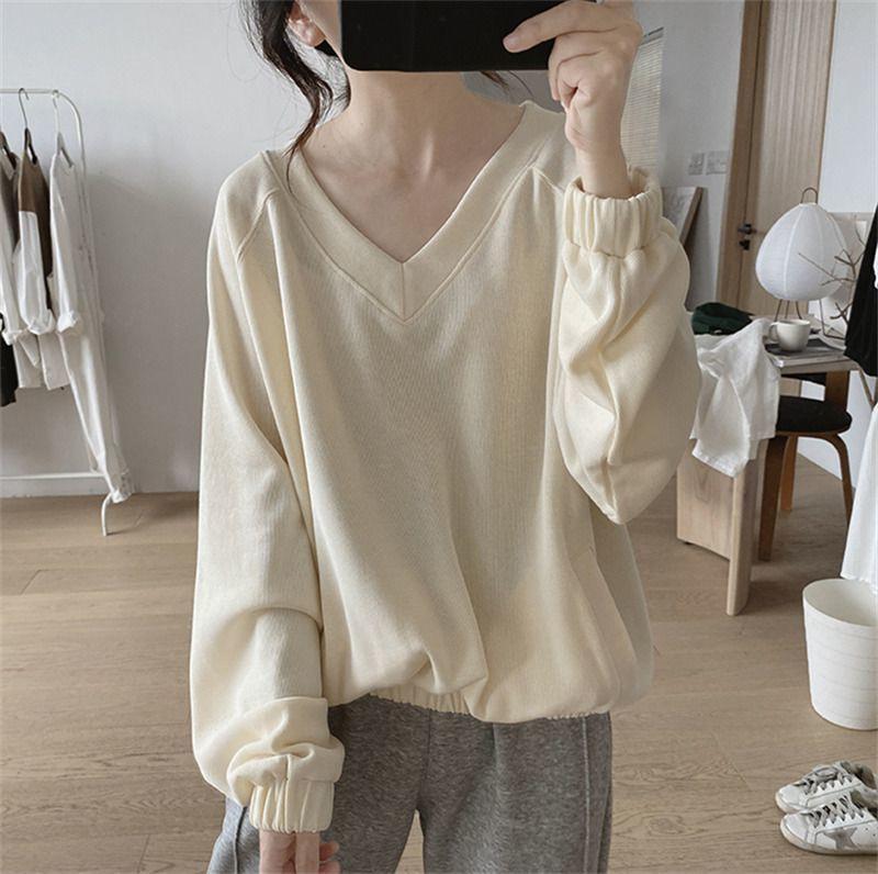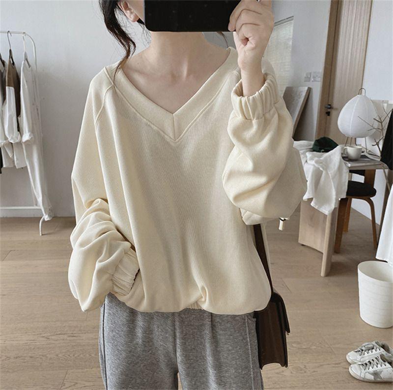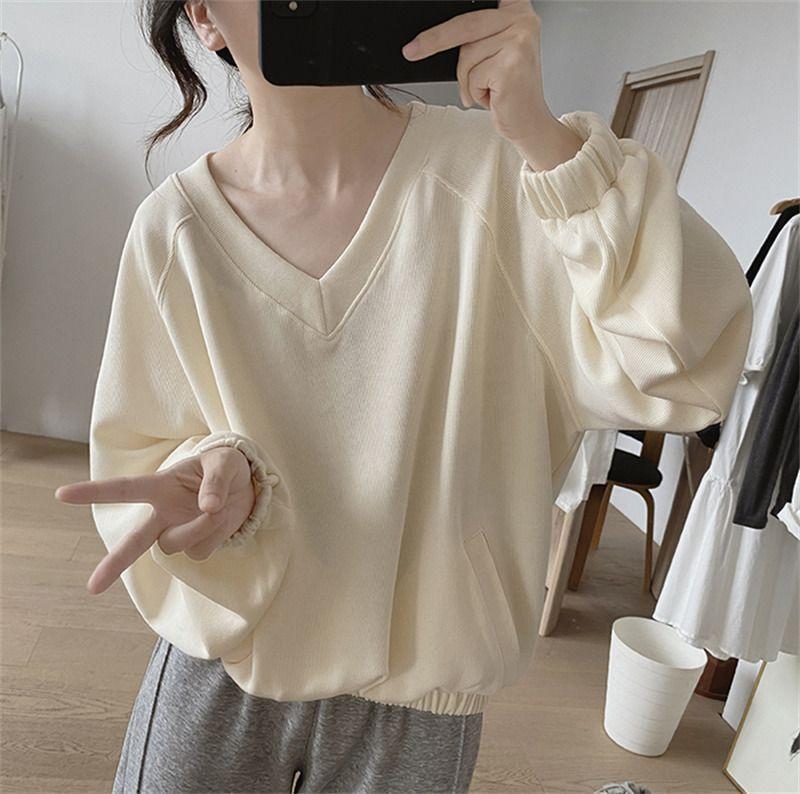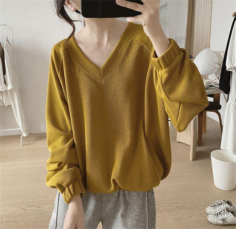 Nueva camiseta de manga larga con cuello en V japonesa y coreana de primavera 2025, suéter para mujer, top holgado de talla grande ajustado para mujer