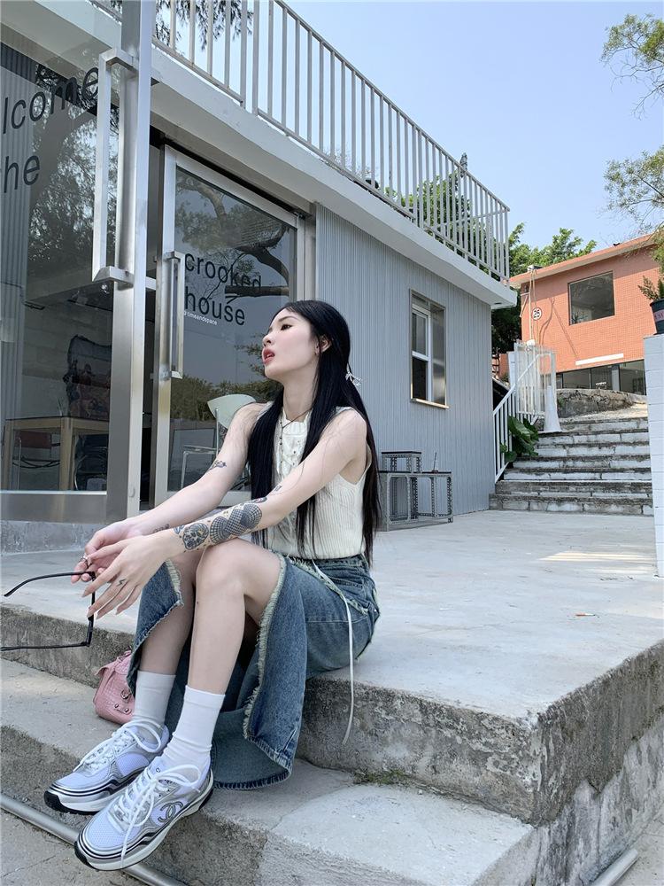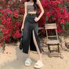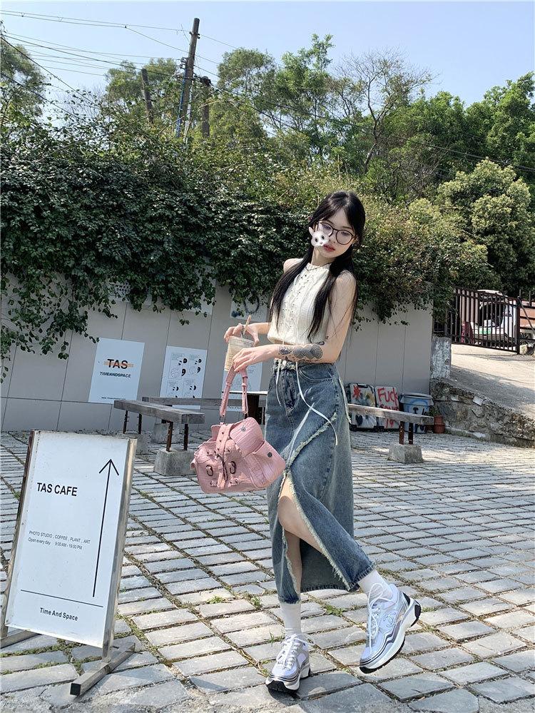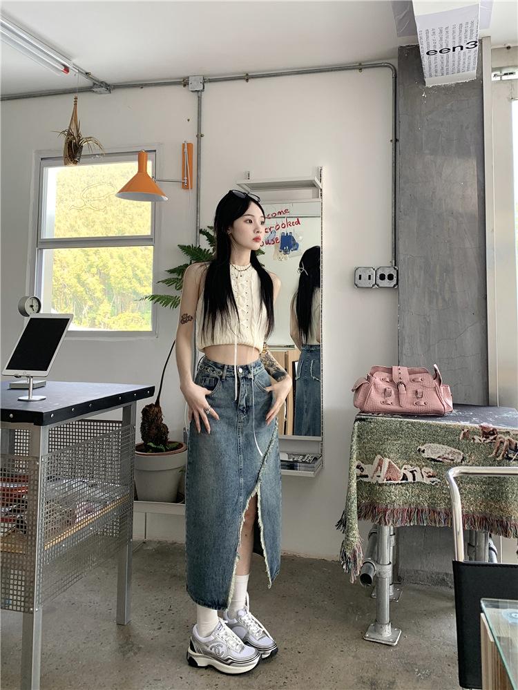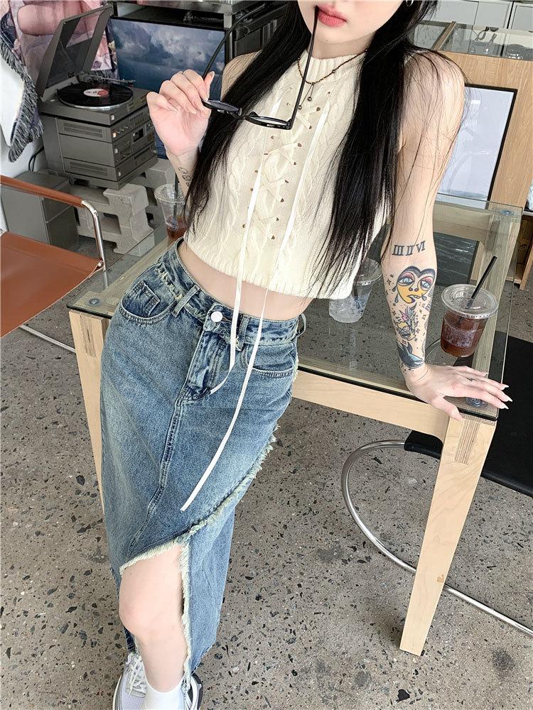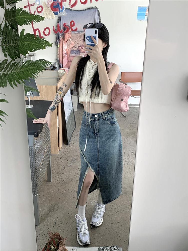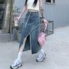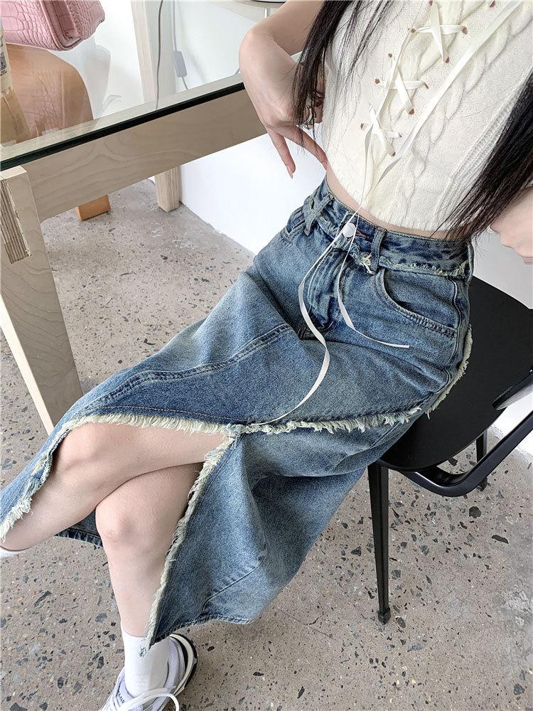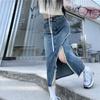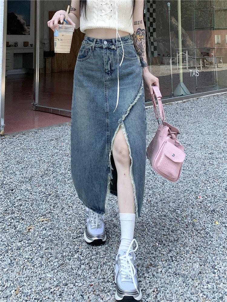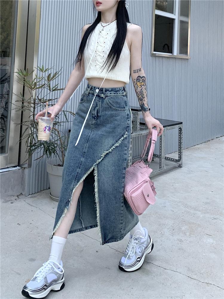 Falda vaquera irregular con abertura para mujer, estilo retro, estilo óxido, informal, de longitud media, cintura alta, corte A, estilo nicho a la cadera.