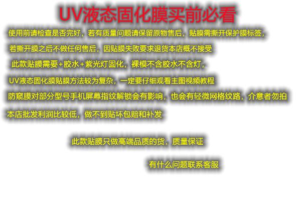 1. El protector de pantalla templado con pegamento UV es difícil de aplicar, se recomienda buscar un profesional para aplicarlo. El protector no será devuelto ni cambiado una vez usado. Si no sabe cómo aplicar el protector, por favor busque un profesional para que lo aplique por usted. Por favor, no aplique el protector basándose en su propia imaginación, para no causarse pérdidas innecesarias. ¡Gracias por su comprensión!