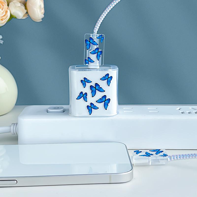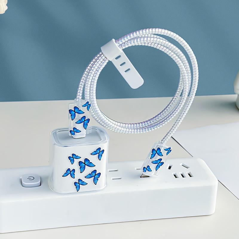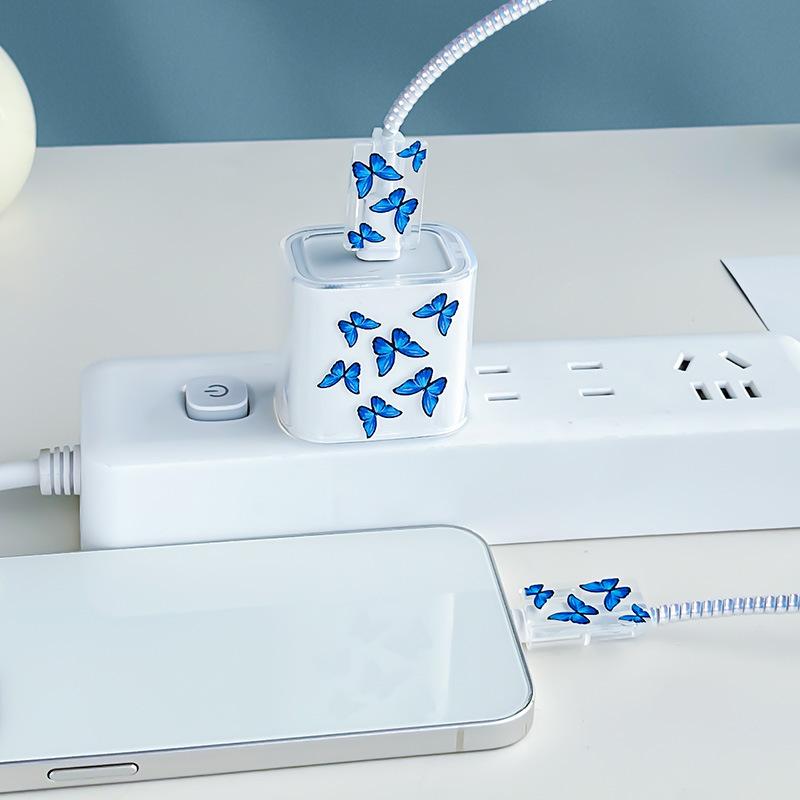 Adecuado para Cubierta Protectora de Cargador Apple 16/15 Protección de Cable de Datos para Teléfono Móvil Clip para Cable Protección contra Mordeduras de Cable Azul Mariposa
