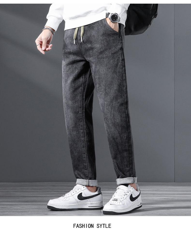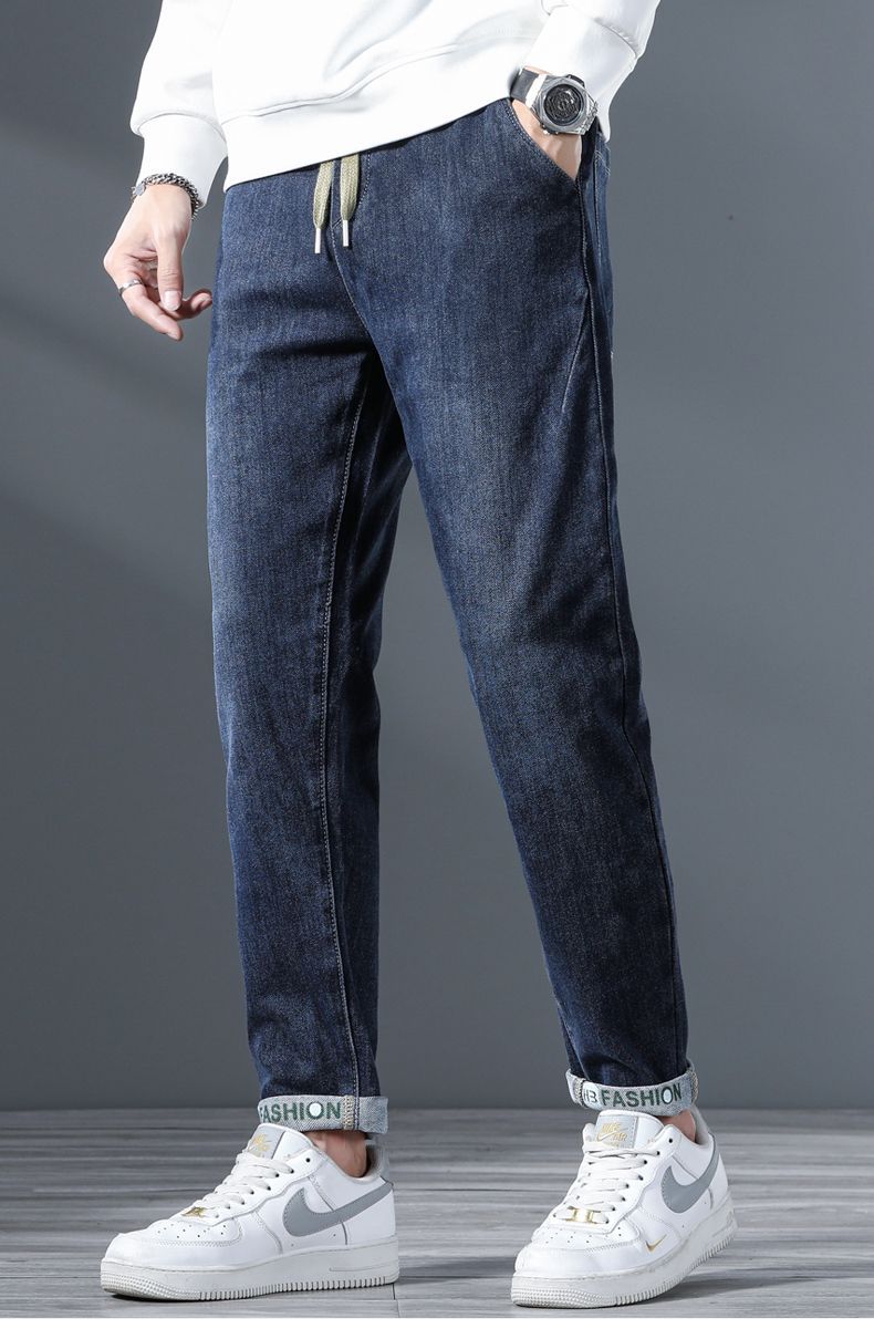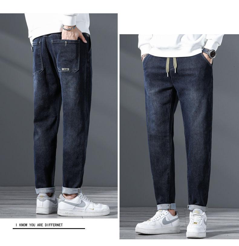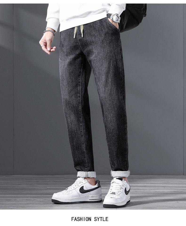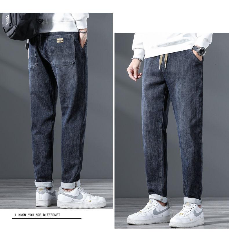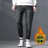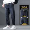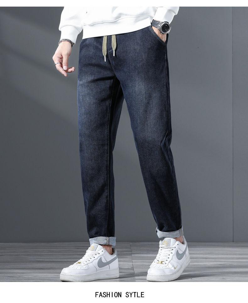 Pantalones vaqueros de alta gama con cintura elástica y forro polar para hombre, otoño e invierno, nuevos, sueltos, rectos, con cordón elástico, casuales, largos para hombre.