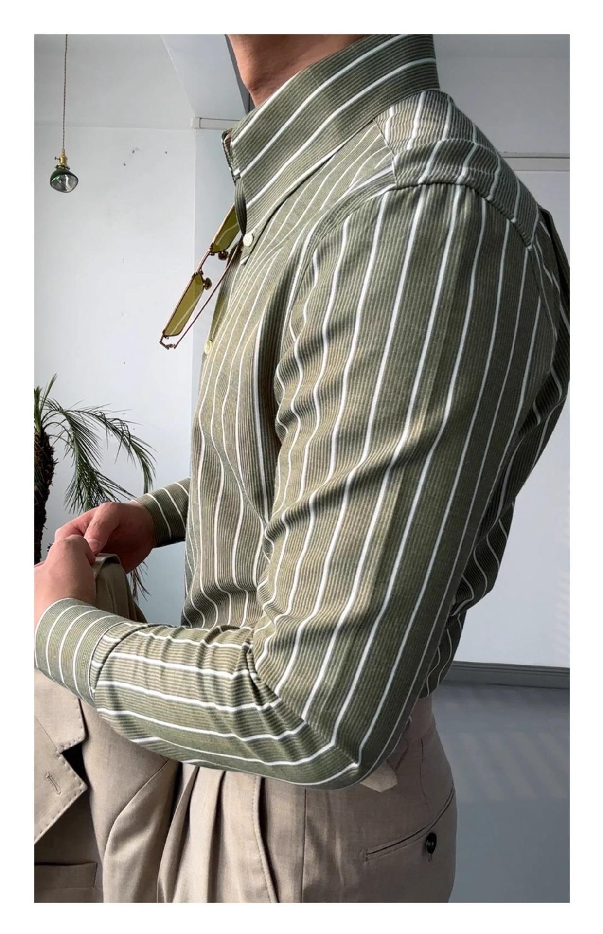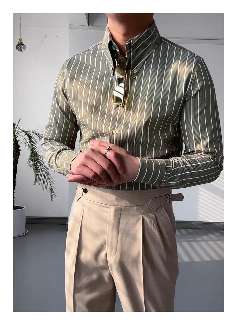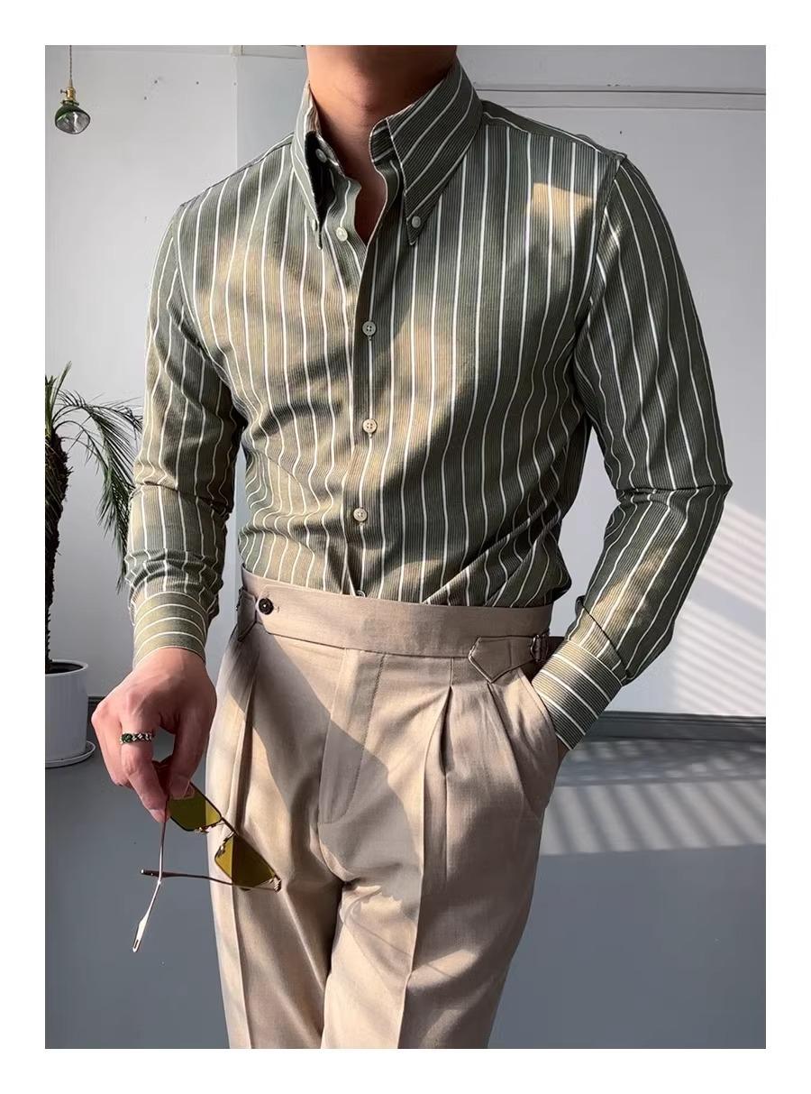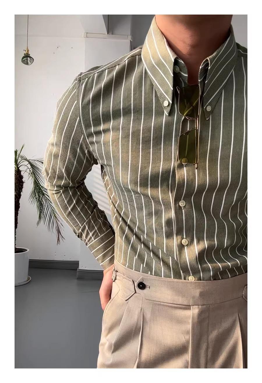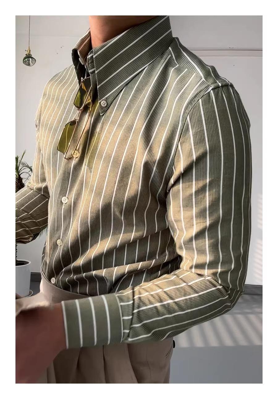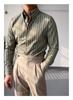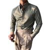 Camisa informal de negocios de otoño a rayas de manga larga con botones verdes retro italianos, camisa de cuello largo de punta, elegante y distintiva, de corte entallado.