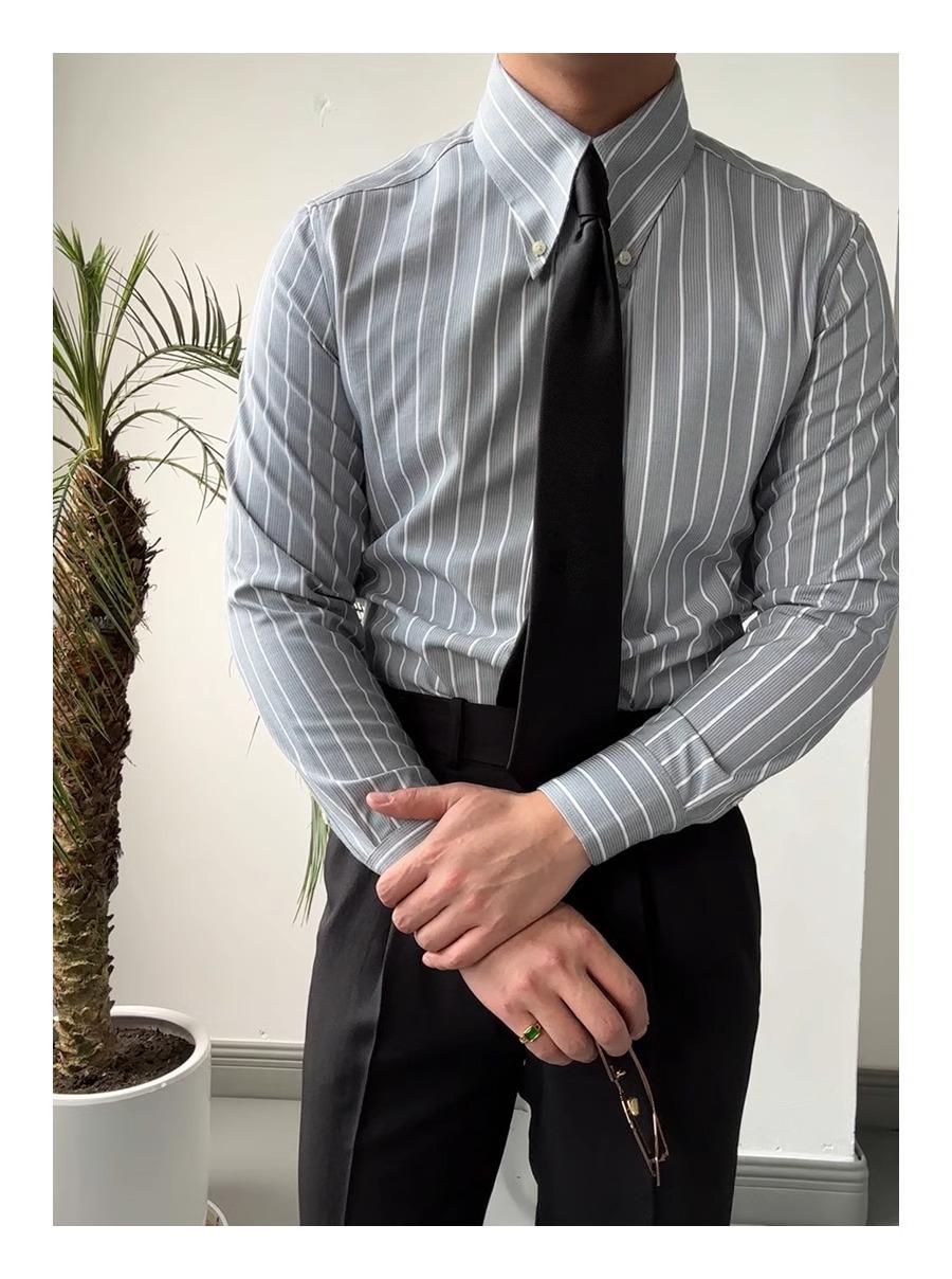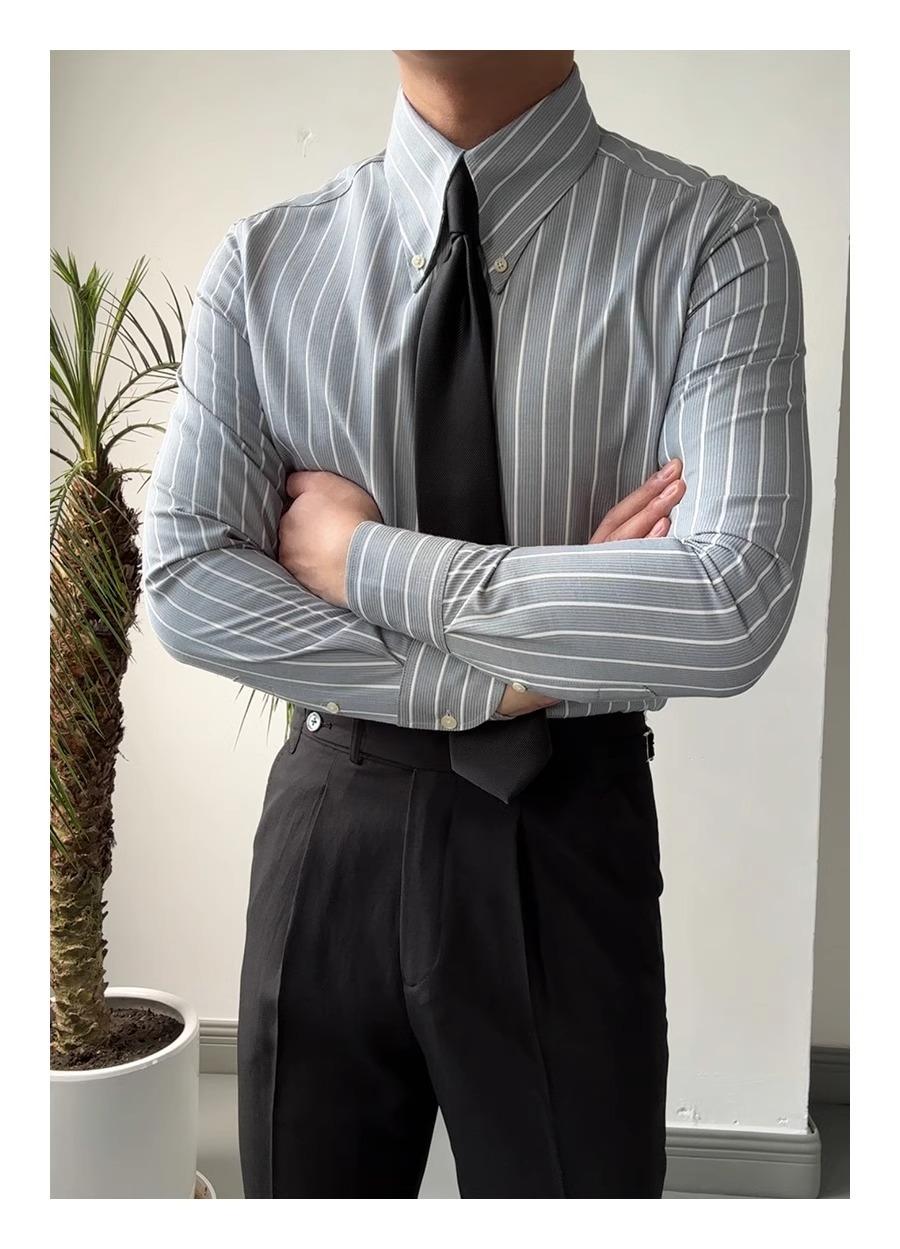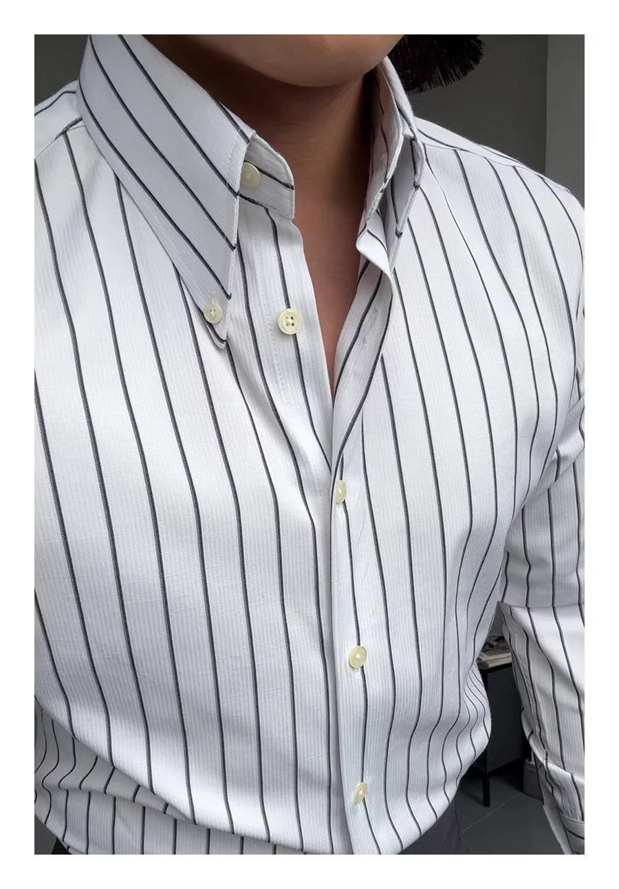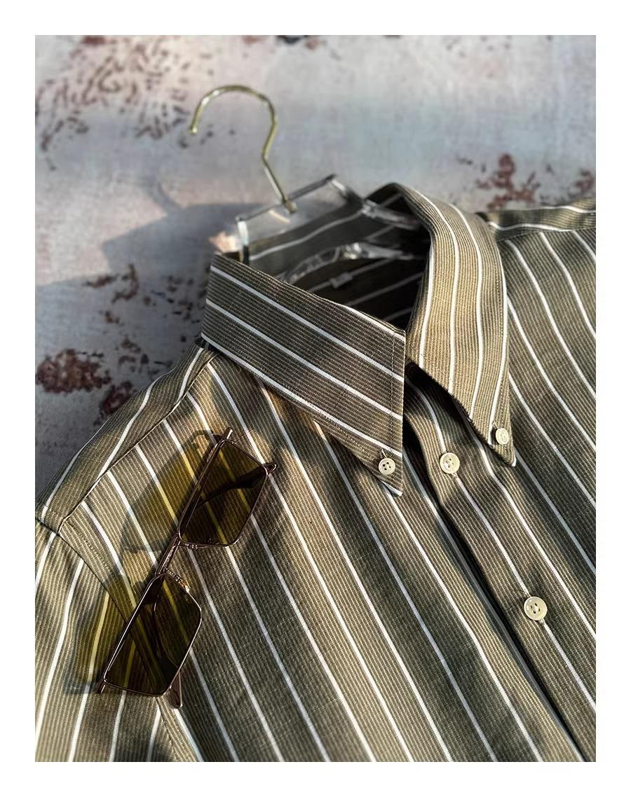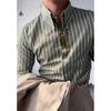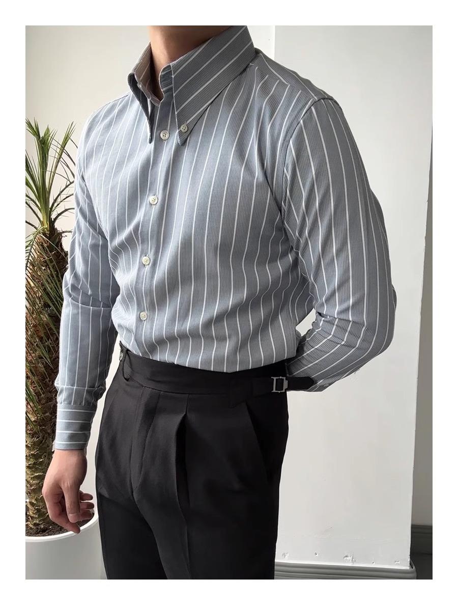 Camisa informal de negocios de otoño a rayas de manga larga con botones verdes retro italianos, camisa de cuello largo de punta, elegante y distintiva, de corte entallado.