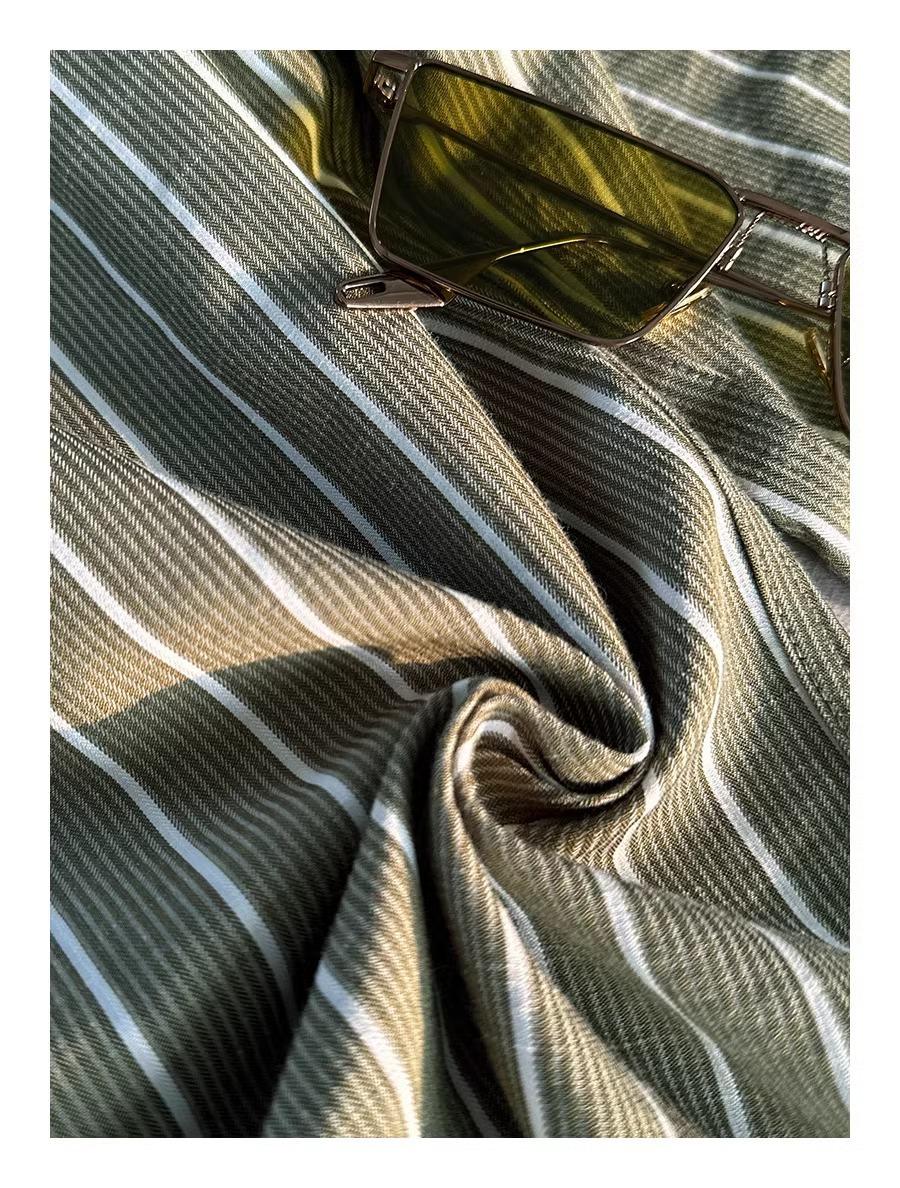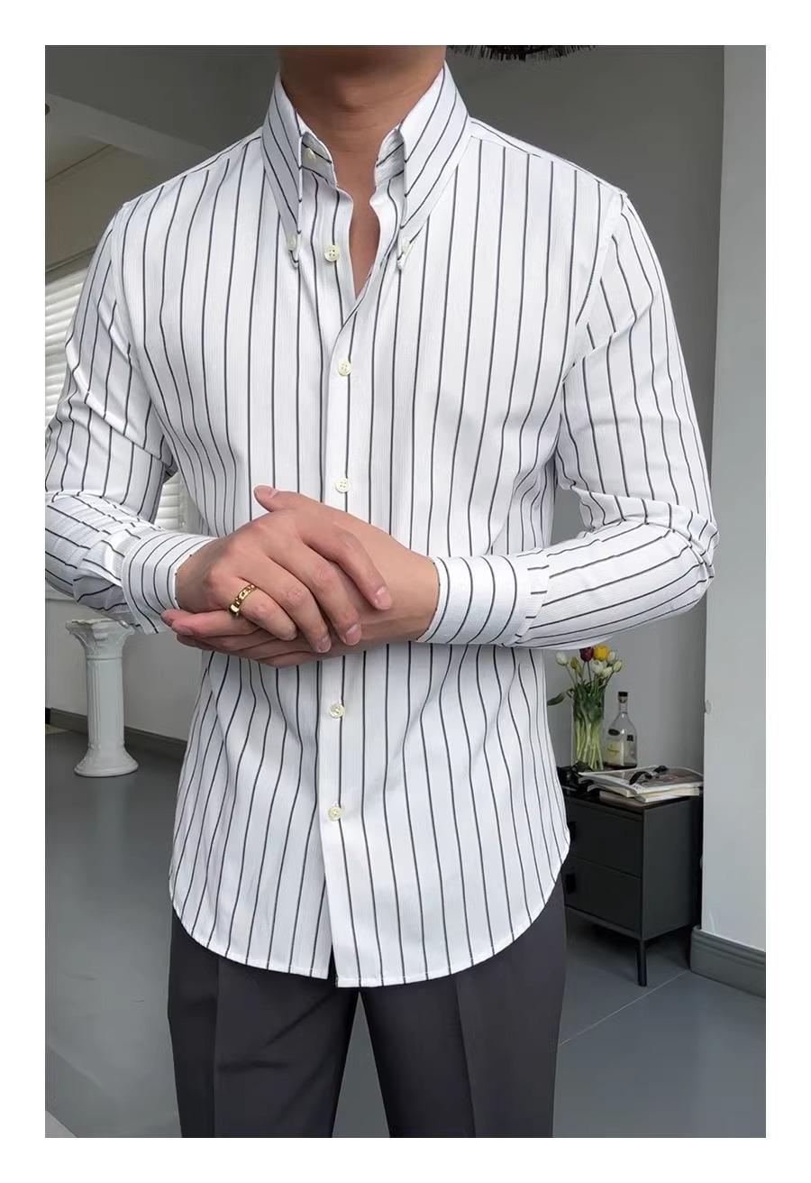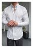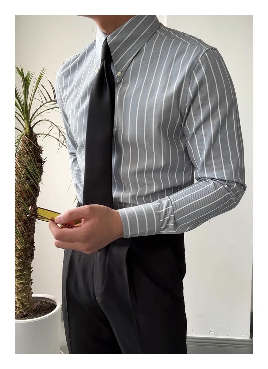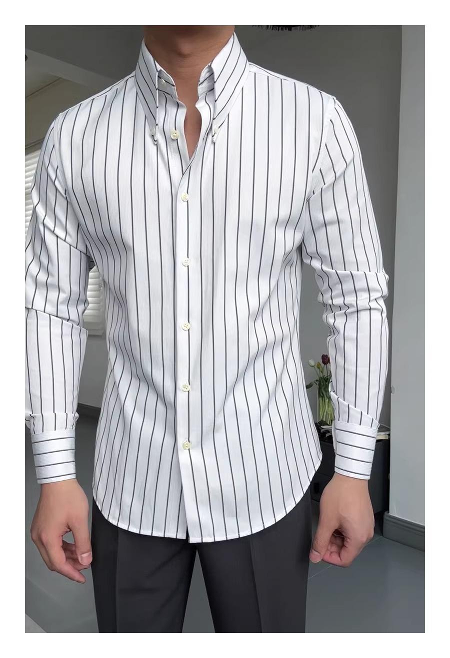 Camisa informal de negocios de otoño a rayas de manga larga con botones verdes retro italianos, camisa de cuello largo de punta, elegante y distintiva, de corte entallado.