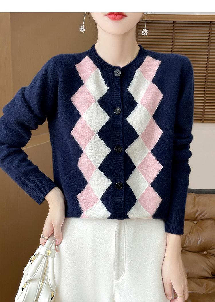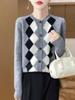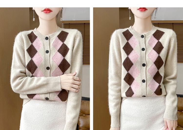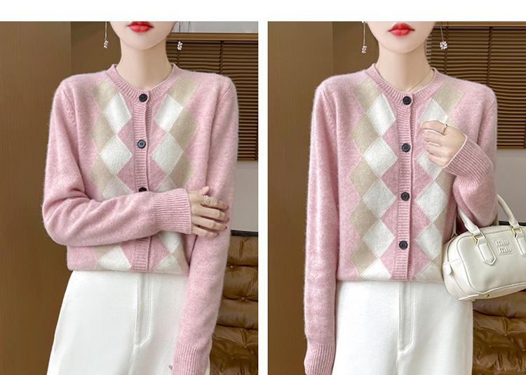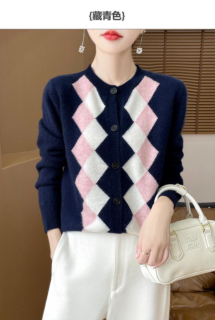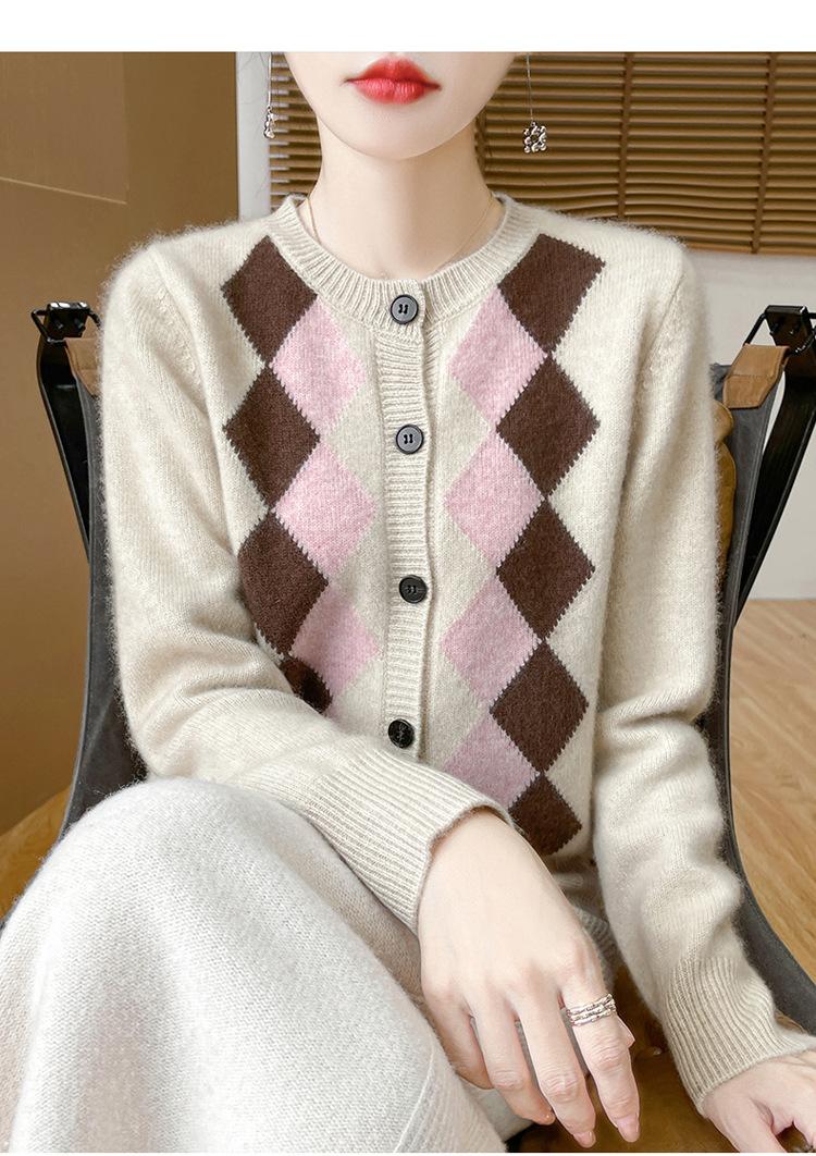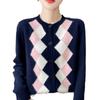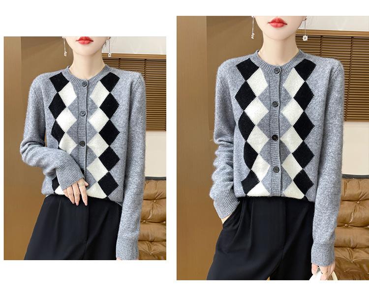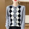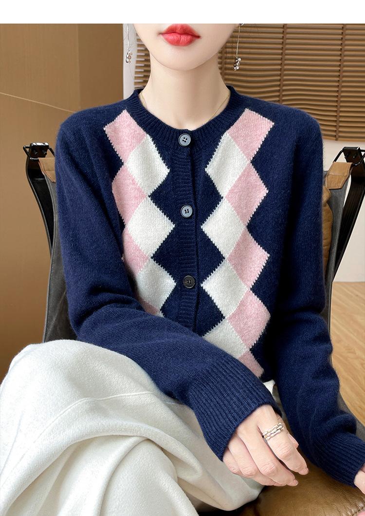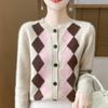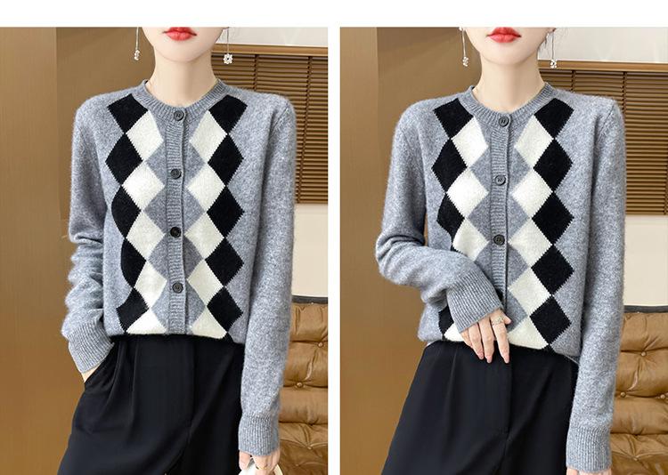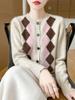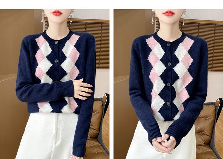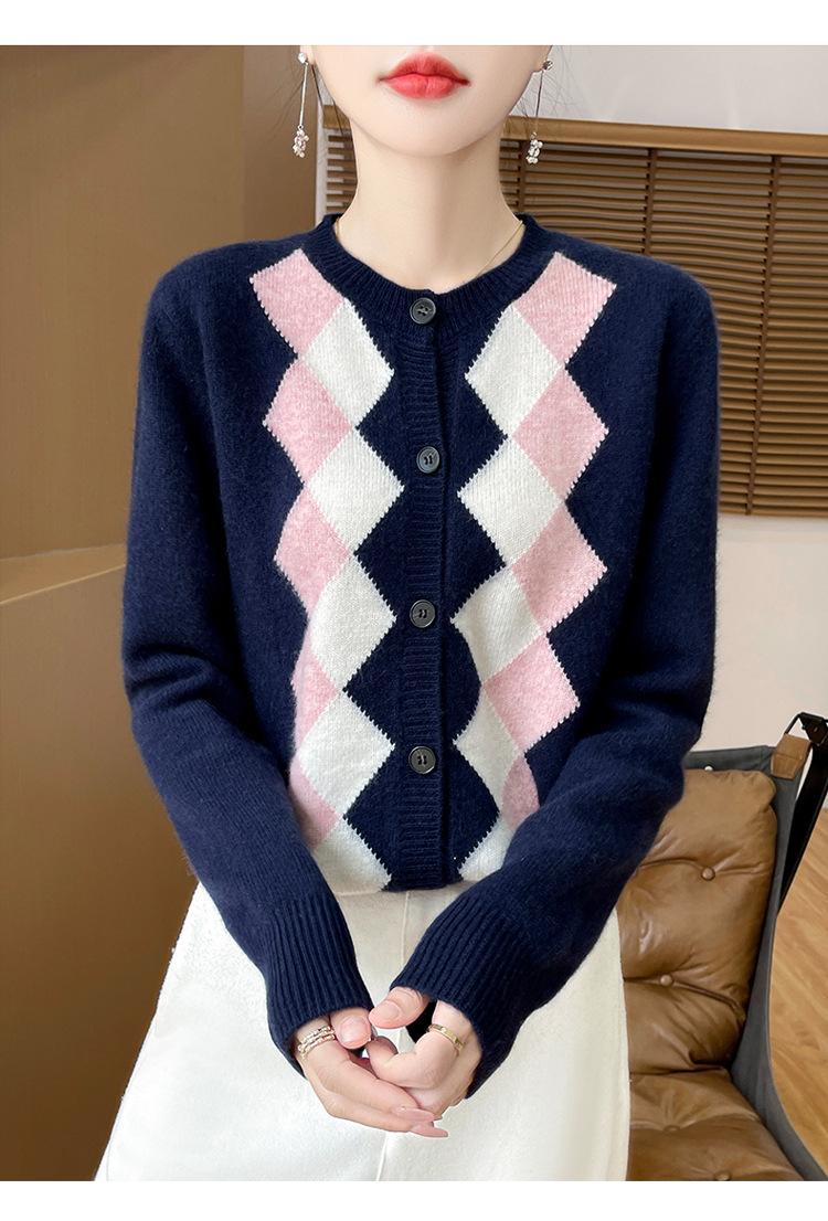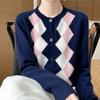 Cárdigan de punto vintage con diseño de nicho en forma de diamante y contraste, nuevo y fresco, informal, de lana pura para mujer.