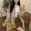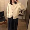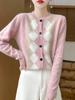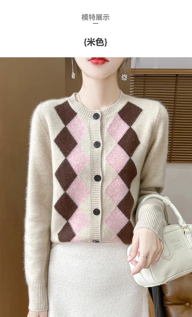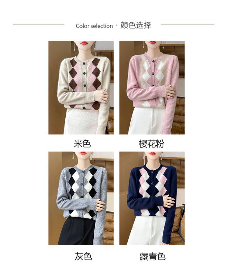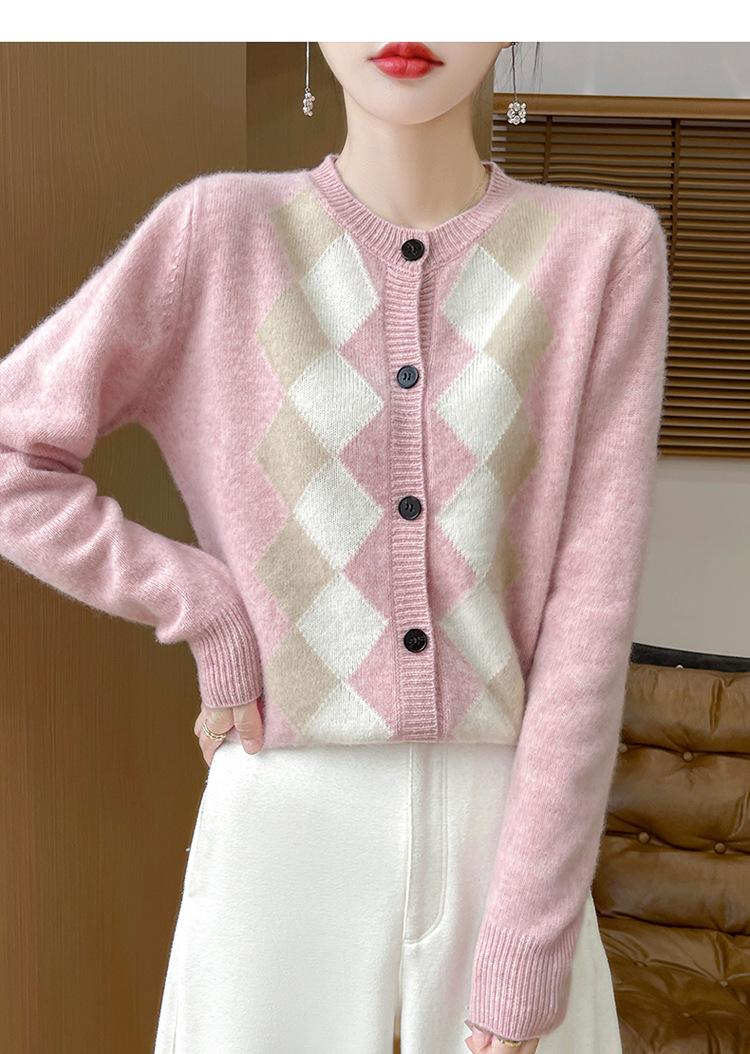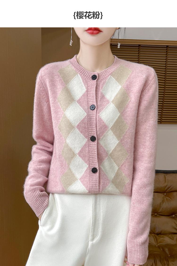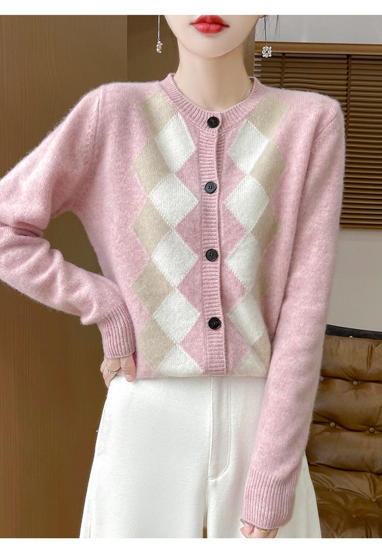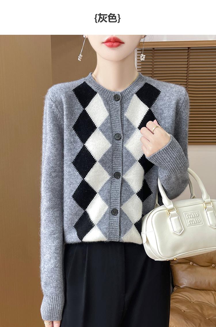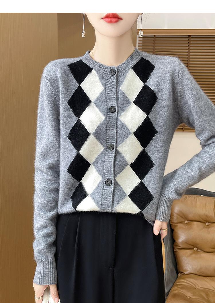 Cárdigan de punto vintage con diseño de nicho en forma de diamante y contraste, nuevo y fresco, informal, de lana pura para mujer.