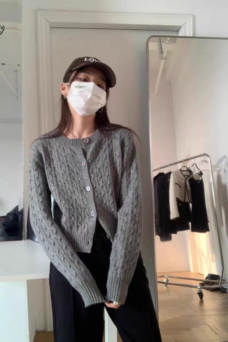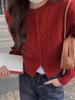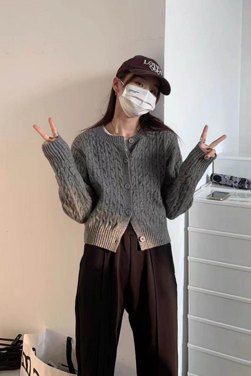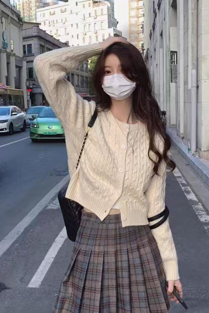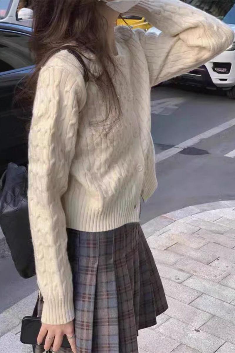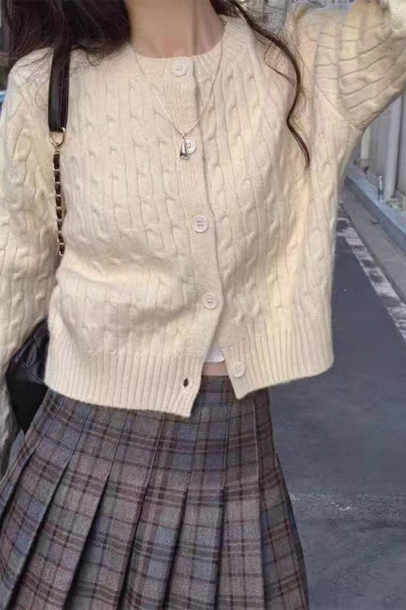 Cárdigan de Cachemira Trenzado Retro Francés para Mujer Cuello Redondo Elegante Ajustado Abrigo Suéter Corto Camisa Base de Lana Tejida