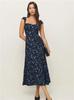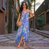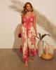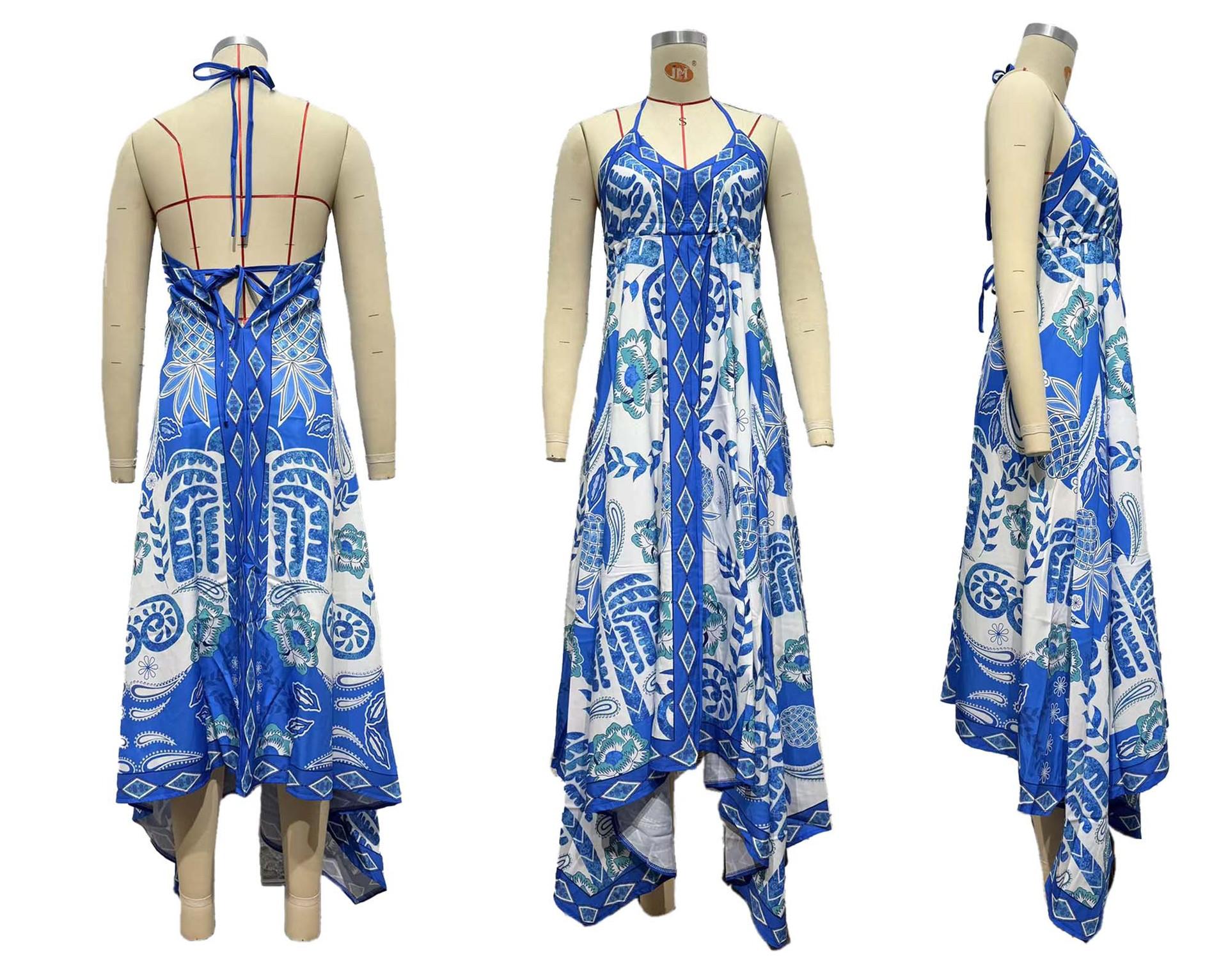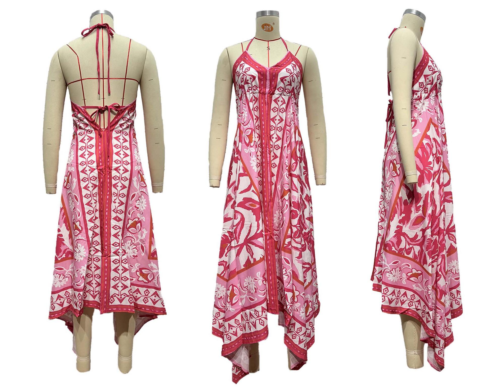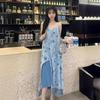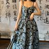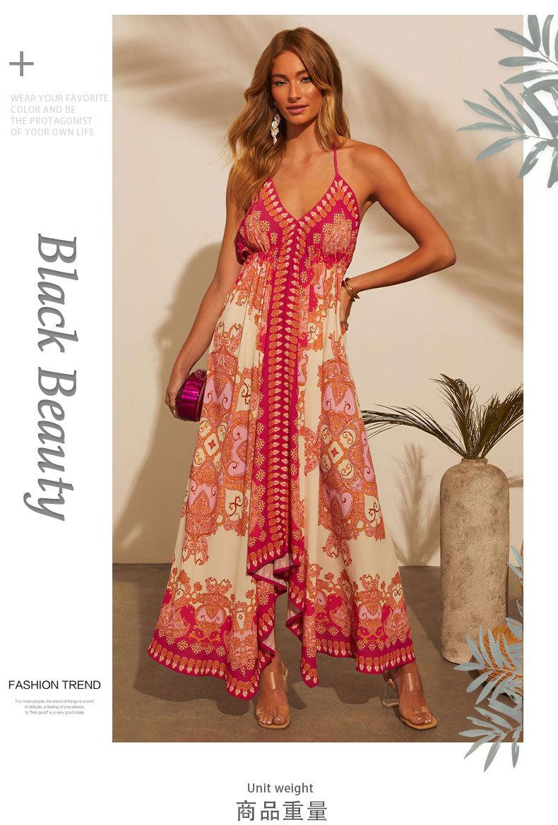 2025 Nuevo Primavera y Verano Hombro Descubierto Cuello en V Vestido de Tirantes Estampado de Hada Largo Temperamento Vestido de Vuelo Grande para Mujer
