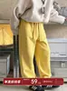 Lu Xi Pantalones de Chándal de Terciopelo Grueso con Cordón Estilo Americano para Mujer 2025 Otoño e Invierno Nuevo Suelto Amarillo Leggings Pantalones de Chándal 2833