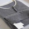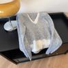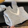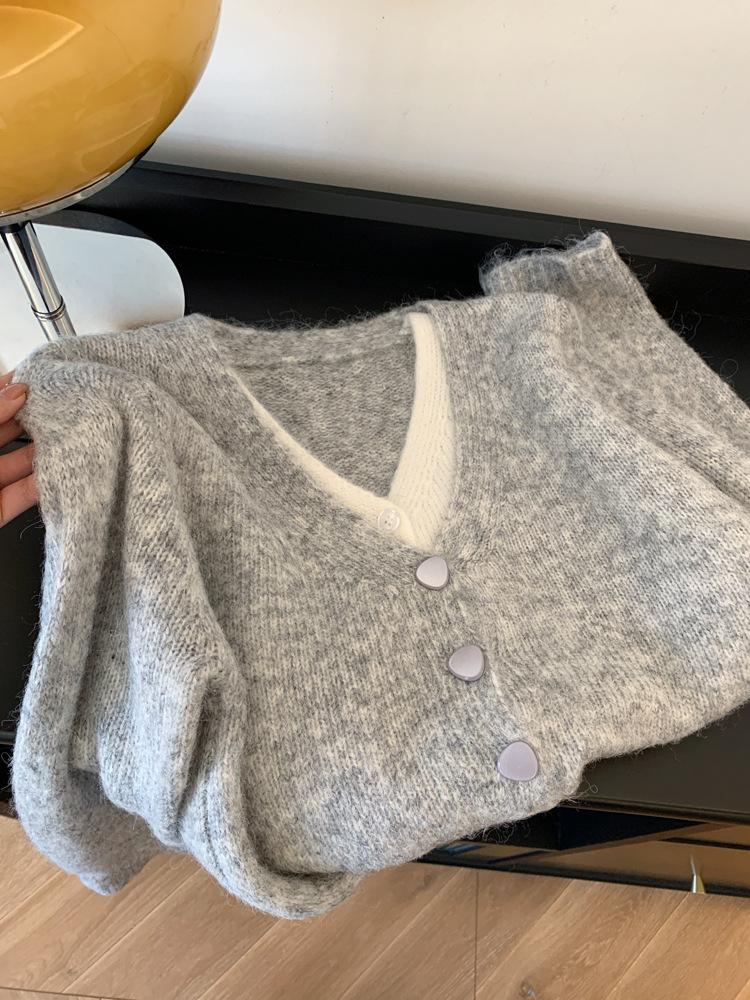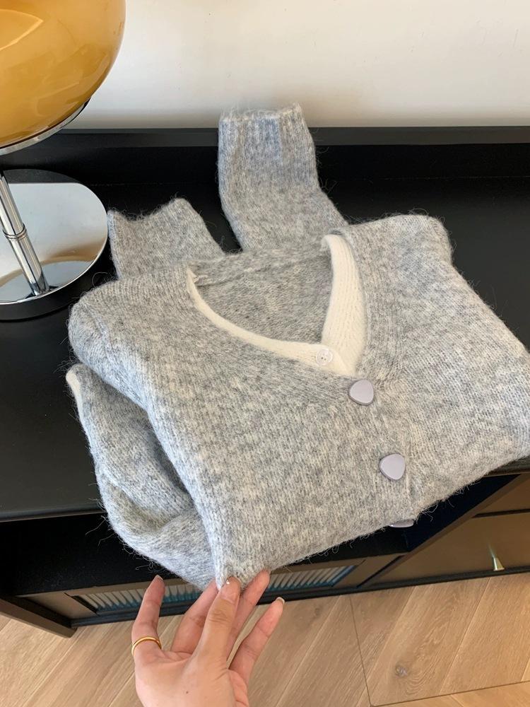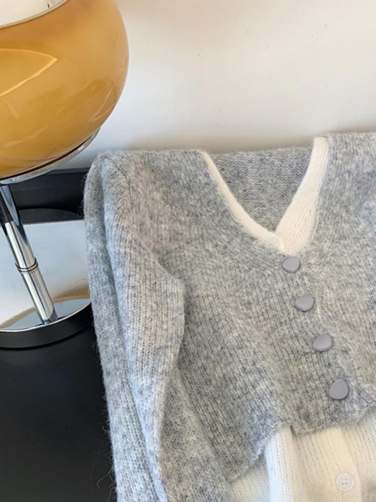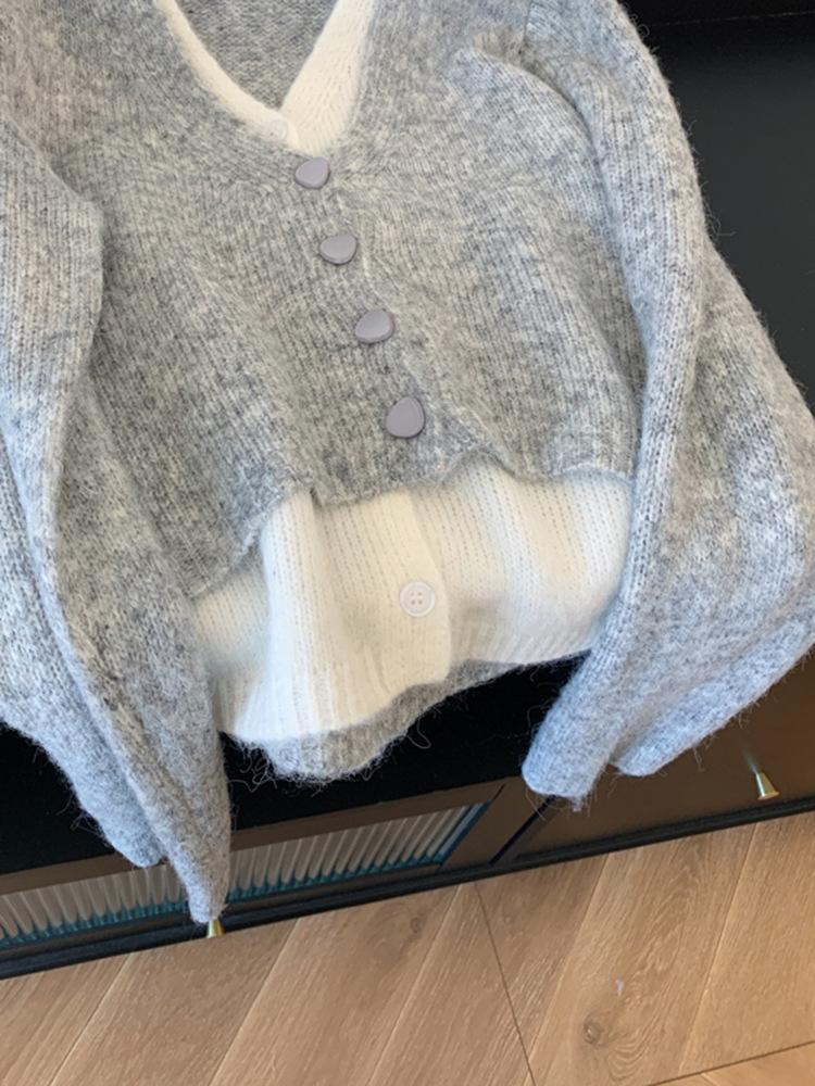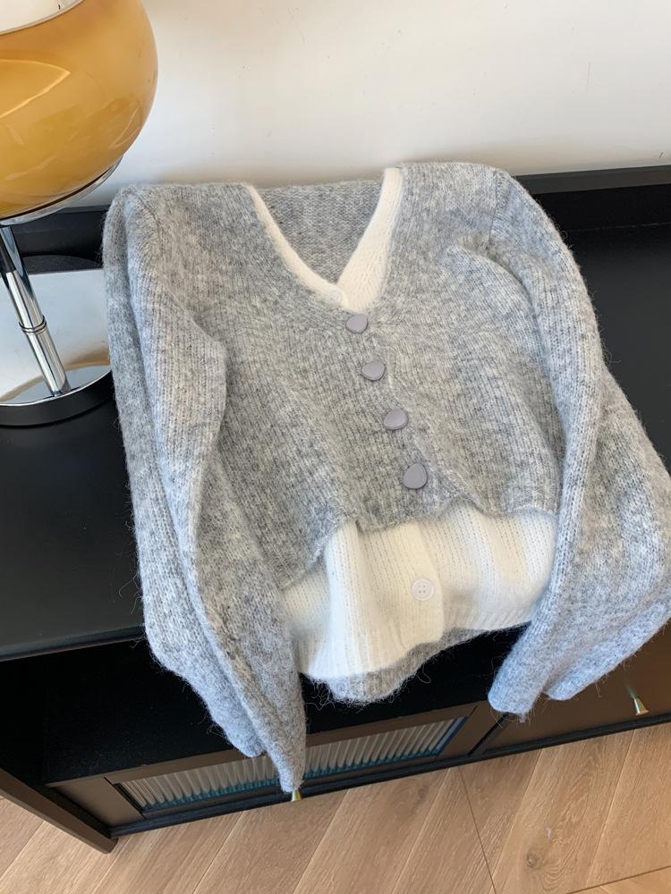 Suéter cárdigan de punto elegante con cuello en V gris de dos piezas falso para mujer, estilo holgado pequeño, estilo coreano de otoño.