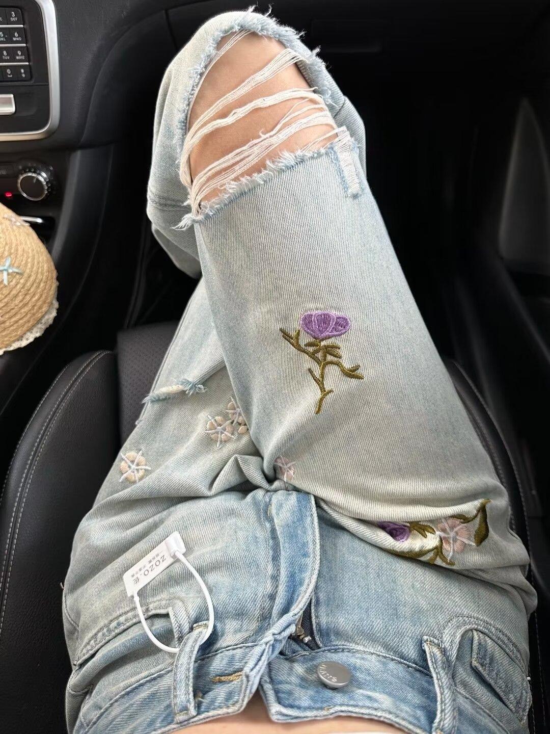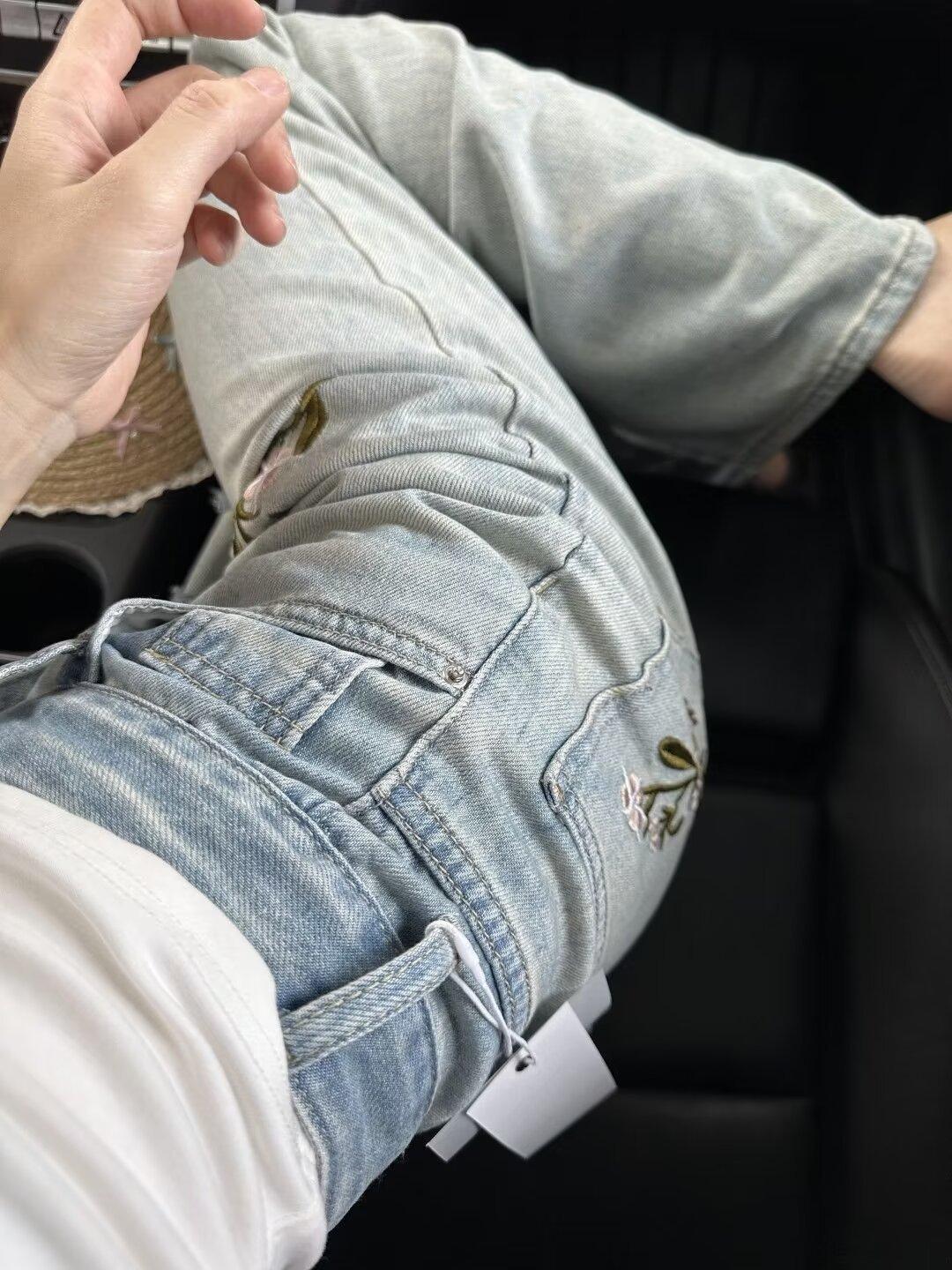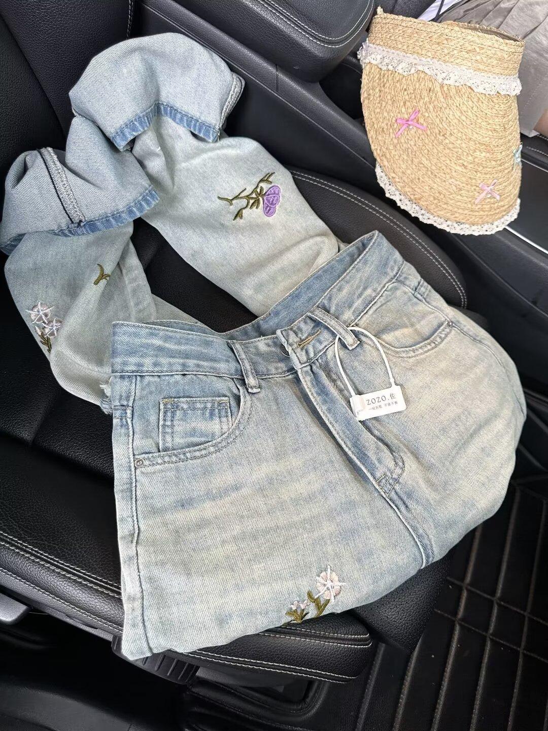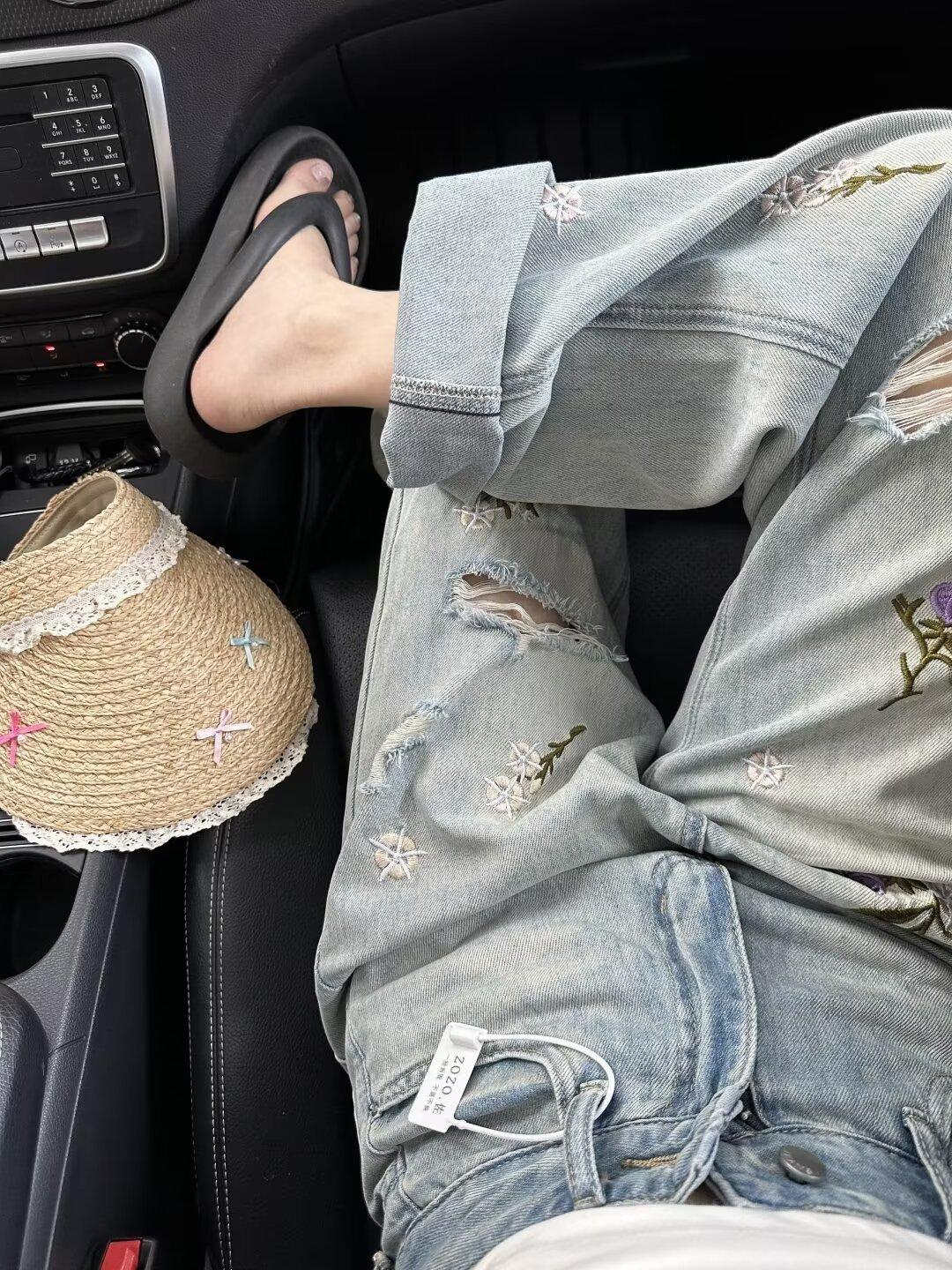 Pantalones vaqueros de verano 2024 para mujer, nuevos, estilo coreano, industria pesada, bordado de diamantes de imitación, diseño de agujeros con flores, pantalones de pierna recta, pantalones de pierna ancha.