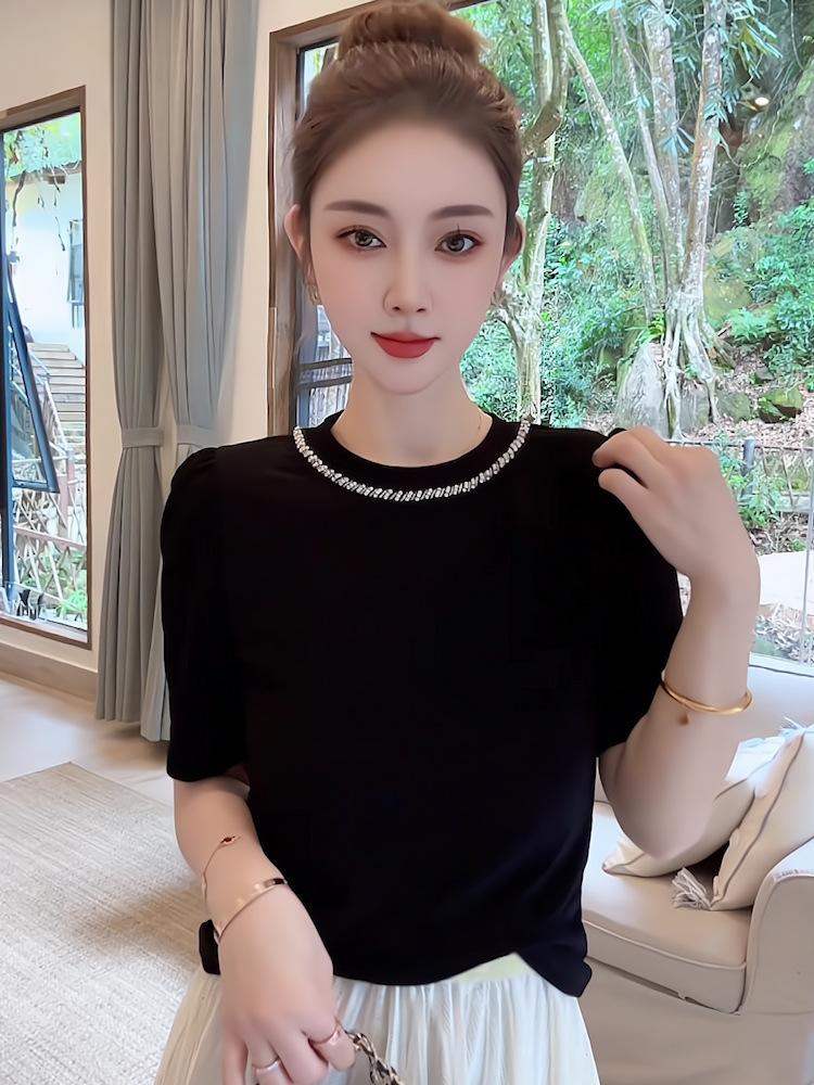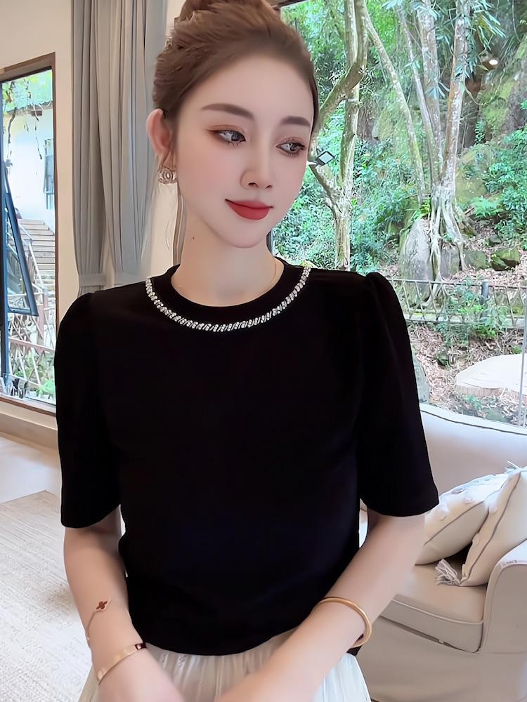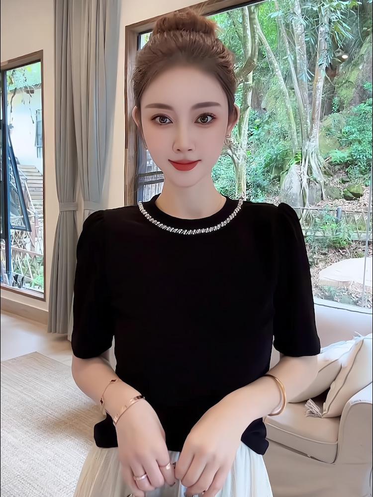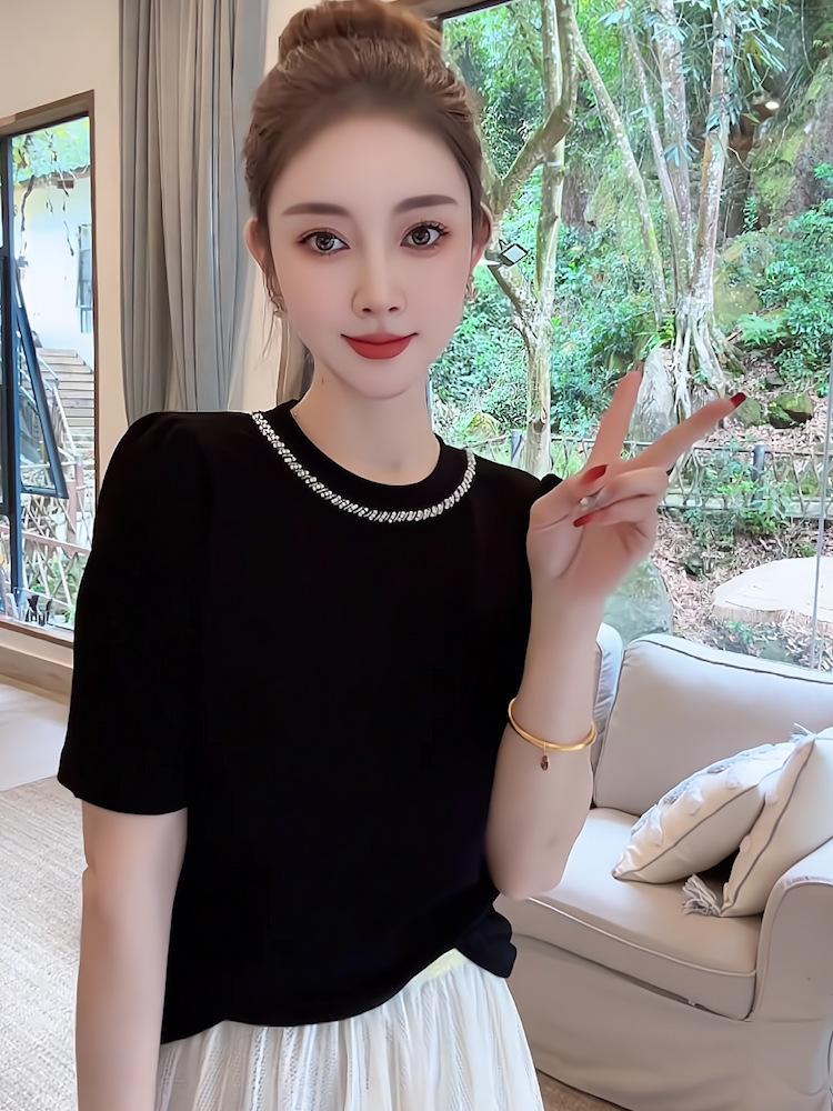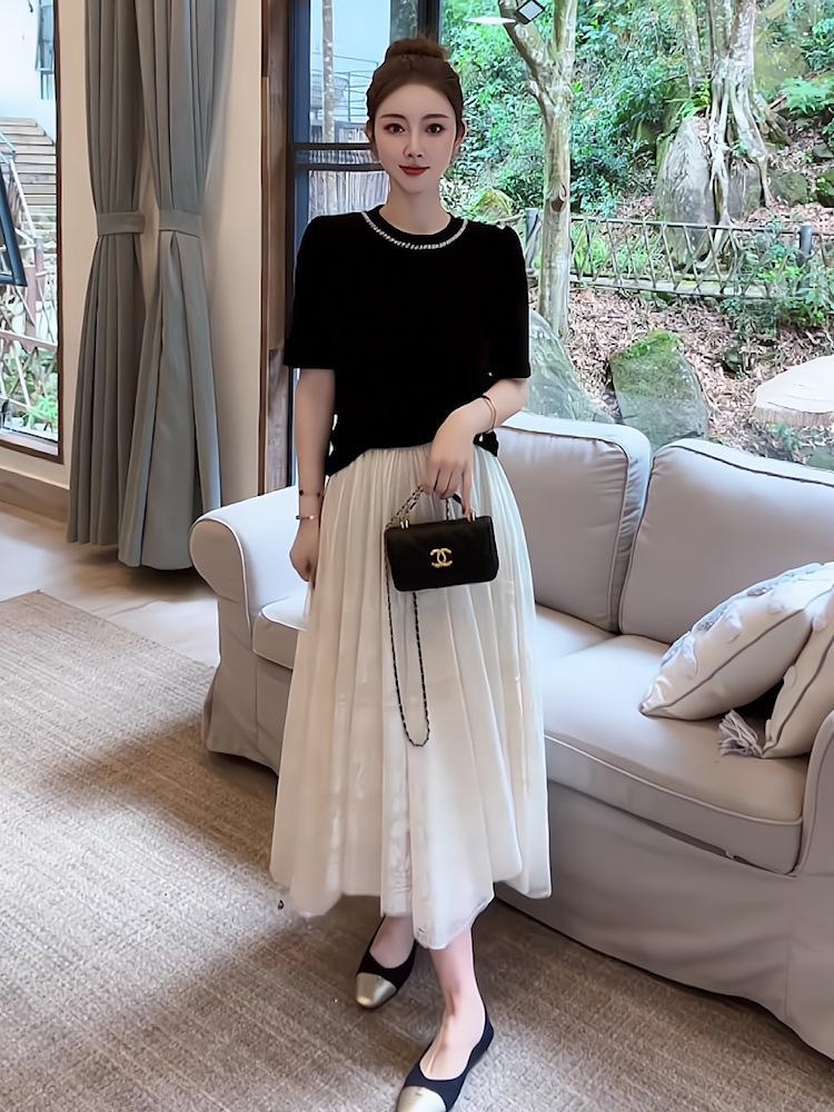 Falda de Moda Nicho Nuevo Suéter Negro de Cuello Redondo Top Corto Conjunto de Dos Piezas para Mujer