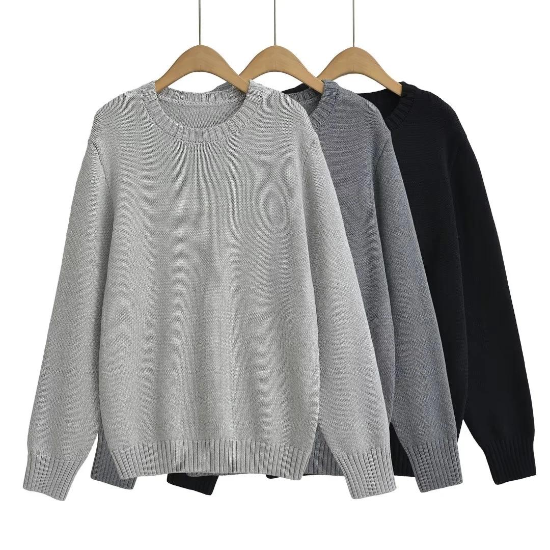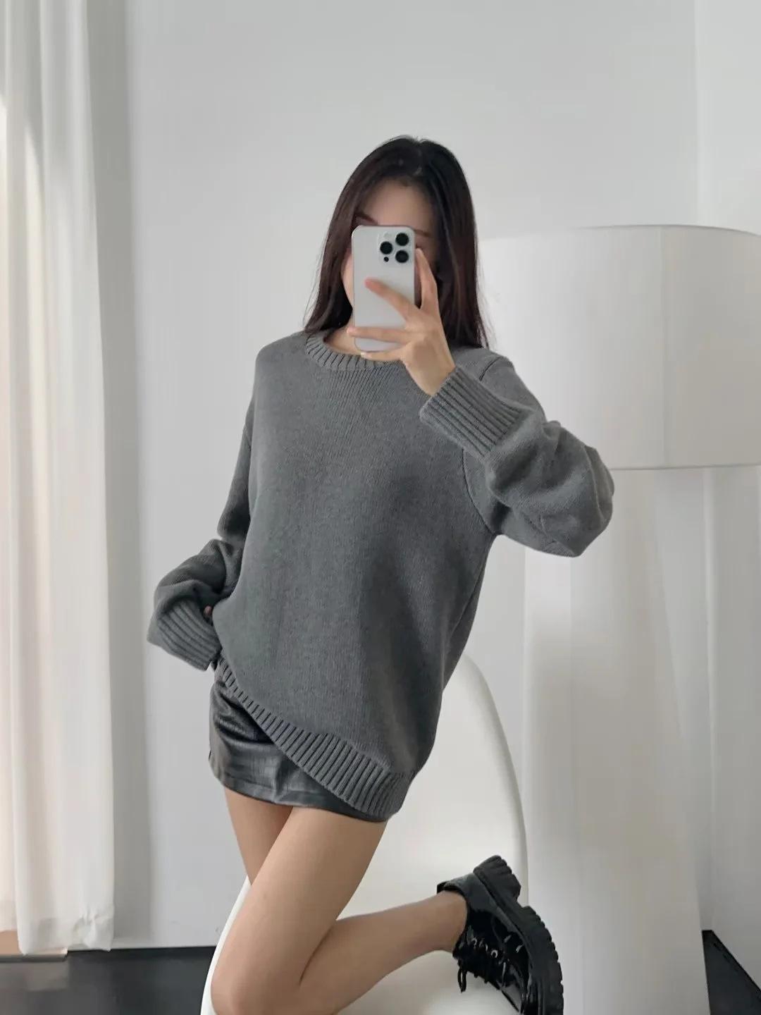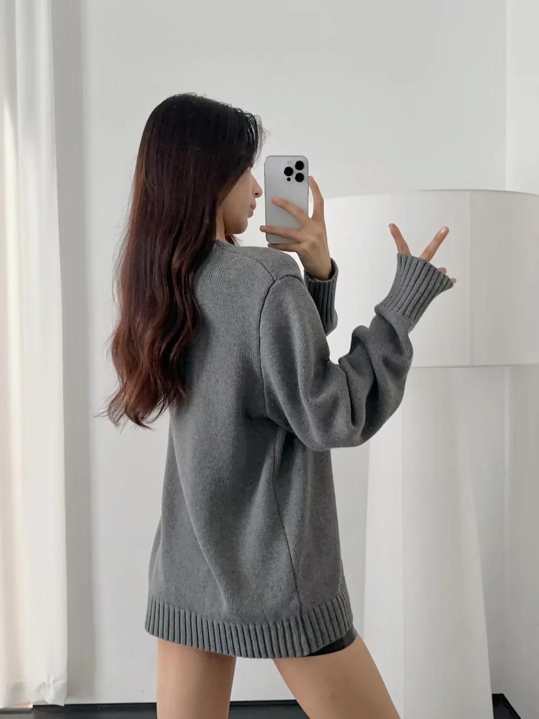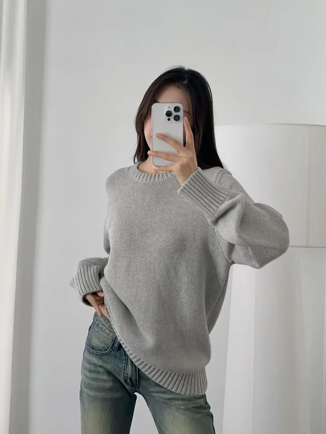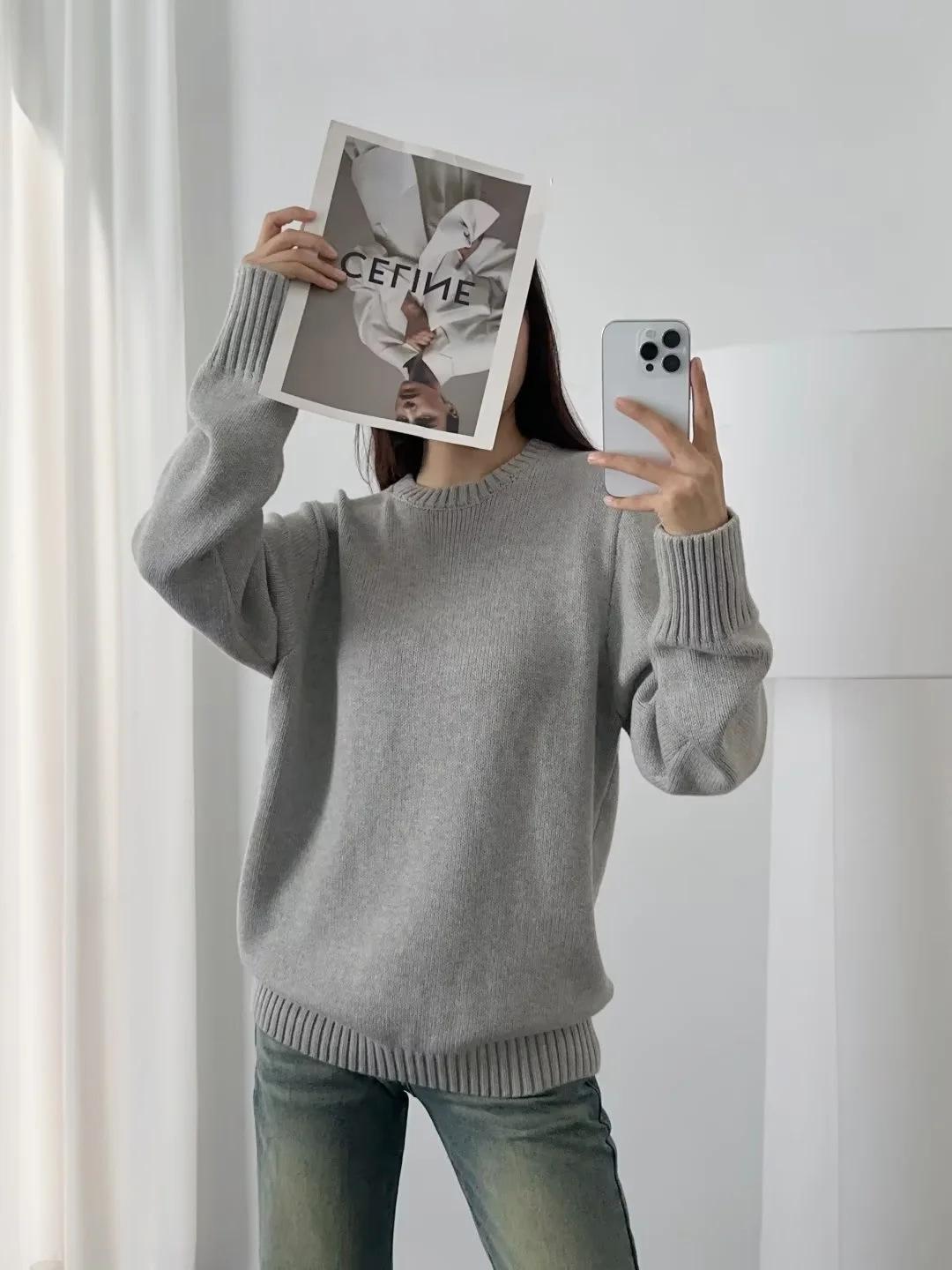 Suéter informal holgado de manga larga con cuello redondo y color liso para mujer, estilo perezoso, para otoño