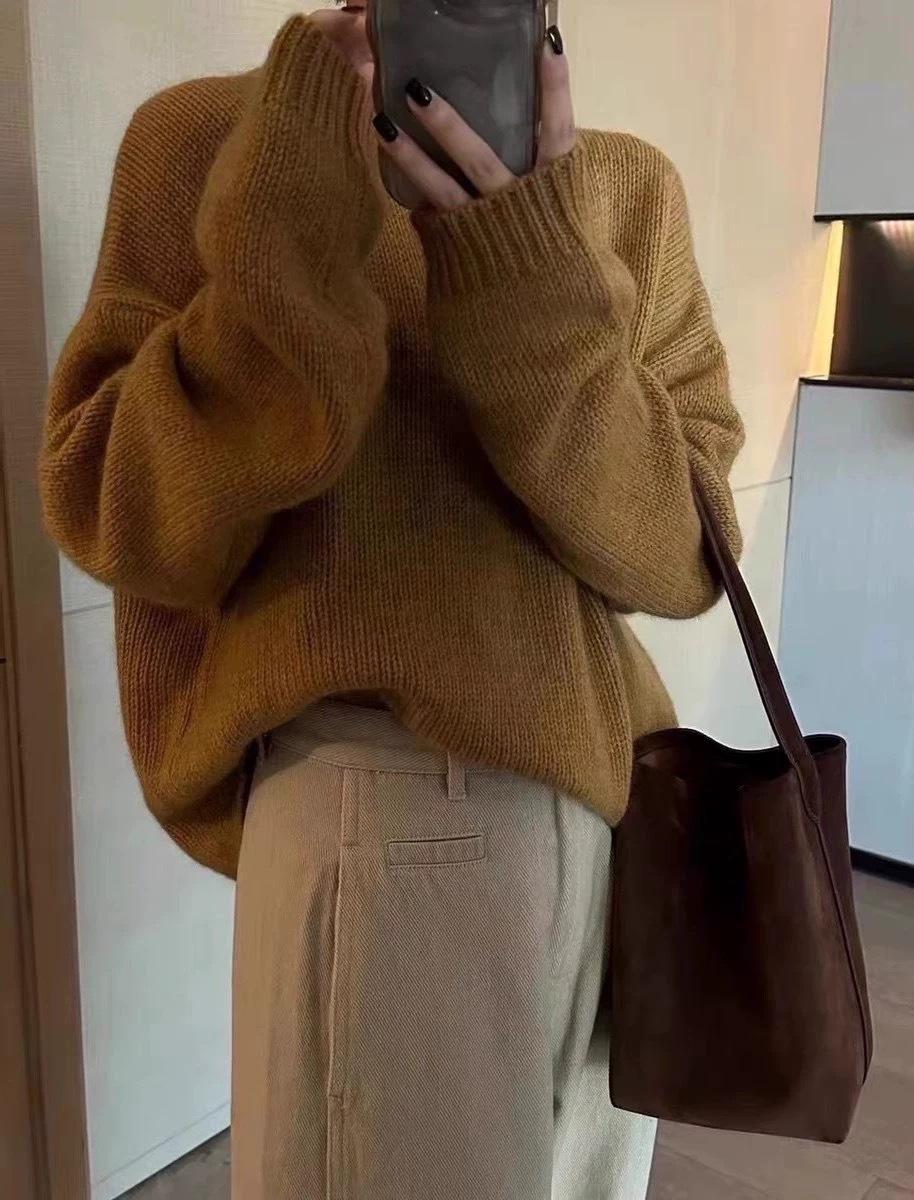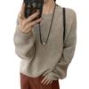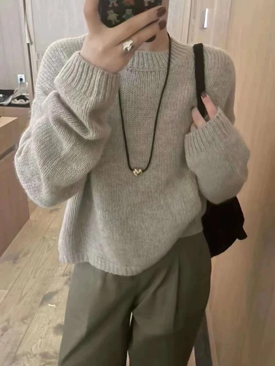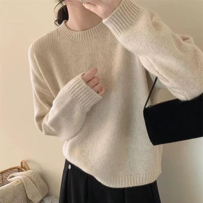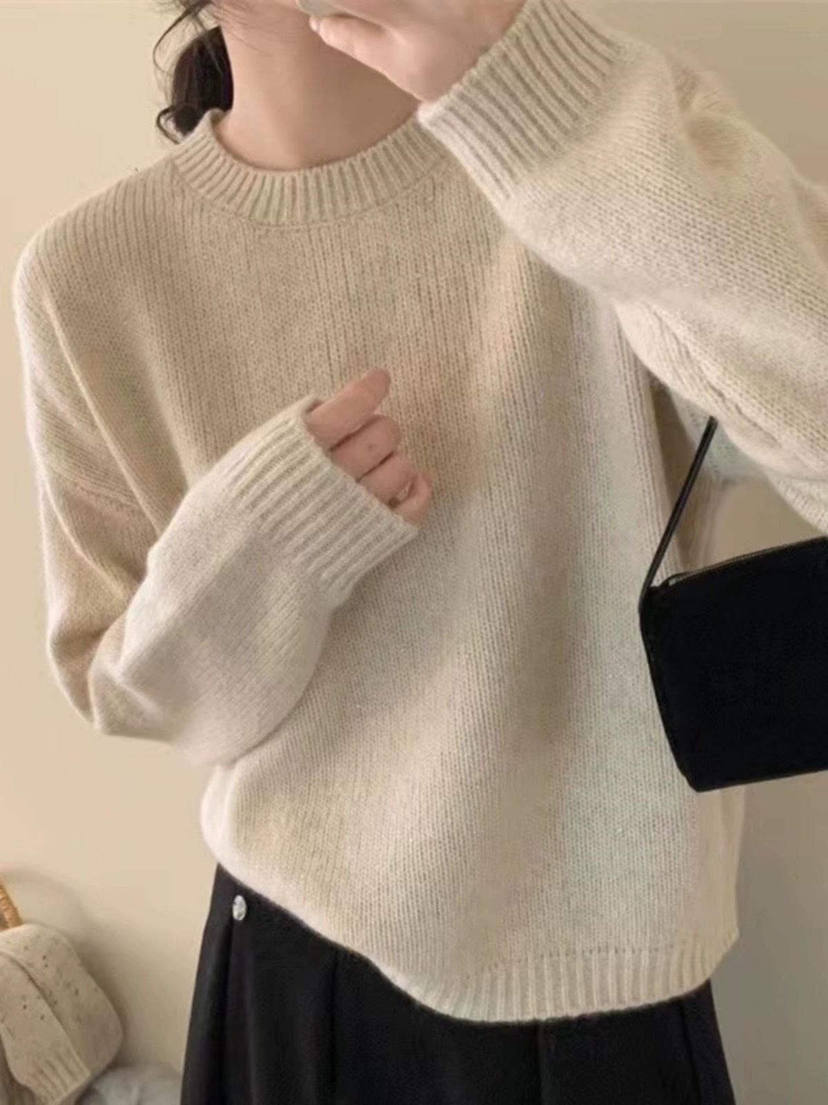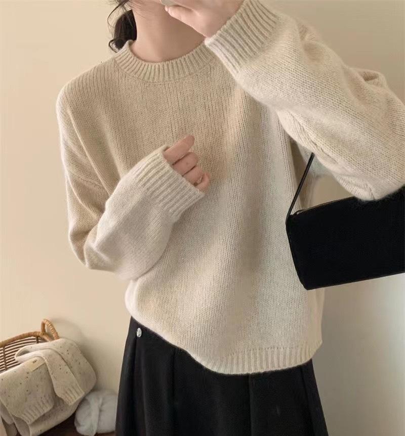 Suéter de cuello redondo para mujer, tejido de punto de lana pura, suelto, de color liso, manga larga, elegante, para ir al trabajo, combina con todo.