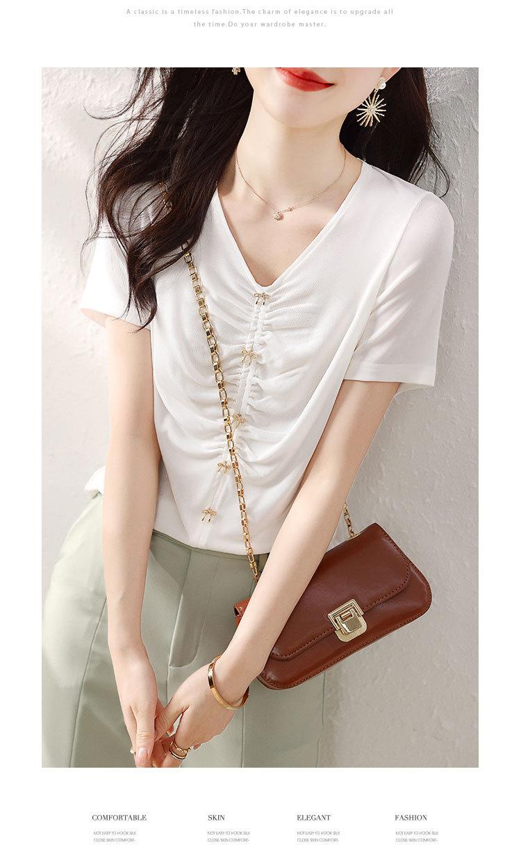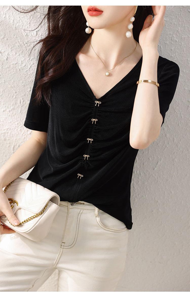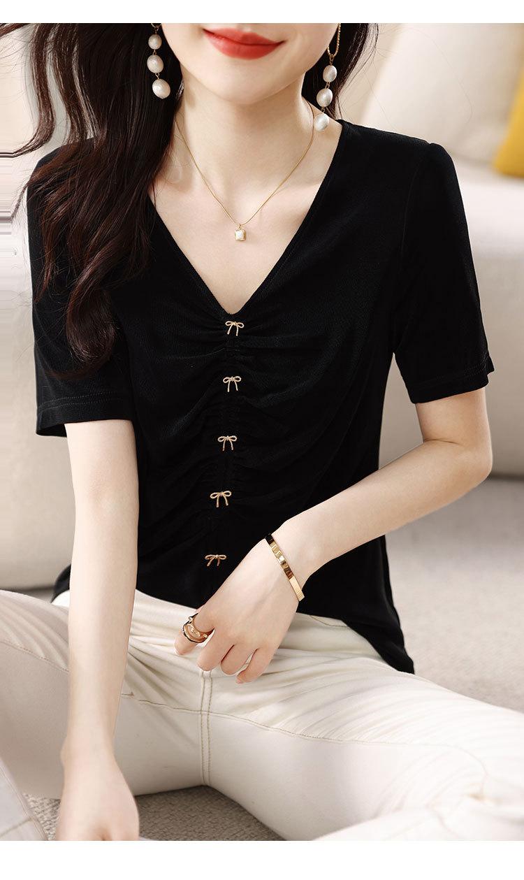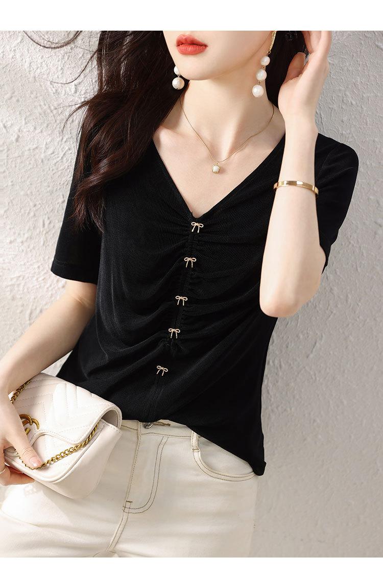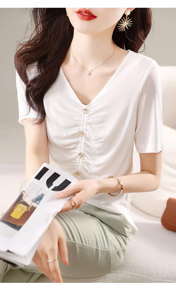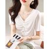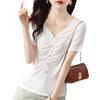 2025 Nuevo Verano Estilo Coreano Ropa de Trabajo Top, Exquisita Camiseta de Mujer de Manga Corta con Cuello en V de Aspecto Adelgazante Plisado