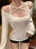 Top blanco puro deseo con hombros descubiertos para mujer, diseño otoñal, encaje calado, sexy, estilo Spice Girl, camiseta ajustada de manga larga